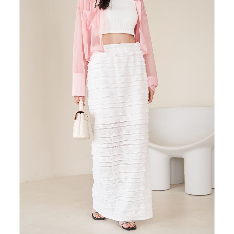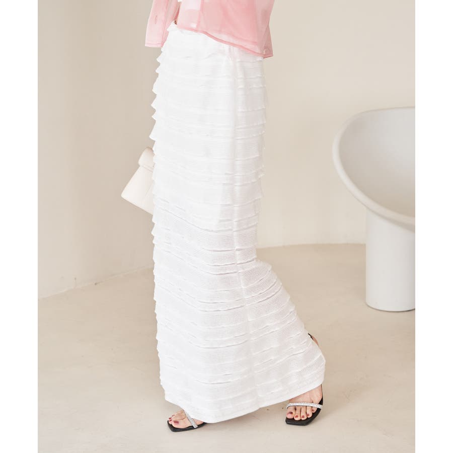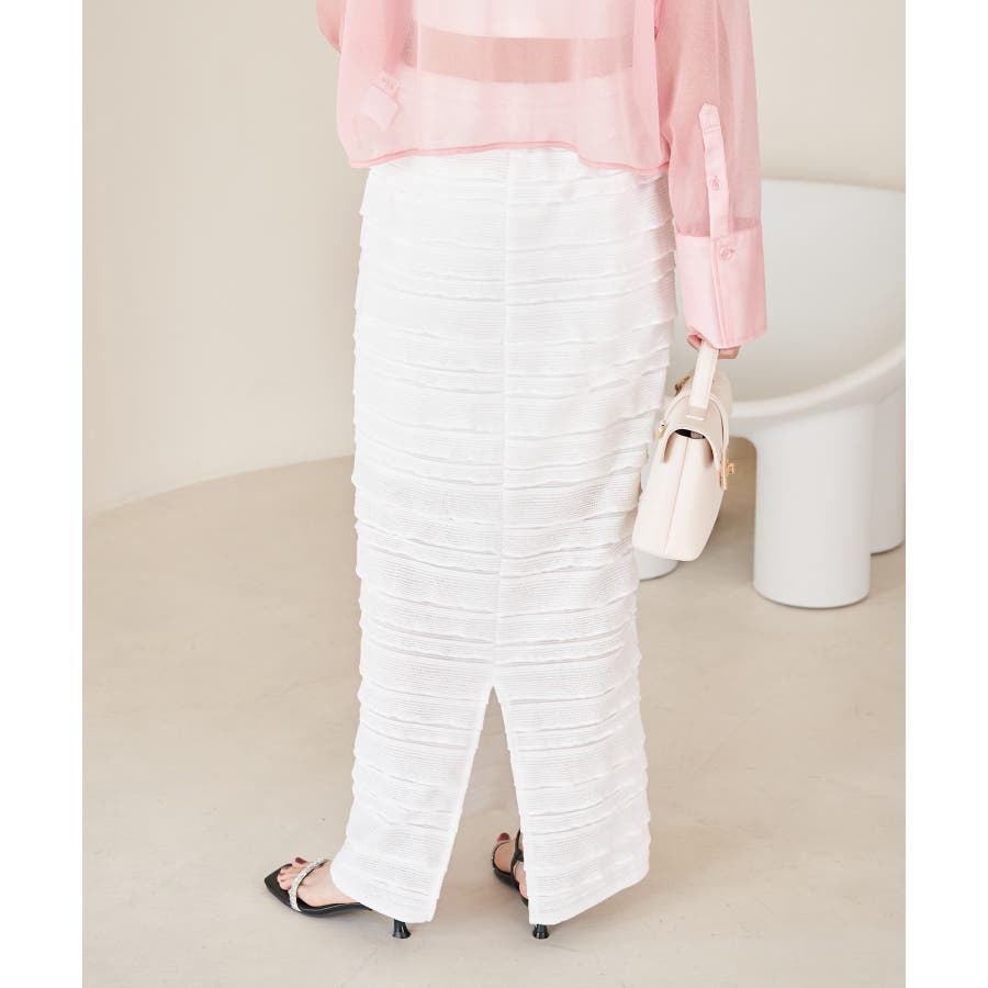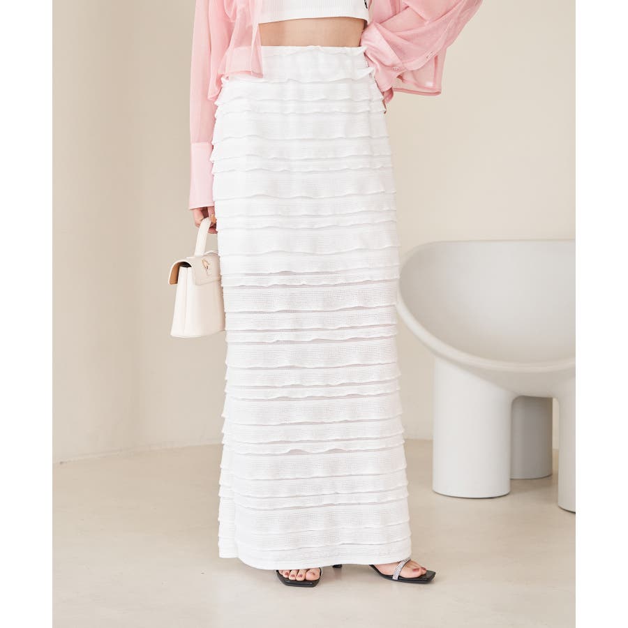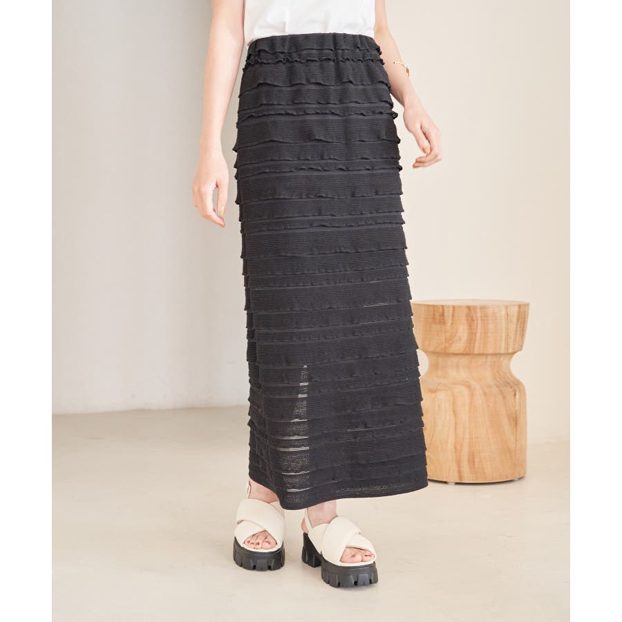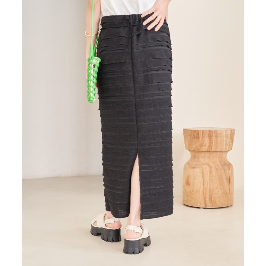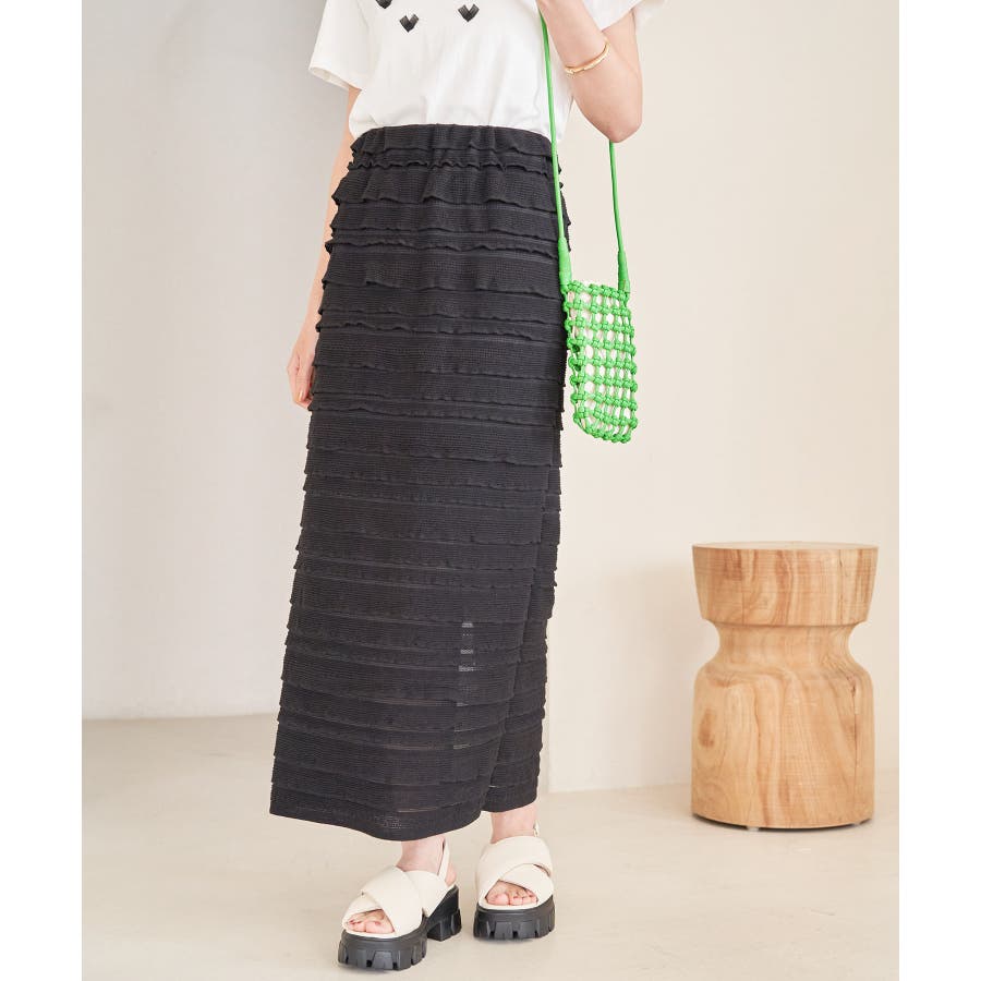 ◆2024春夏◆ 【デザイン・シルエット】 カット素材のフリルディテールIラインスカート。 高身長・低身長の方どちらが着ても同じ丈感、サイズ感に見えるようにシルエットに拘ったスカート。