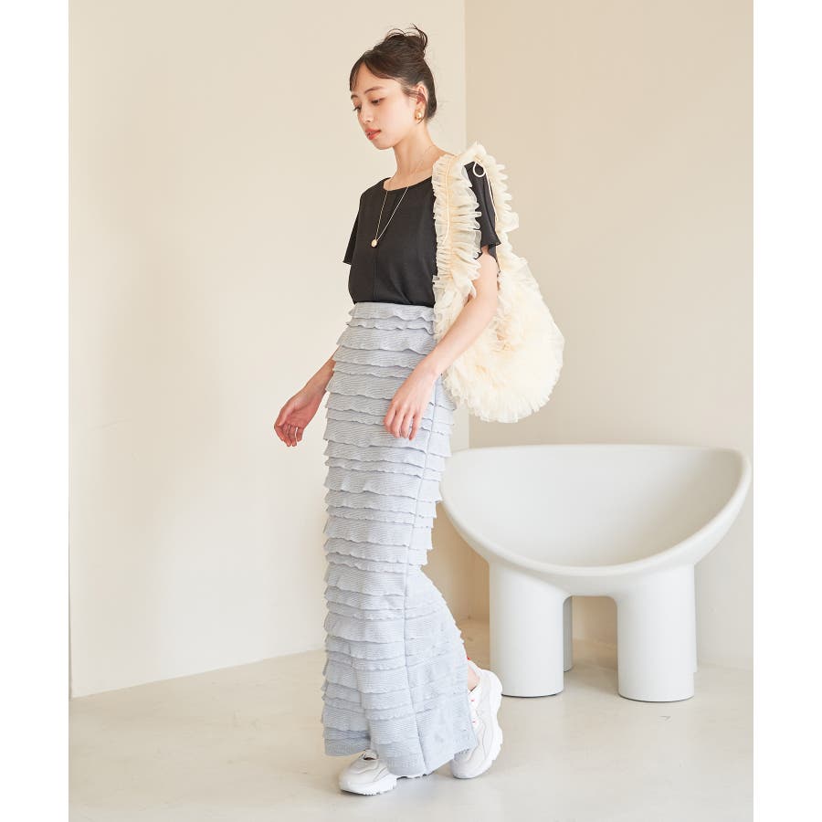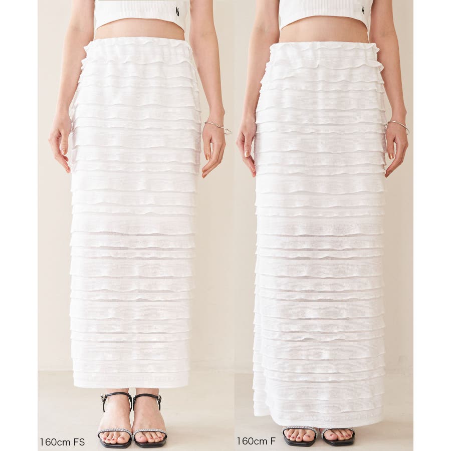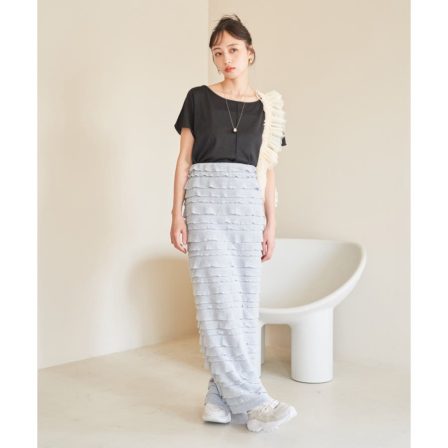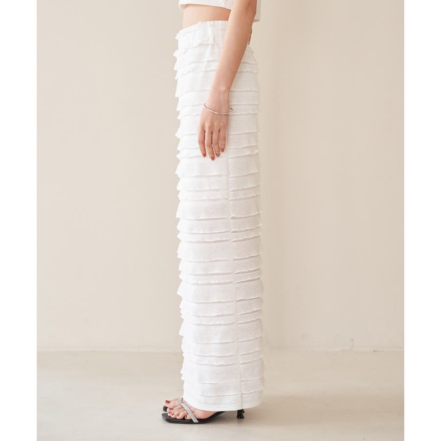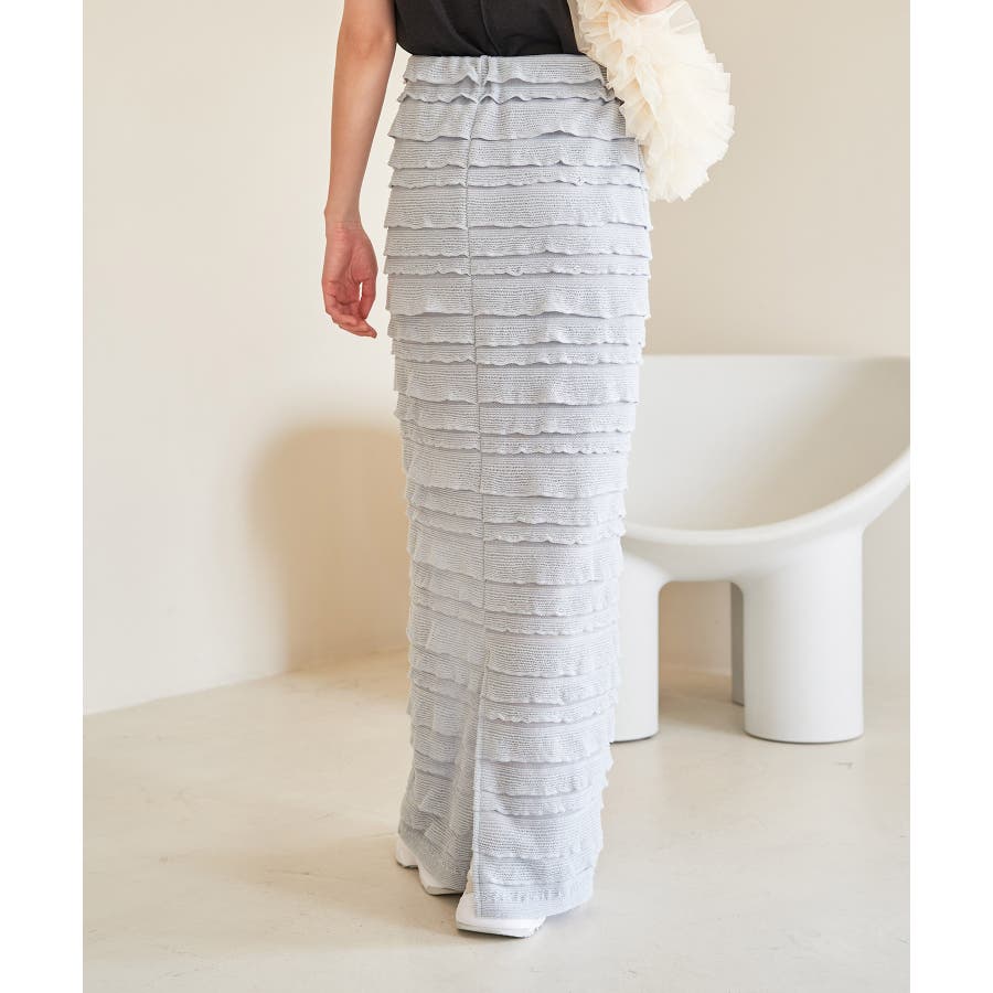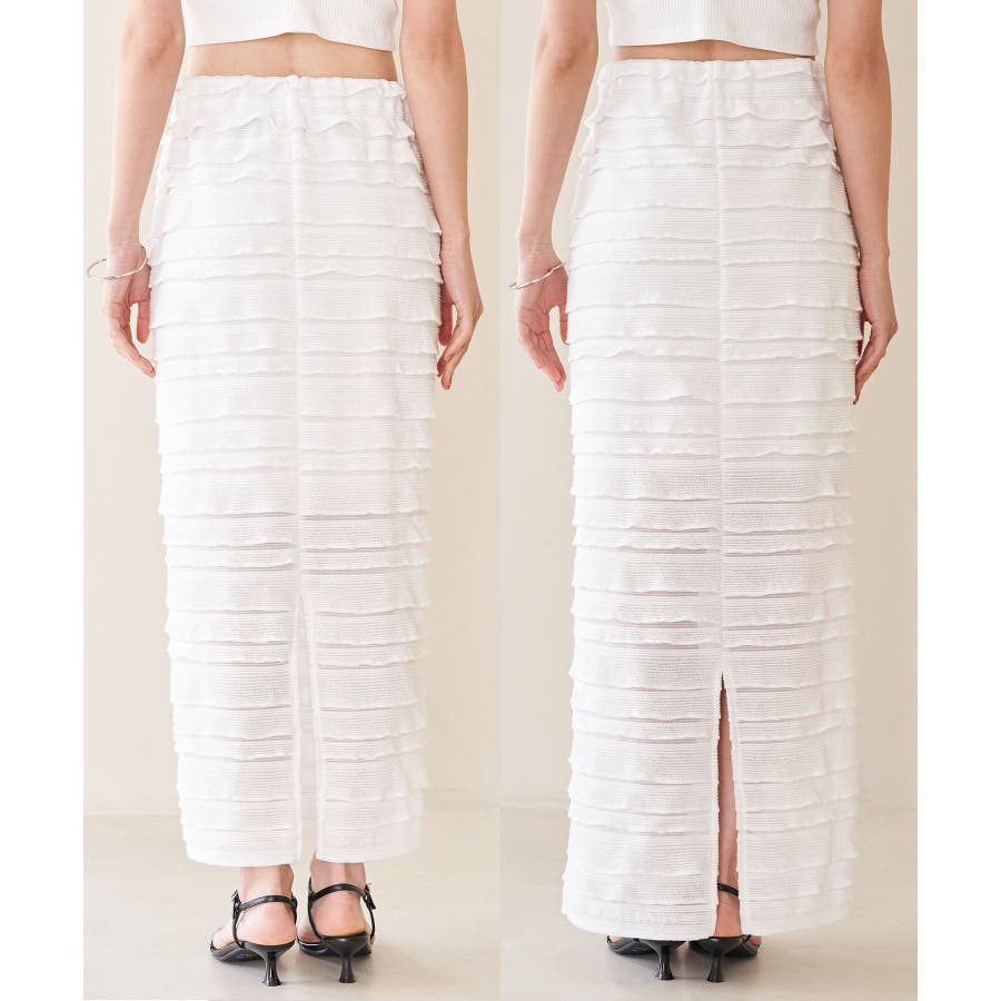 ◆2024春夏◆ 【デザイン・シルエット】 カット素材のフリルディテールIラインスカート。 高身長・低身長の方どちらが着ても同じ丈感、サイズ感に見えるようにシルエットに拘ったスカート。
