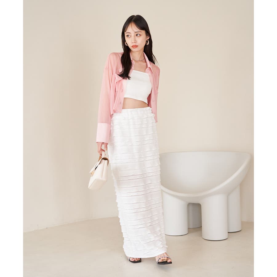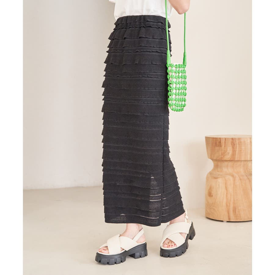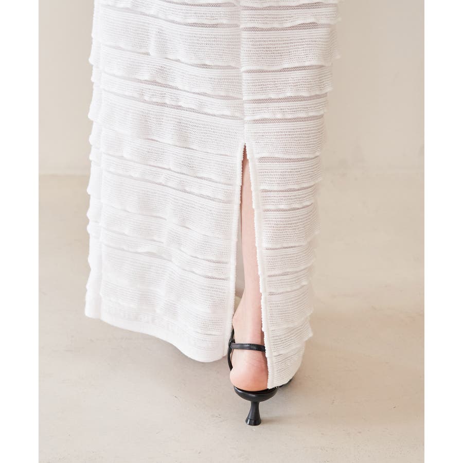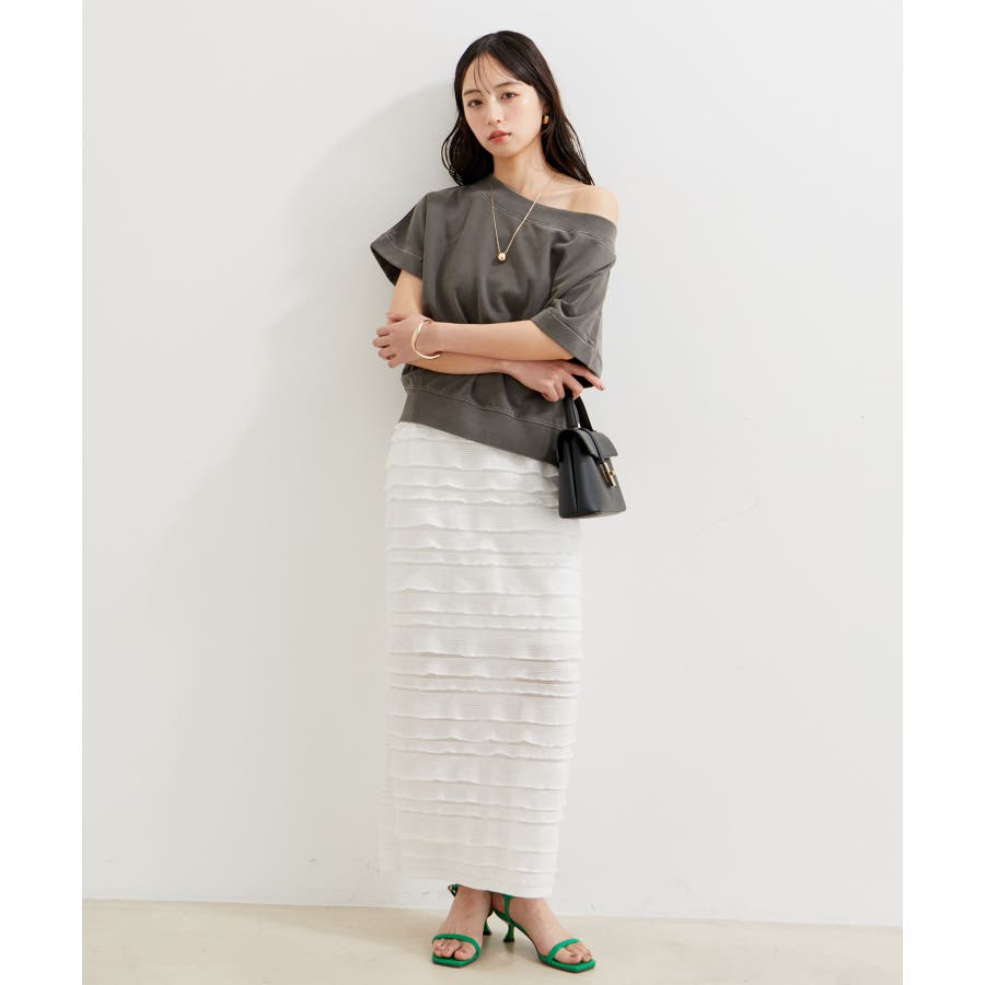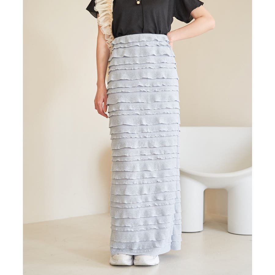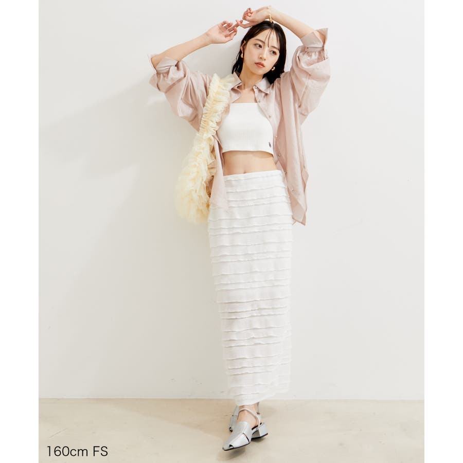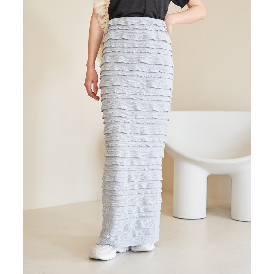 ◆2024春夏◆ 【デザイン・シルエット】 カット素材のフリルディテールIラインスカート。 高身長・低身長の方どちらが着ても同じ丈感、サイズ感に見えるようにシルエットに拘ったスカート。