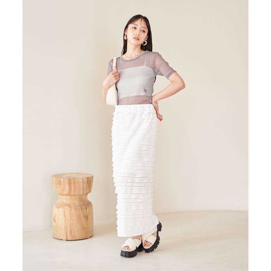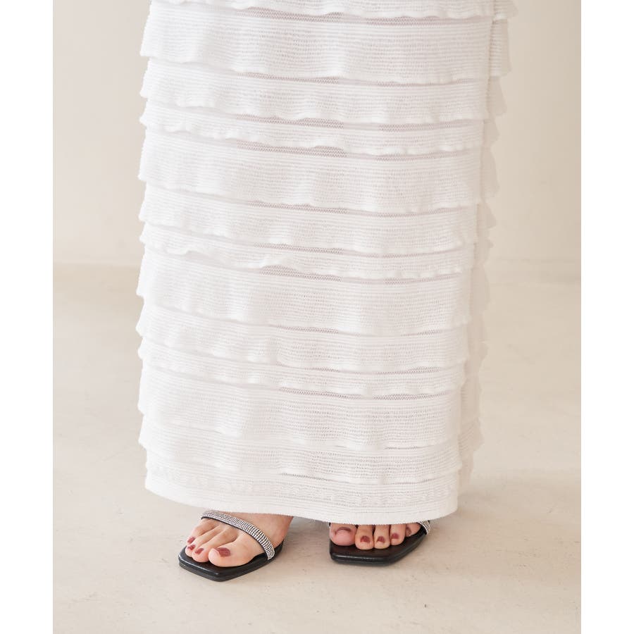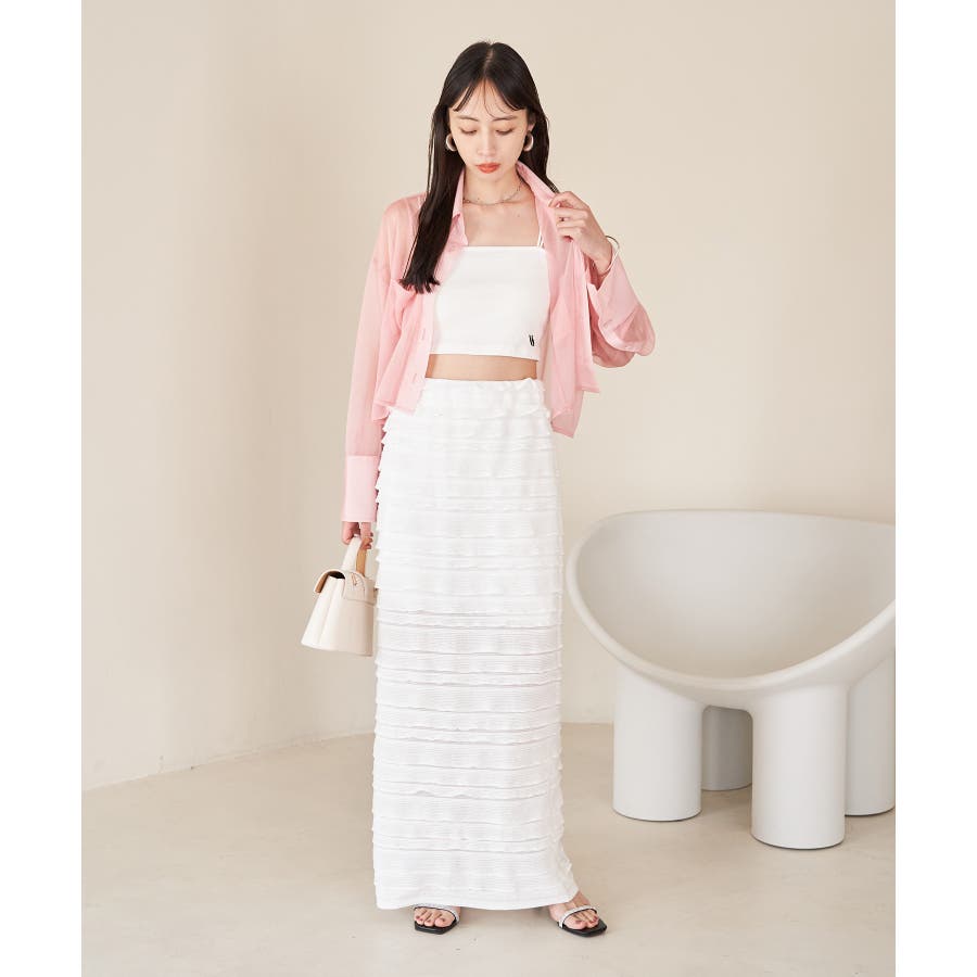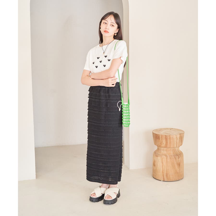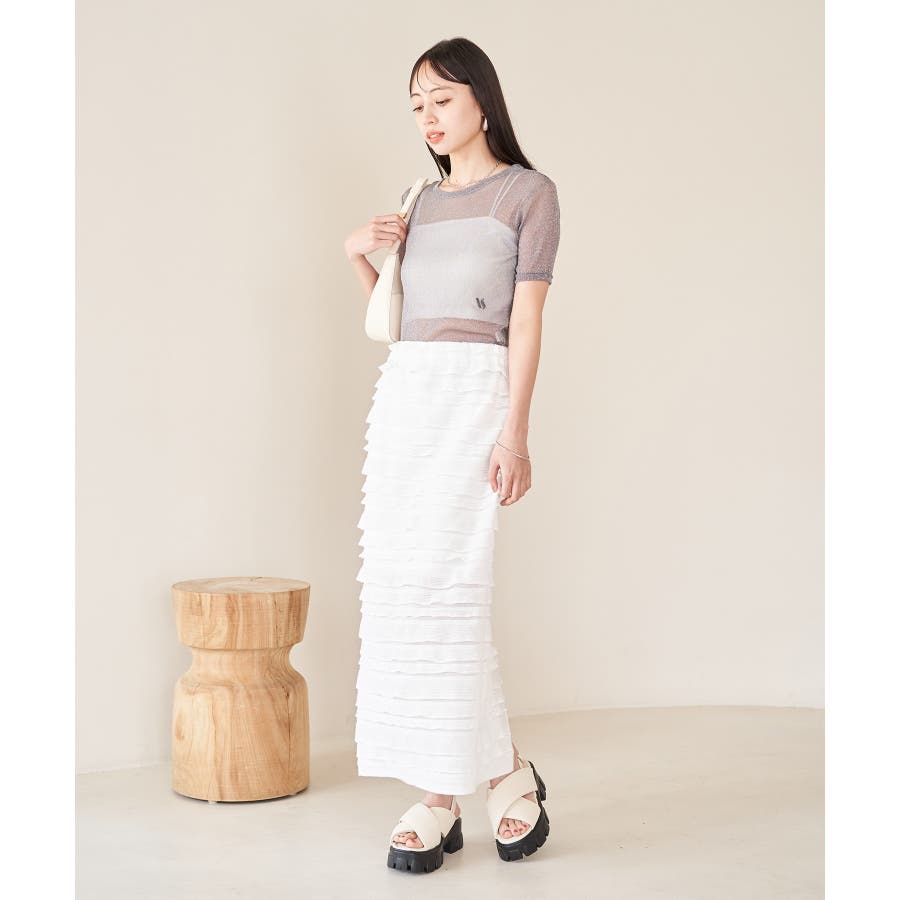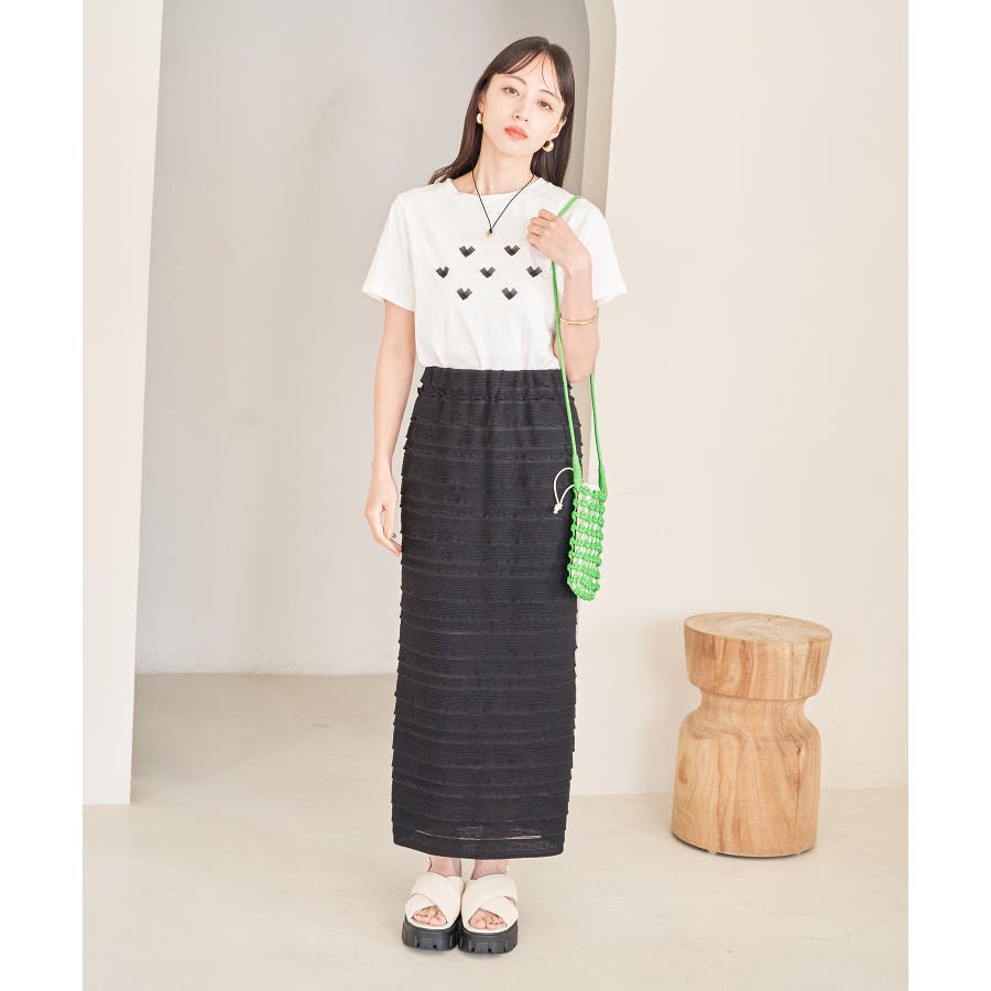 ◆2024春夏◆ 【デザイン・シルエット】 カット素材のフリルディテールIラインスカート。 高身長・低身長の方どちらが着ても同じ丈感、サイズ感に見えるようにシルエットに拘ったスカート。