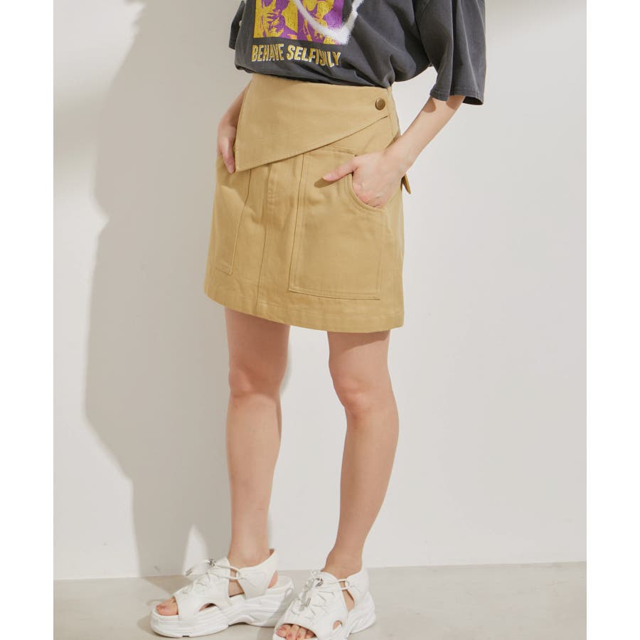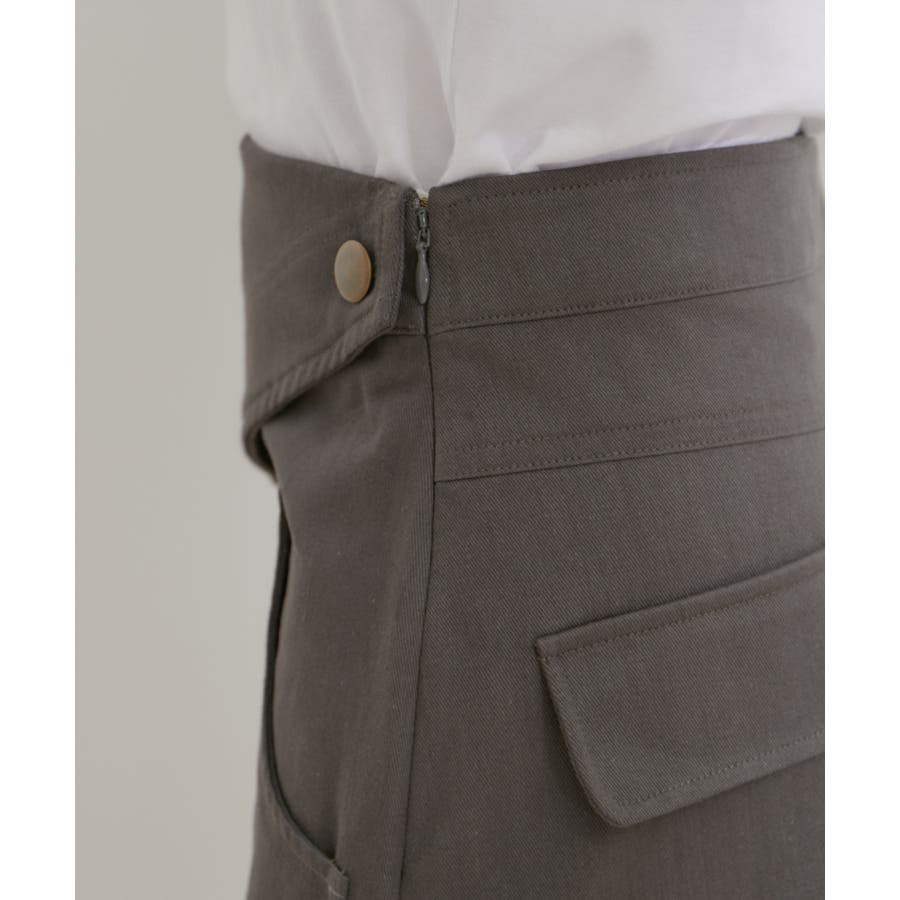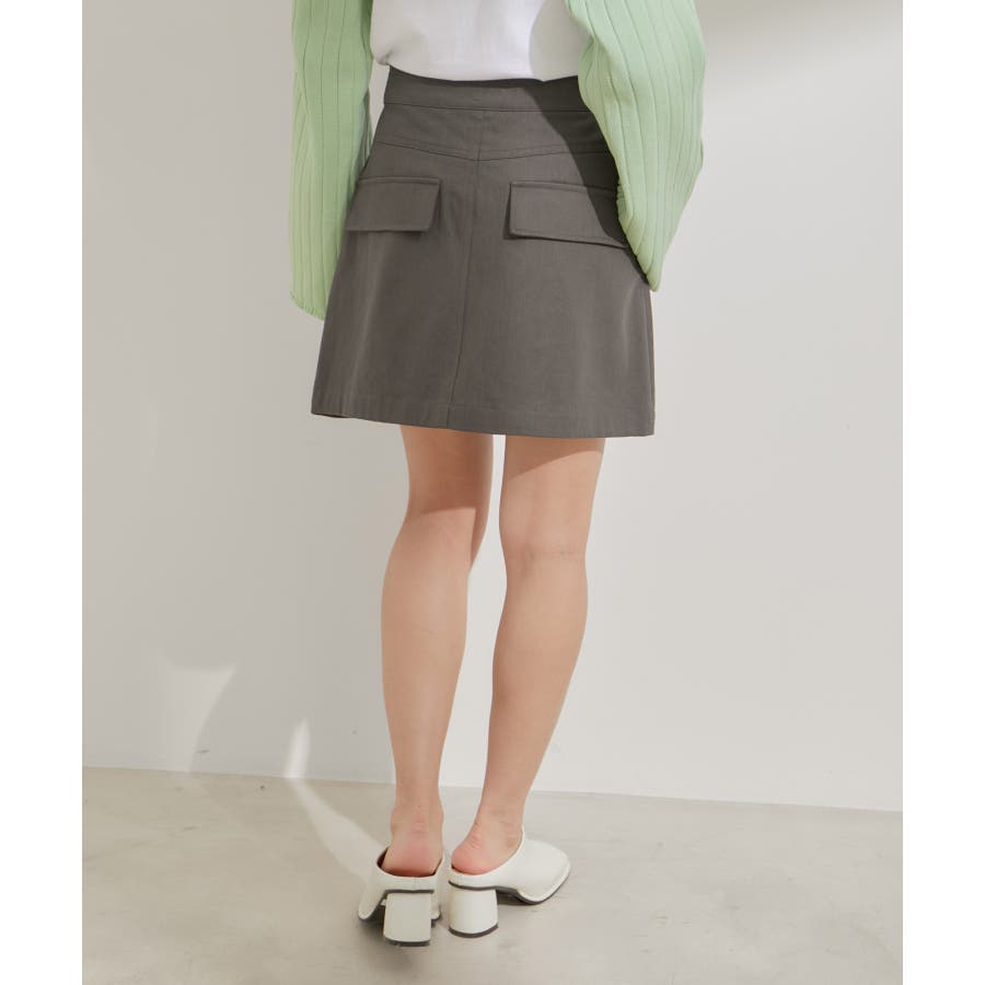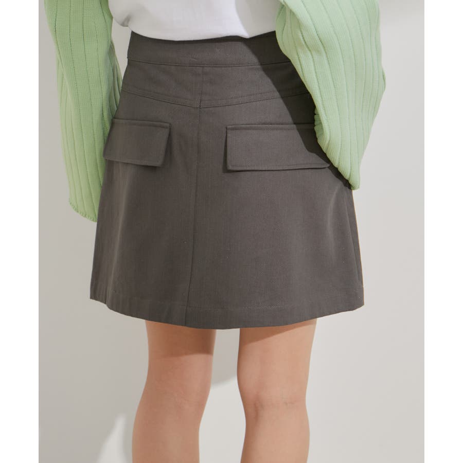 フラップ付きのビッグパッチポケット台形ミニスカート。