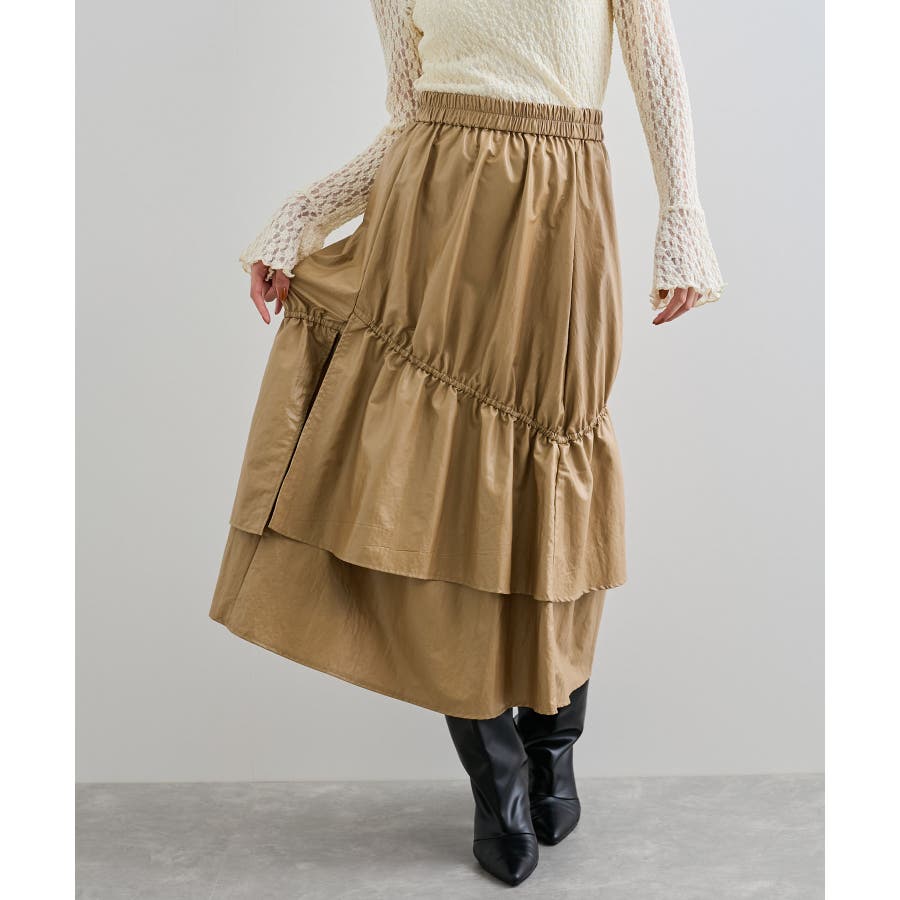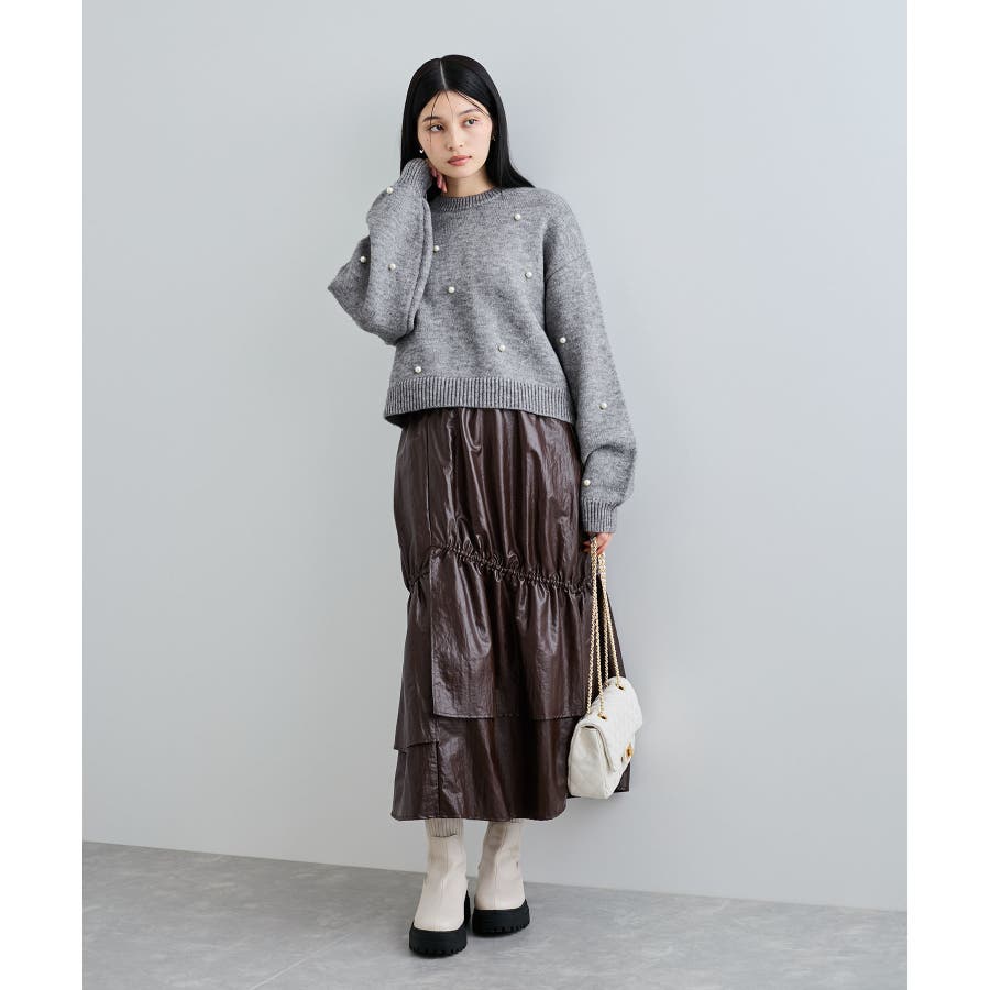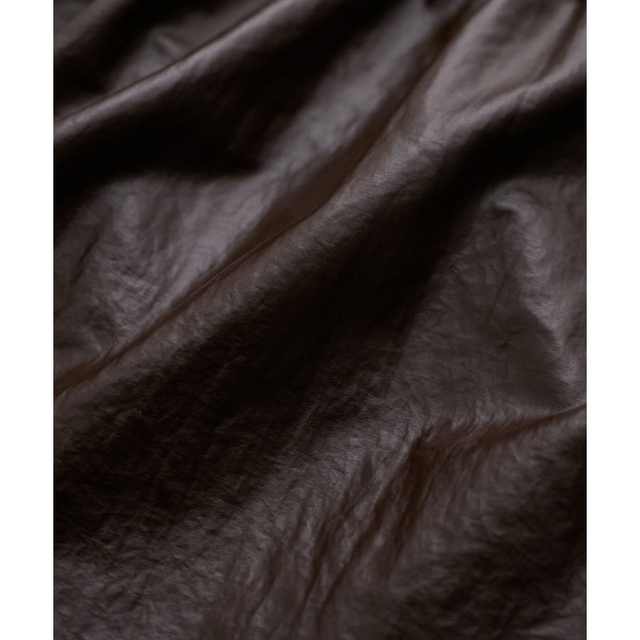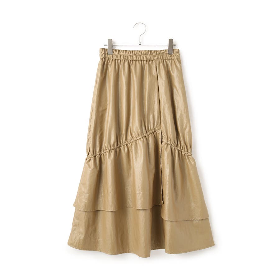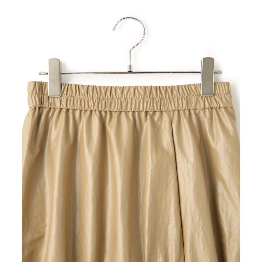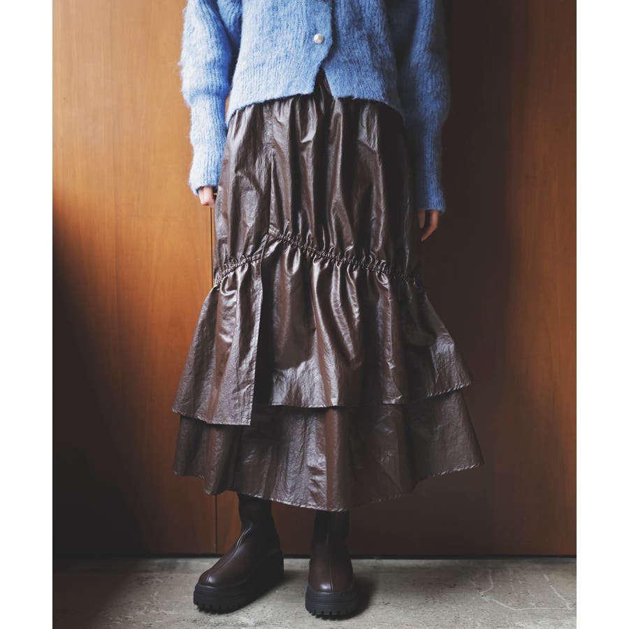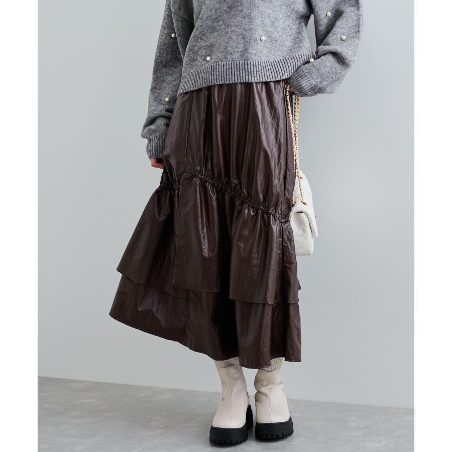 ◆2024-25秋冬◆ 【デザイン・シルエット】 艶加工をほどこしたギャザースカート。 ニットのスタイリングを引き立たせてくれる素材と艶感は今シーズンの一押し素材です。 ウエストがゴムでリラック感を兼ね備えているので、オンオフどちらでもデイリーに活躍するアイテムです。 【素材】 チンツ加工という生地に光沢感が出る加工を施し、レザーライクな印象にみせてくれる素材を使用しています。 【カラー】 幅広く合わせやすいダークブラウン、ベージュの2色展開です。 【おすすめのスタイリング】 スウェットやゆったりしたシルエットのトップスとの相性が抜群です。 素材に特徴があるので、シンプルなトップスを引き立たせてくれます。 ----------------------------- 裏地:なし 光沢感:あり 透け感:なし 伸縮性:なし ウエスト:ゴム ファスナー:なし ポケット:なし 生地の厚さ:普通 季節:春、秋、冬 ----------------------------- 【モデル着用サイズ】 ベージュ着用モデル身長:168cm、着用サイズ:F ダークブラウンモデル身長:164cm、着用サイズ:F (画像2枚目~モデル身長164cm) ※画像の商品はサンプルです。 実際の商品と仕様、加工、サイズが若干異なる場合がございます。 ※画像によっては実際の色味と異なる場合があります。正しい色味は生地アップ画像をご確認ください。