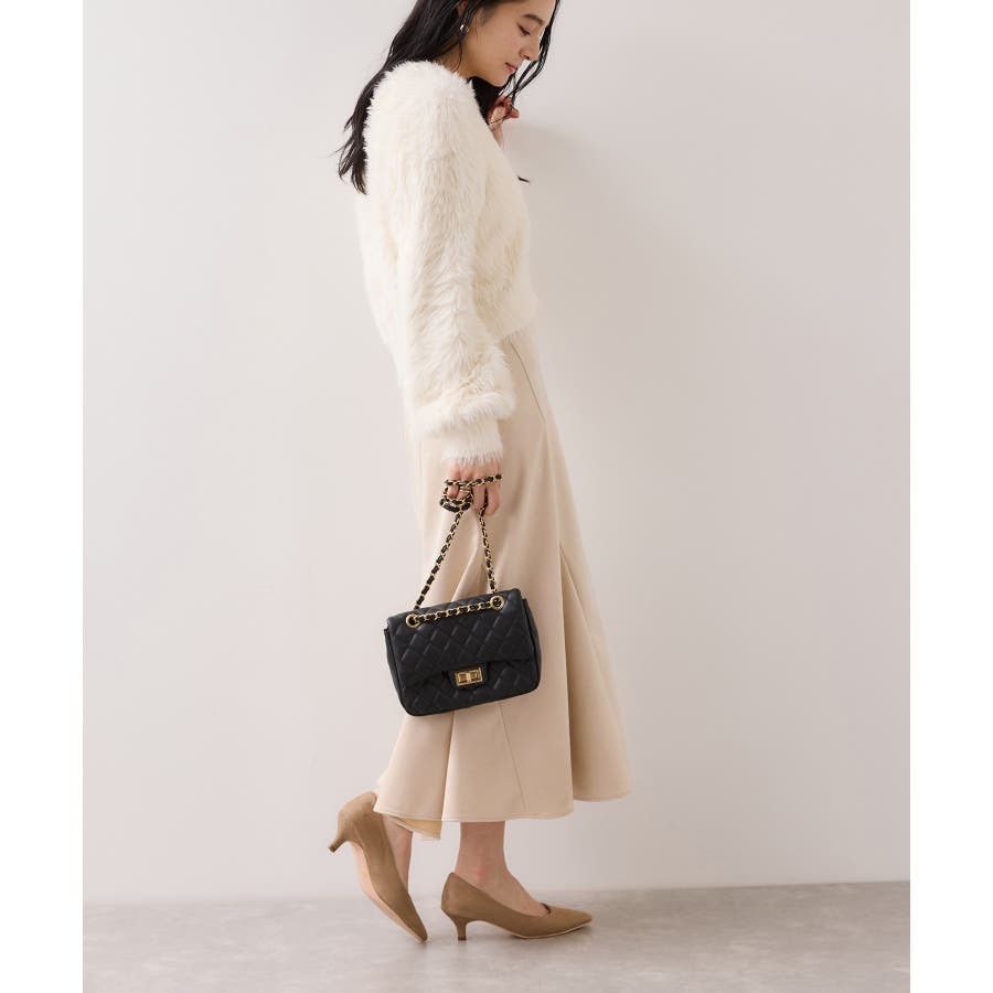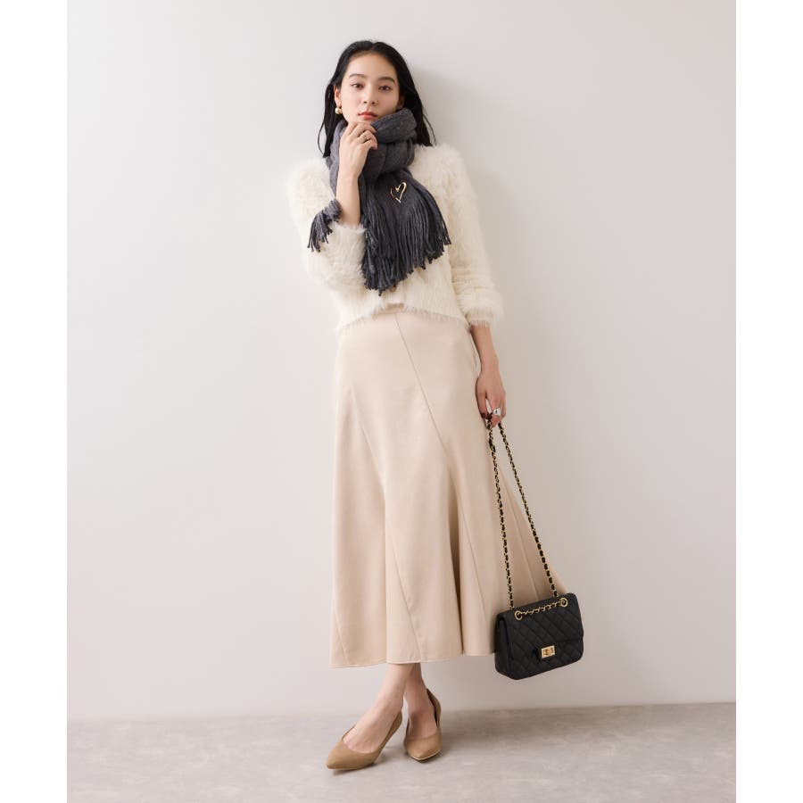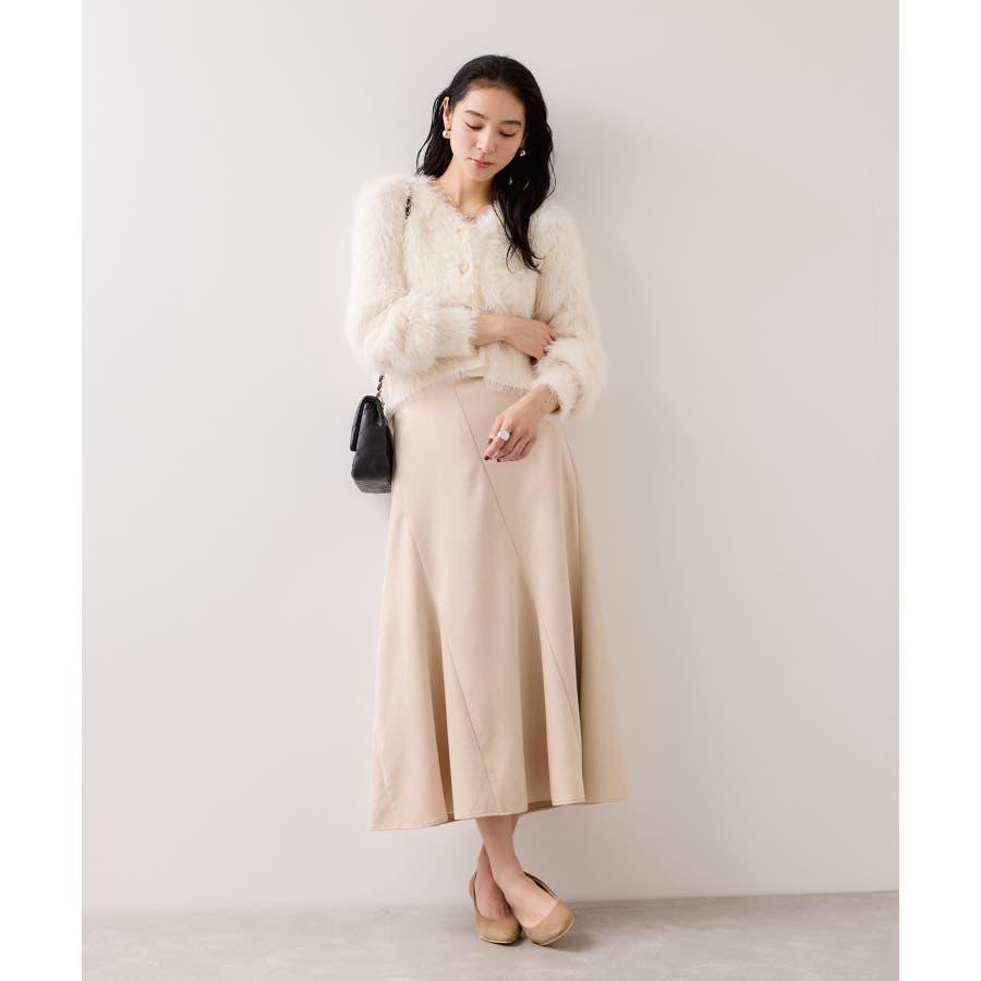 毛足のあるニットを合わせてシーズンらしい装いがおすすめ!オフホワイトはキレイ目、キャメルはカジュアルでカラーによってもスタイリングの印象が変わります。VIS定番のラビットタッチカーデ(品番:BVK45100)との相性◎