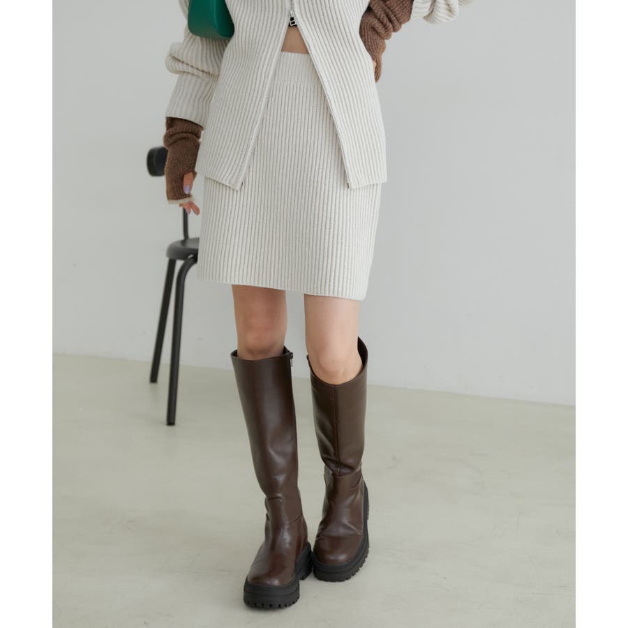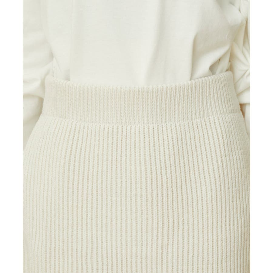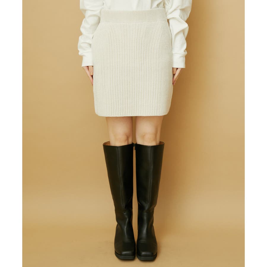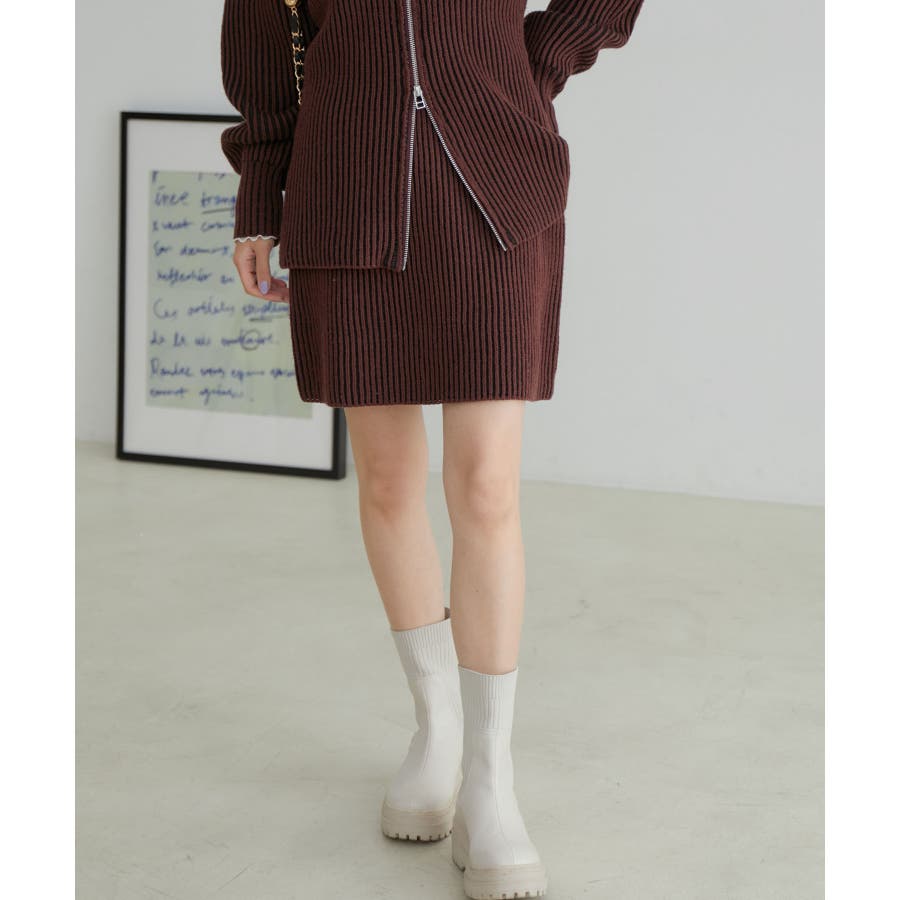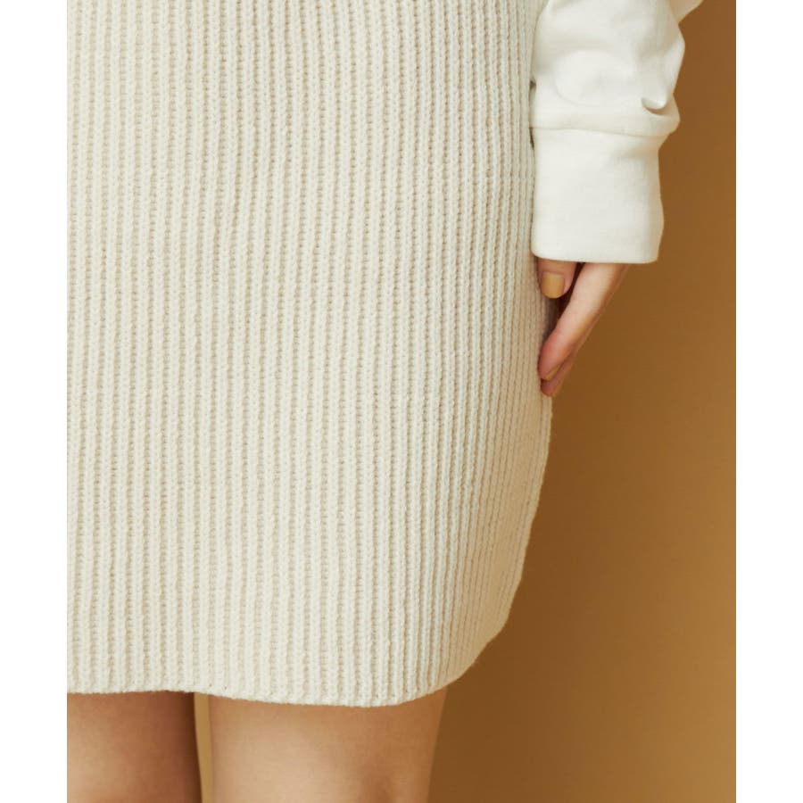 【デザイン・シルエット】 配色の畦編みがポイントのシンプルな台形ミニ丈ニットスカートです。