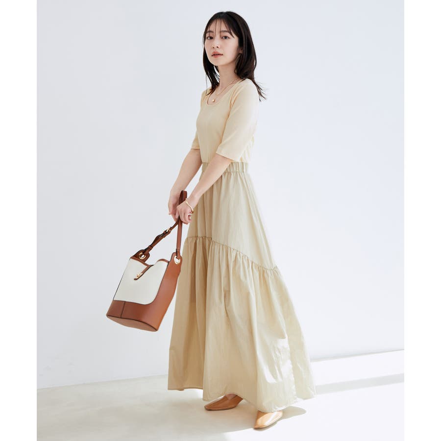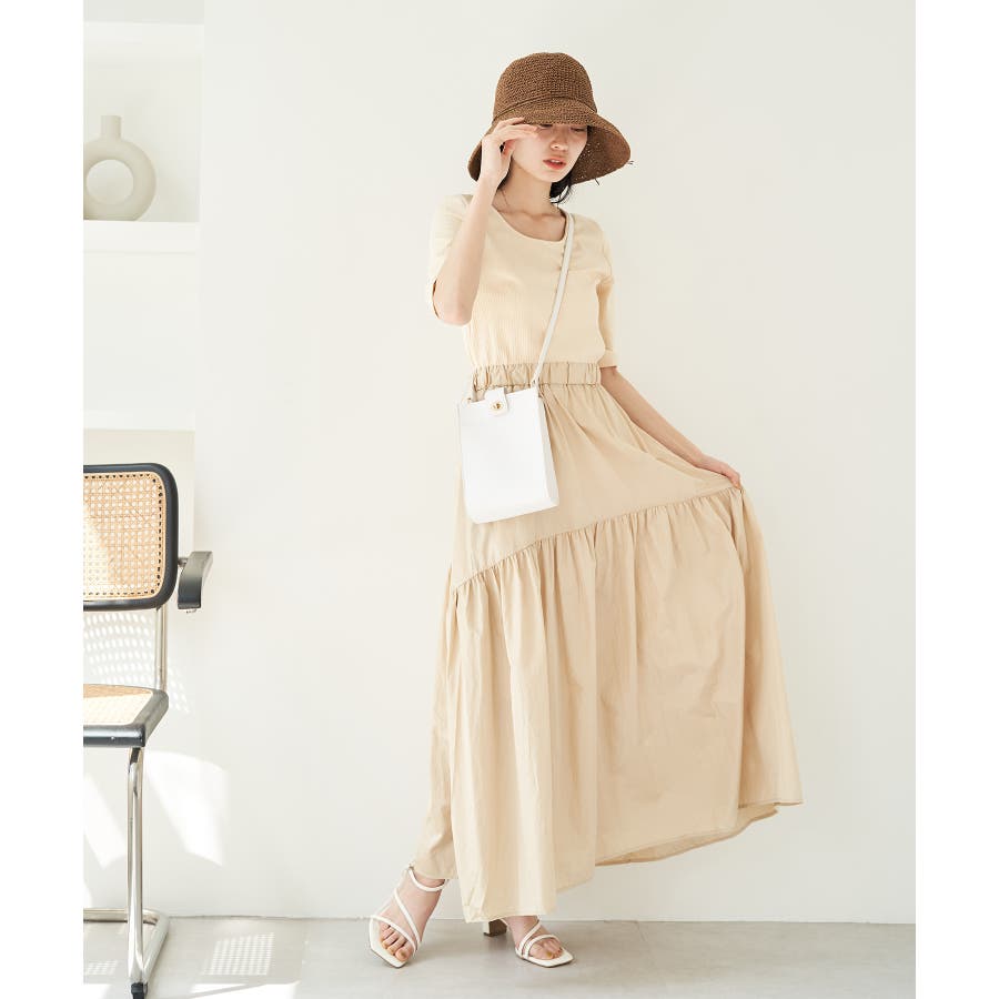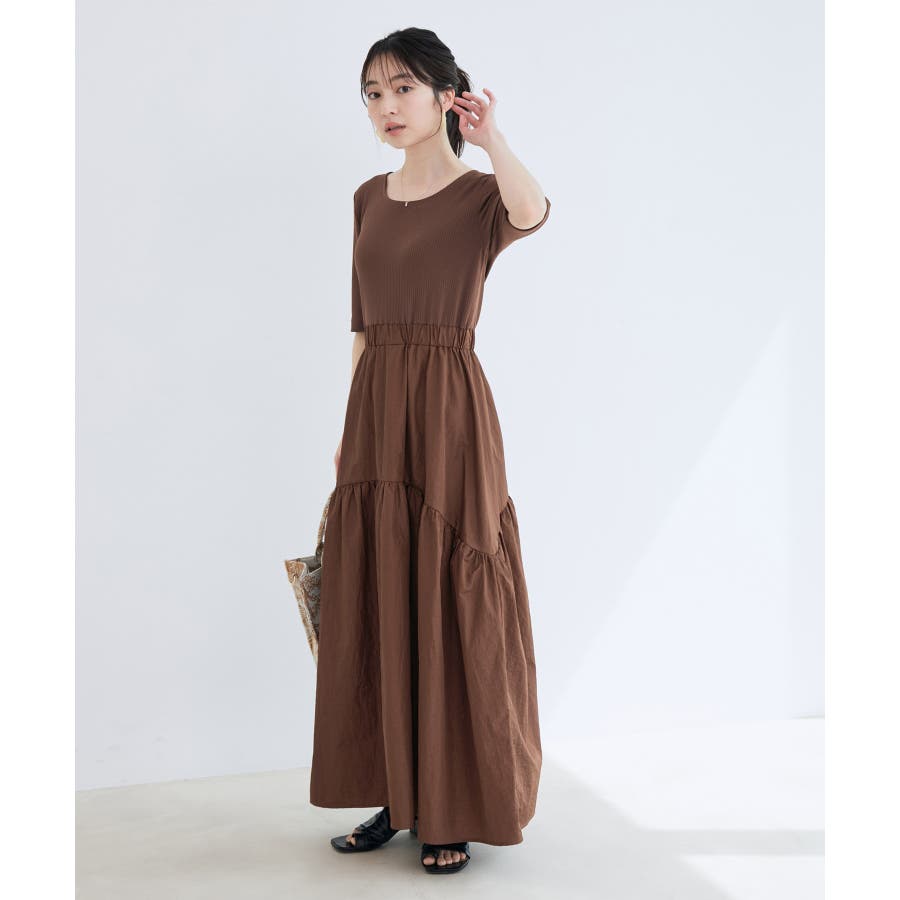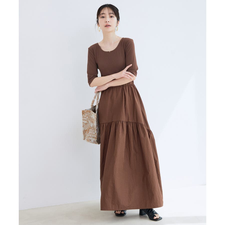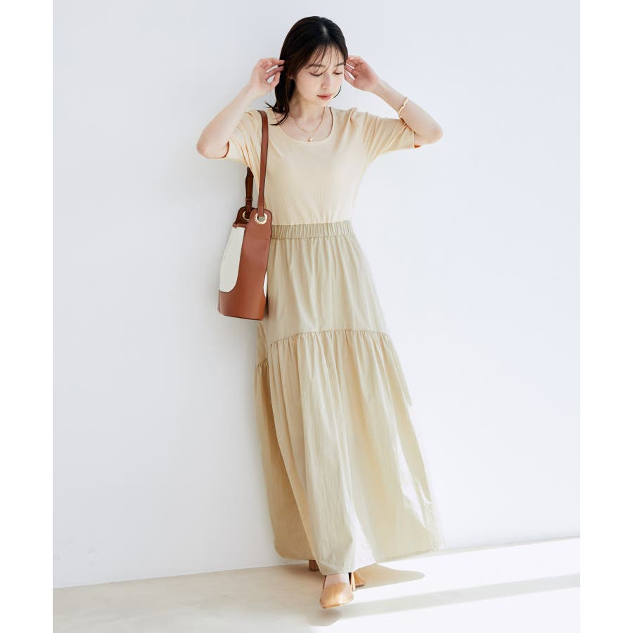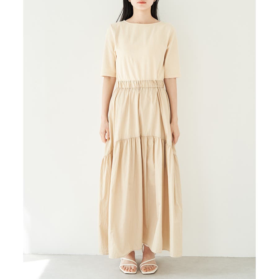 【デザイン・シルエット】 トップスはカットソーでスカート部分が布帛の異素材ドッキングのワンピース。 セットアップで着ている様に見える、忙しい日々にもってこいな「これだけで決まる」アイテムとなっております。 またスタイルがさらに良く見える様にシルエットにもこだわりました。 ウエストの設定位置を少し高めに設定しているので脚長効果があります。 【素材】 柔らかなカットソー地×程よくハリのある布帛の異素材ドッキング。 【カラー】 ナチュラルで大人なブラック・ブラウン・ベージュの3色展開。 【おすすめのスタイリング】 1枚でお洒落な着こなしになります◎ シンプルなのでアクセサリーや小物でカラーを入れてアクセントにするのがおすすめです◎ ----------------------------- 裏地:ベージュのみあり 光沢感:スカートあり 透け感:ややあり ウエスト:ゴム ポケット:なし 伸縮性:トップスあり 生地の厚さ:やや薄手 ボタン:なし 季節:春~初秋 ----------------------------- 【モデル着用サイズ】 全色モデル身長:160cm、着用サイズ:M ベージュのみ着用モデル身長:161cm、着用サイズ:M ※画像の商品はサンプルです。 実際の商品と仕様、加工、サイズが若干異なる場合がございます。
