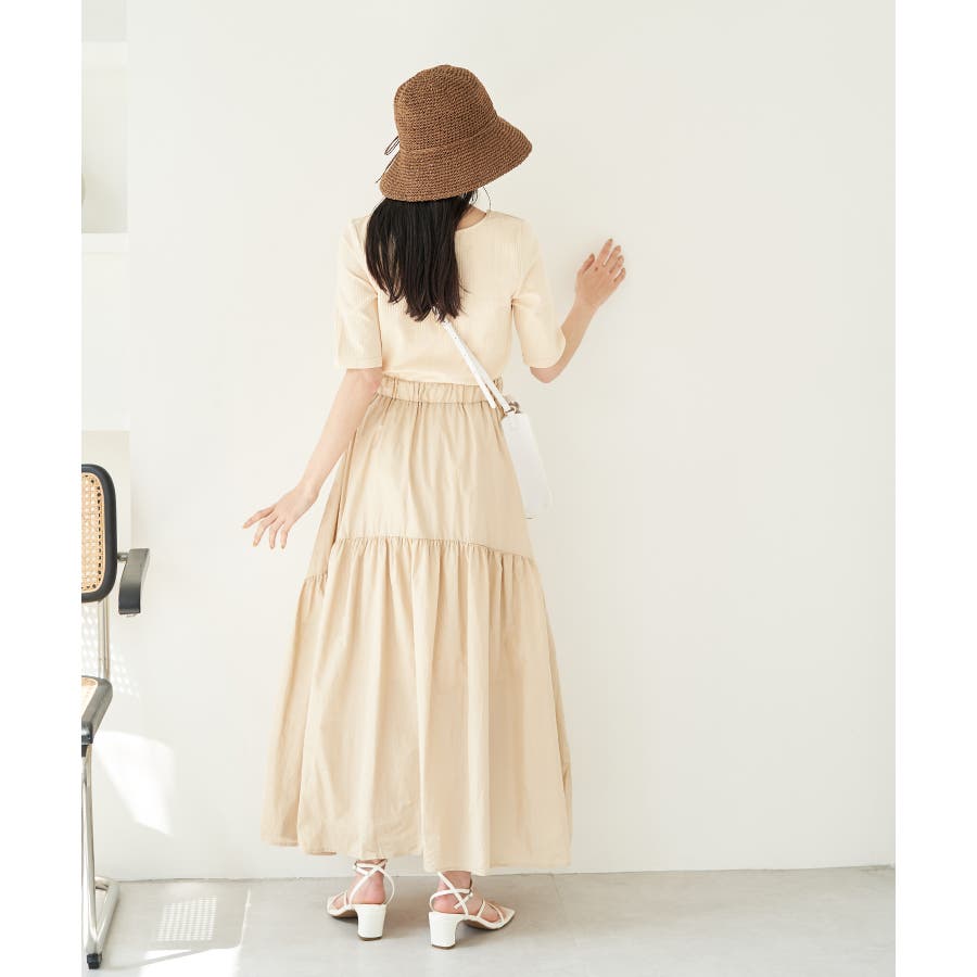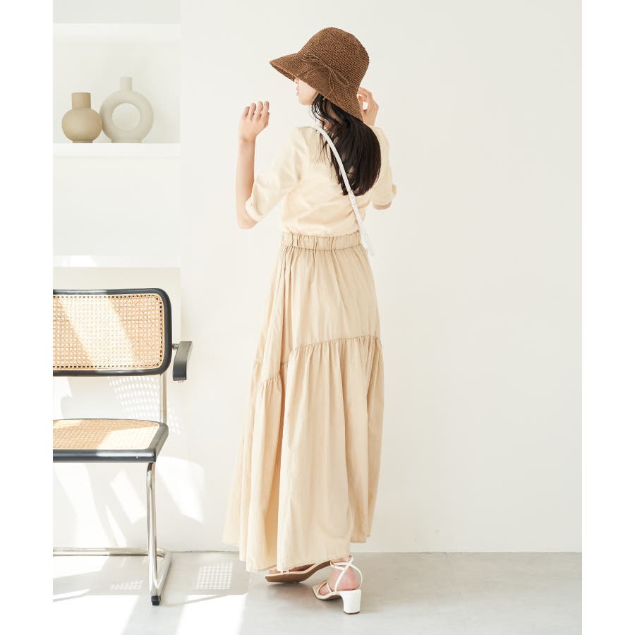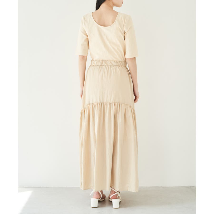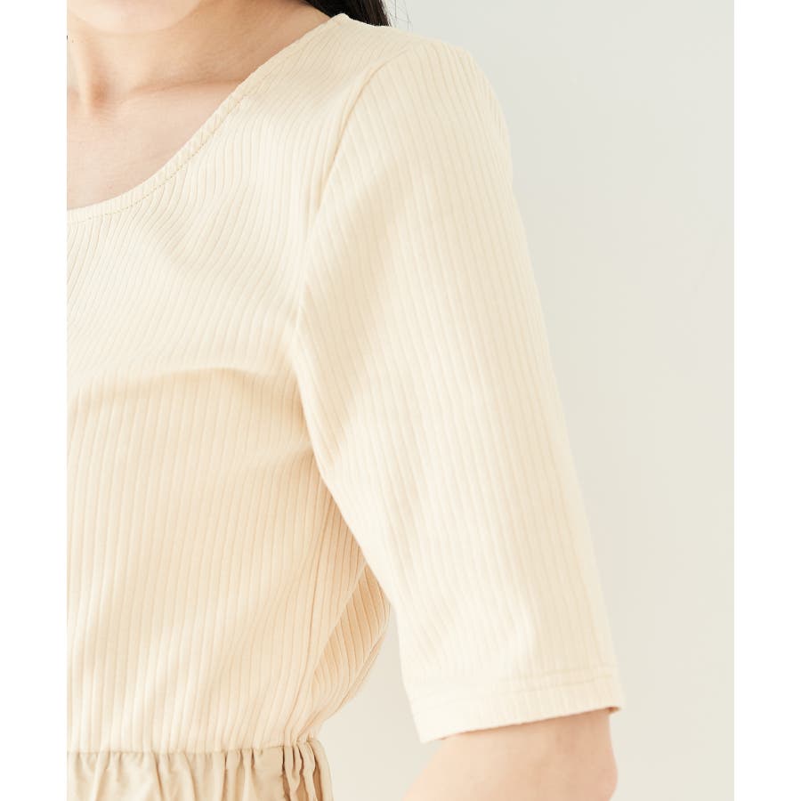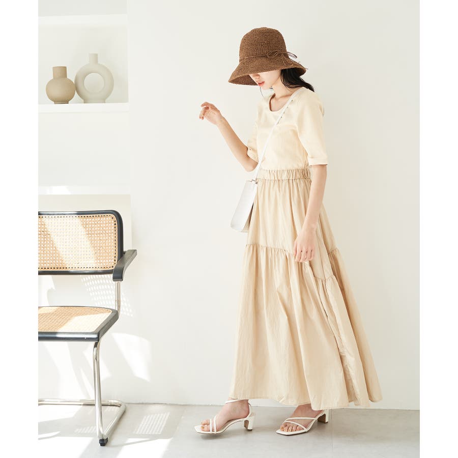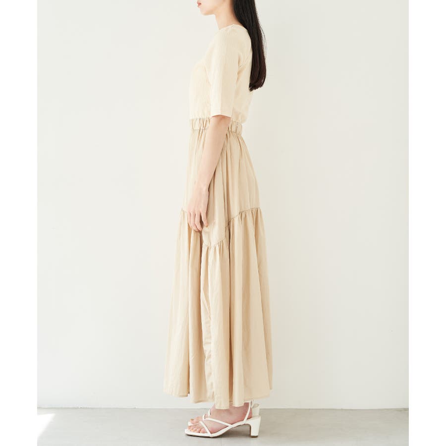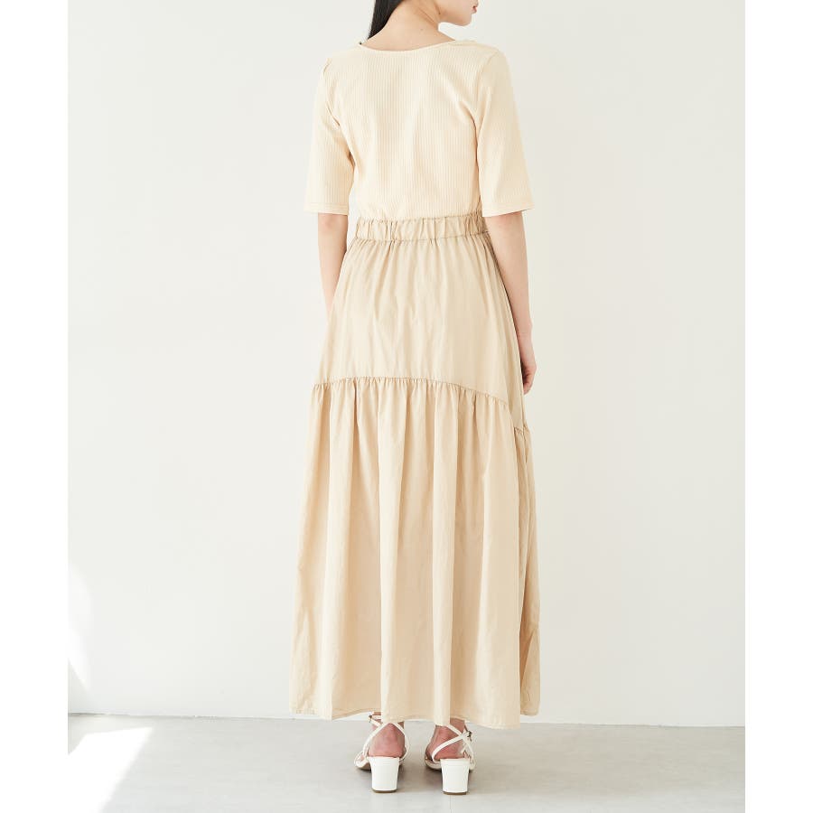 【デザイン・シルエット】 トップスはカットソーでスカート部分が布帛の異素材ドッキングのワンピース。 セットアップで着ている様に見える、忙しい日々にもってこいな「これだけで決まる」アイテムとなっております。 またスタイルがさらに良く見える様にシルエットにもこだわりました。 ウエストの設定位置を少し高めに設定しているので脚長効果があります。 【素材】 柔らかなカットソー地×程よくハリのある布帛の異素材ドッキング。 【カラー】 ナチュラルで大人なブラック・ブラウン・ベージュの3色展開。 【おすすめのスタイリング】 1枚でお洒落な着こなしになります◎ シンプルなのでアクセサリーや小物でカラーを入れてアクセントにするのがおすすめです◎ ----------------------------- 裏地:ベージュのみあり 光沢感:スカートあり 透け感:ややあり ウエスト:ゴム ポケット:なし 伸縮性:トップスあり 生地の厚さ:やや薄手 ボタン:なし 季節:春~初秋 ----------------------------- 【モデル着用サイズ】 全色モデル身長:160cm、着用サイズ:M ベージュのみ着用モデル身長:161cm、着用サイズ:M ※画像の商品はサンプルです。 実際の商品と仕様、加工、サイズが若干異なる場合がございます。