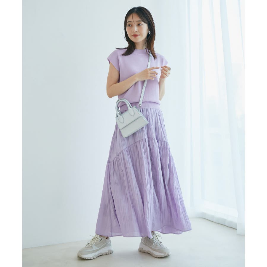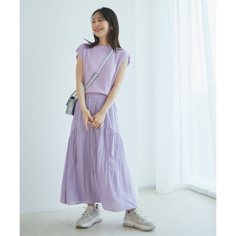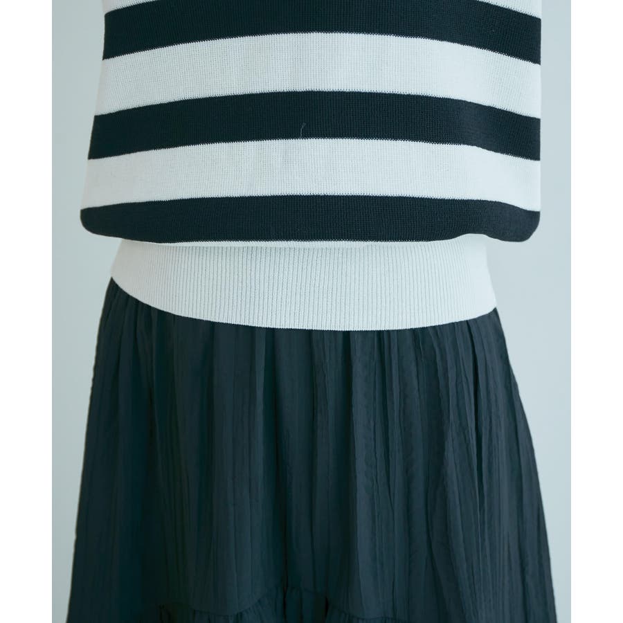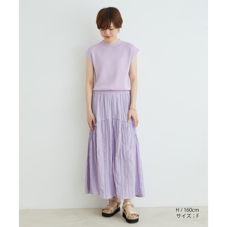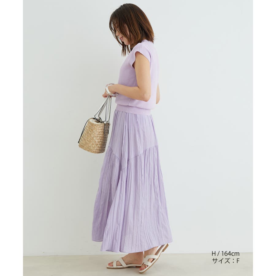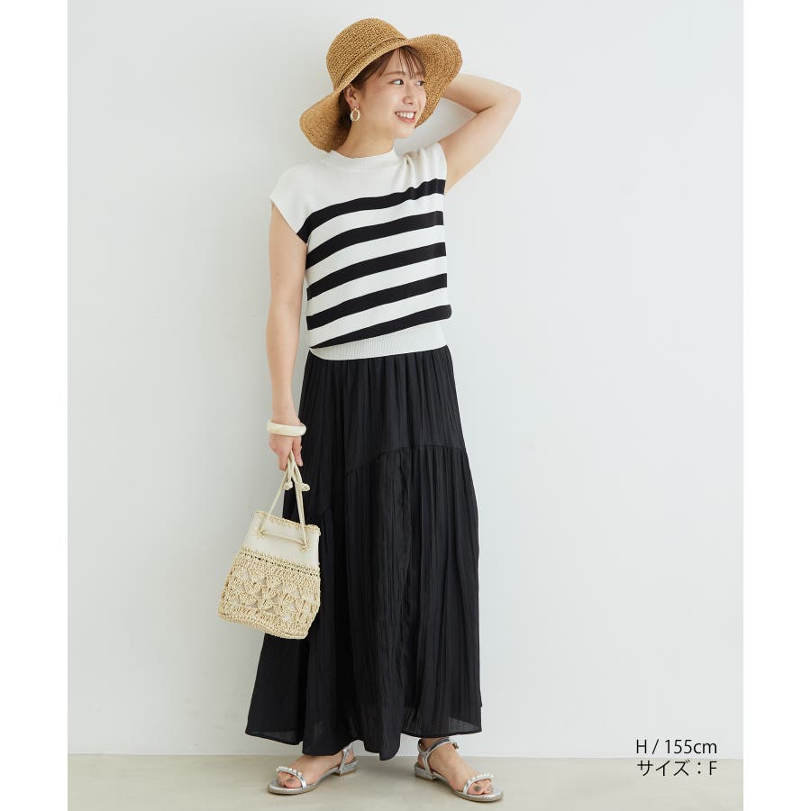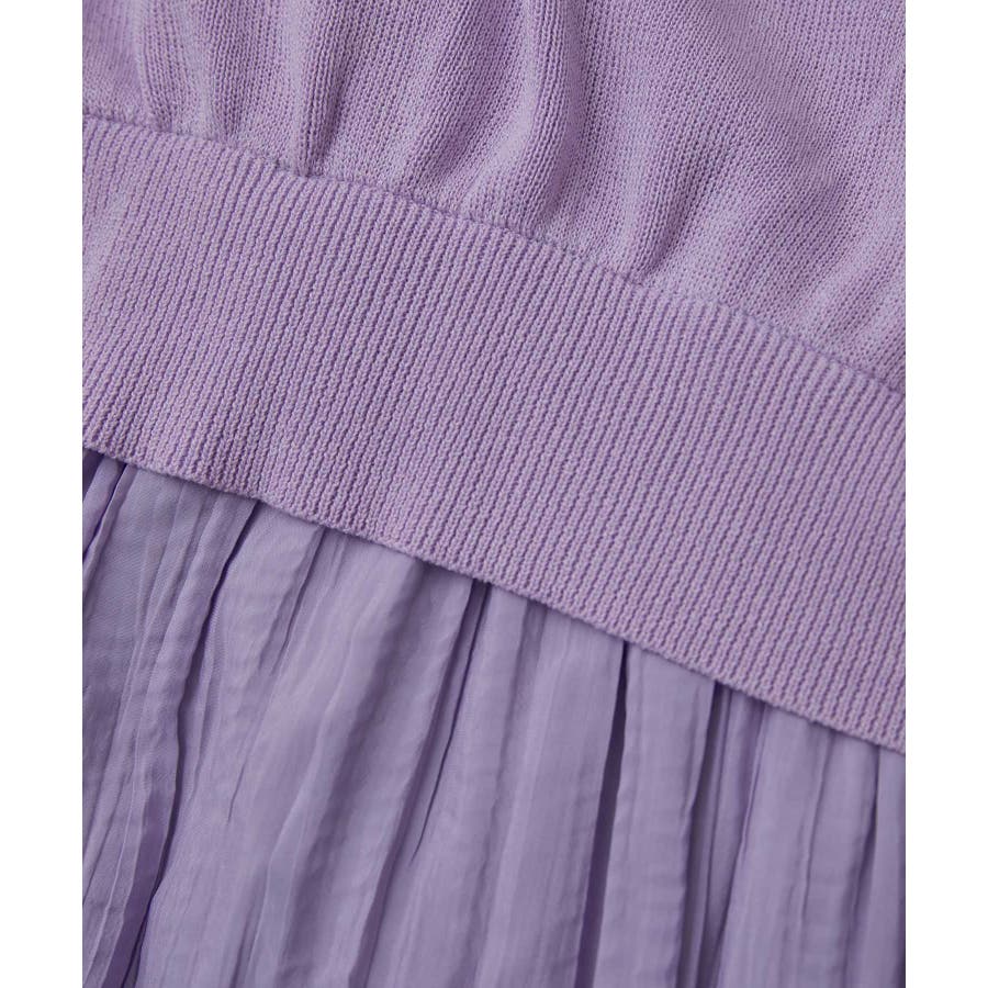 【デザイン・シルエット】 夏のテッパンでもあるフレンチスリーブニットとティアードプリーツスカートをドッキングした一枚で様になるワンピース! 低身長のお客様のニーズにもお応えして着丈のみ5cmの差寸を付けて通常のFサイズにプラスでFSサイズを投入しています! 【素材】 ニット部分はドライタッチの涼し気な素材を使用し、スカート部分は合繊素材のランダムプリーツを施しています。 【カラー】 ブラック×ブルー、ボーダー×ネイビー、アイボリー×イエロー、ラベンダー×ラベンダーの4色展開。 【おすすめのスタイリング】 1枚で綺麗に決まります◎ 足元はグルカサンダルとの合わせがおすすめ! 涼しげなハットをプラスしてアクセントにしても◎ ----------------------------- 裏地:あり 光沢感:なし 透け感:キナリのみややあり ウエスト:ゴム ポケット:なし 伸縮性:ニット部分あり 生地の厚さ:普通 ボタン:なし 季節:春~初秋 ----------------------------- 【モデル着用サイズ】 全色モデル身長:160cm、着用サイズ:F (サイズ比較:左FS、右F) ※画像の商品はサンプルです。 実際の商品と仕様、加工、サイズが若干異なる場合がございます。