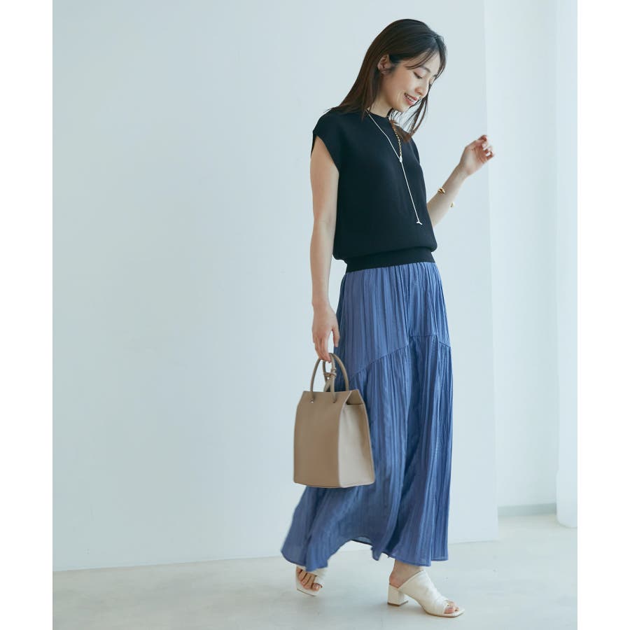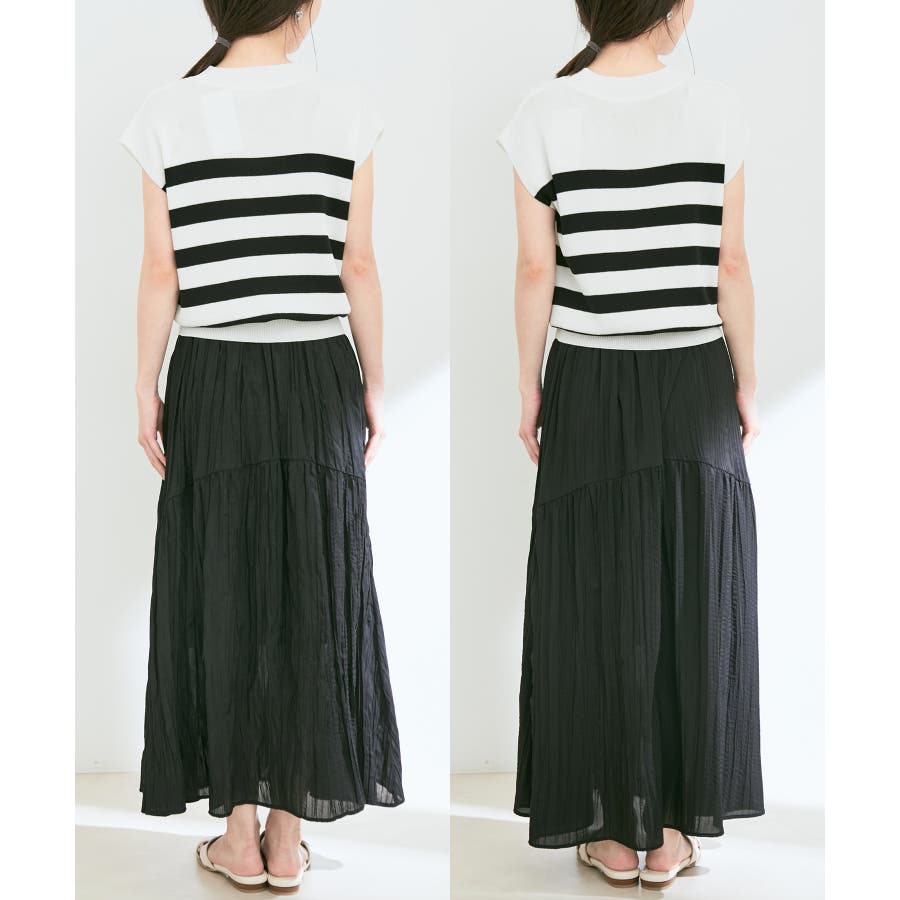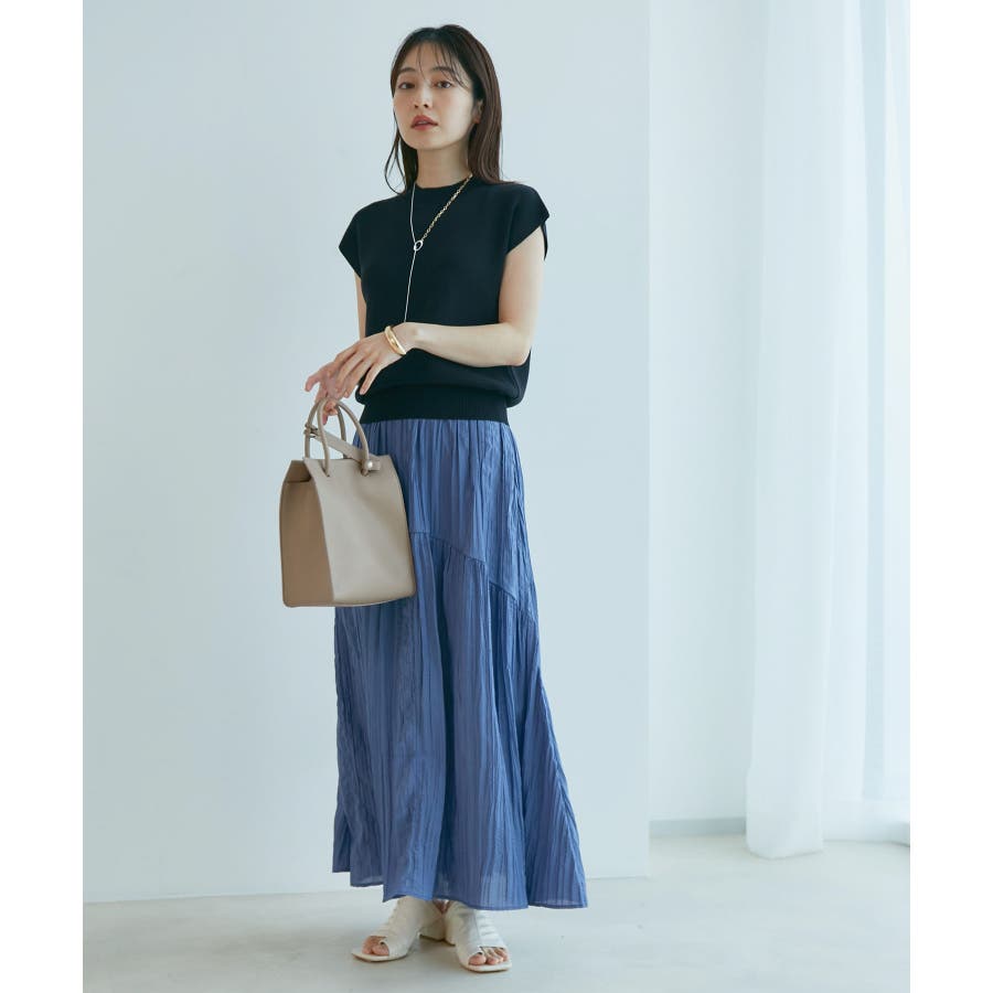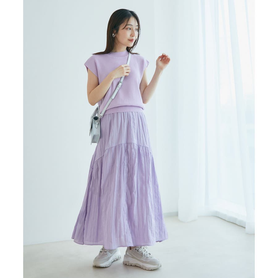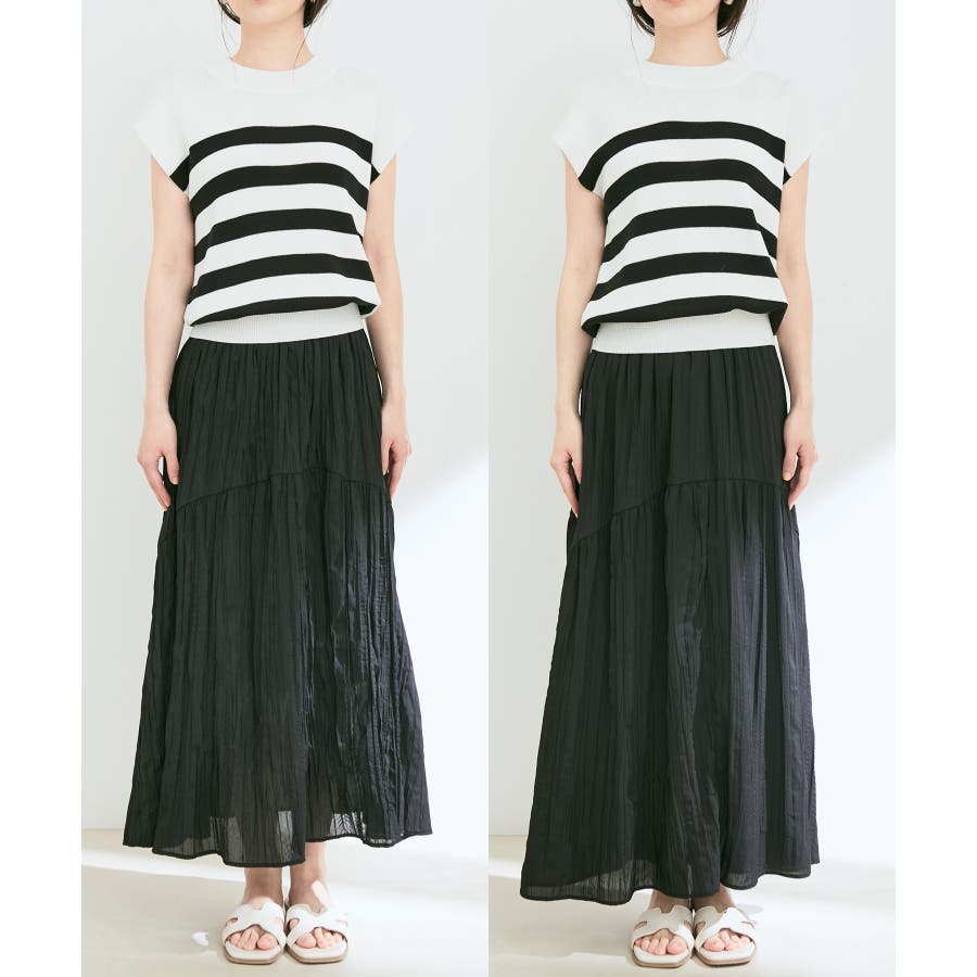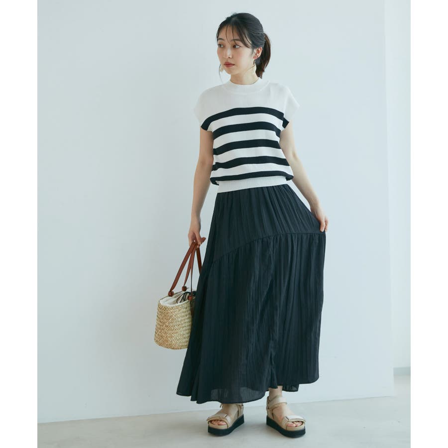 【デザイン・シルエット】 夏のテッパンでもあるフレンチスリーブニットとティアードプリーツスカートをドッキングした一枚で様になるワンピース! 低身長のお客様のニーズにもお応えして着丈のみ5cmの差寸を付けて通常のFサイズにプラスでFSサイズを投入しています! 【素材】 ニット部分はドライタッチの涼し気な素材を使用し、スカート部分は合繊素材のランダムプリーツを施しています。 【カラー】 ブラック×ブルー、ボーダー×ネイビー、アイボリー×イエロー、ラベンダー×ラベンダーの4色展開。 【おすすめのスタイリング】 1枚で綺麗に決まります◎ 足元はグルカサンダルとの合わせがおすすめ! 涼しげなハットをプラスしてアクセントにしても◎ ----------------------------- 裏地:あり 光沢感:なし 透け感:キナリのみややあり ウエスト:ゴム ポケット:なし 伸縮性:ニット部分あり 生地の厚さ:普通 ボタン:なし 季節:春~初秋 ----------------------------- 【モデル着用サイズ】 全色モデル身長:160cm、着用サイズ:F (サイズ比較:左FS、右F) ※画像の商品はサンプルです。 実際の商品と仕様、加工、サイズが若干異なる場合がございます。