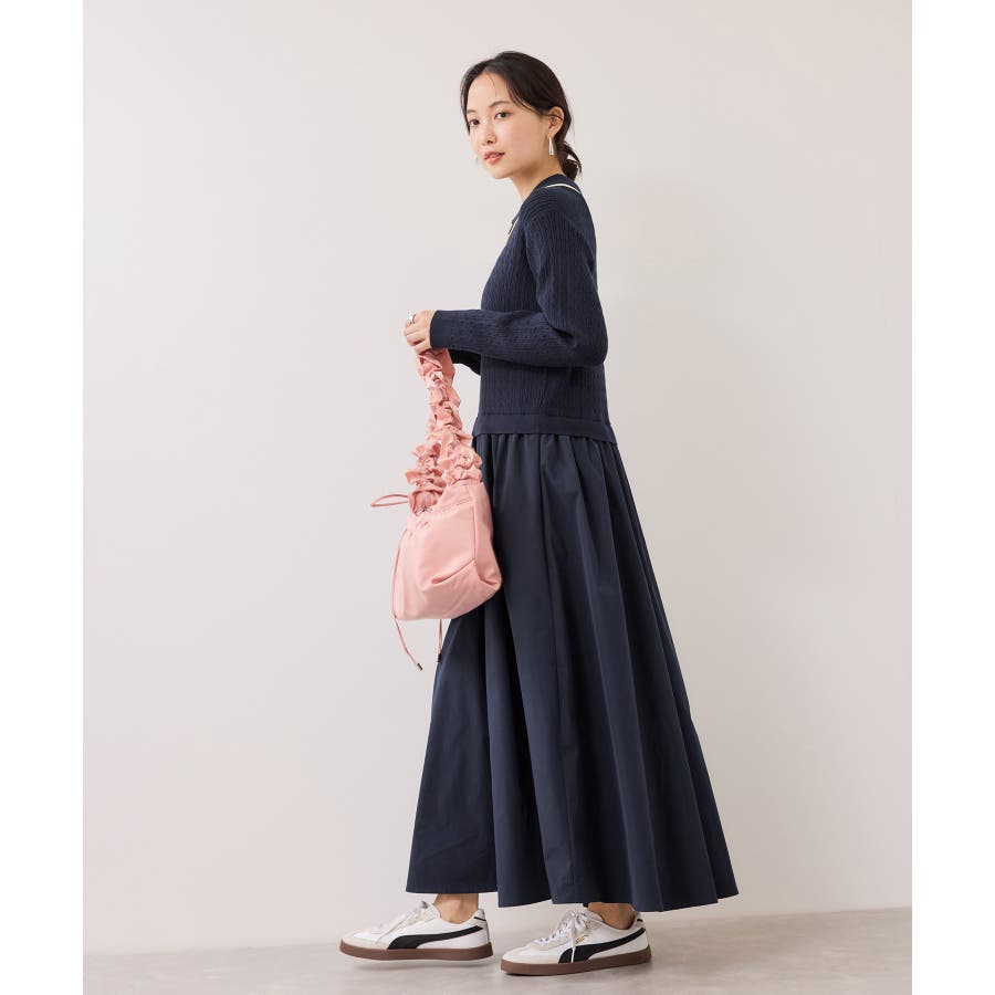 ・柔らかいニット素材のトップスとタフタ素材のスカートのドッキングワンピ