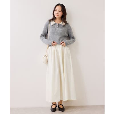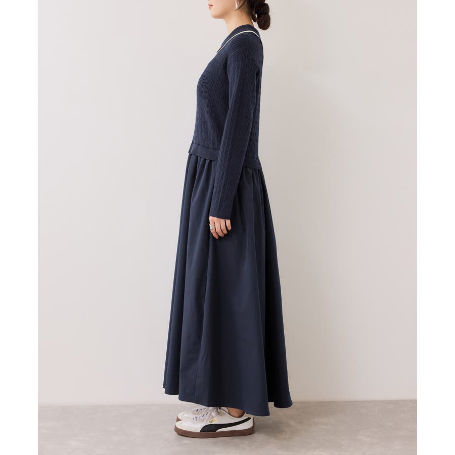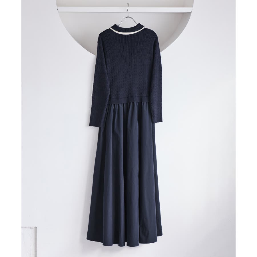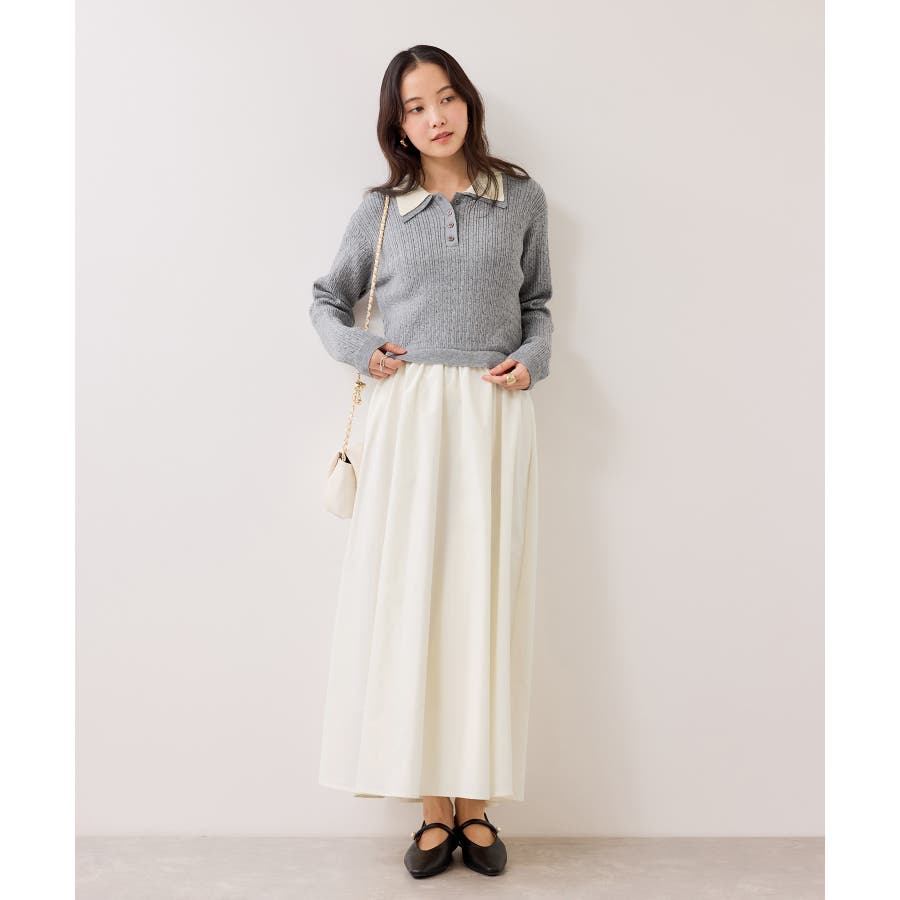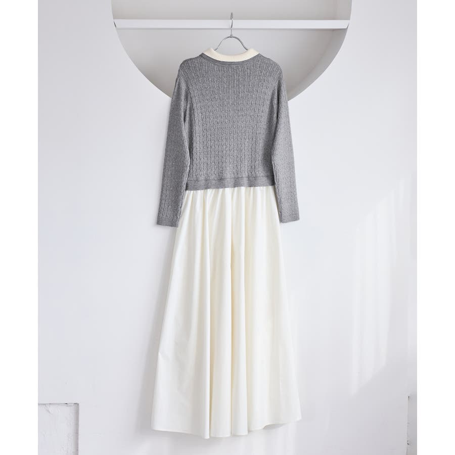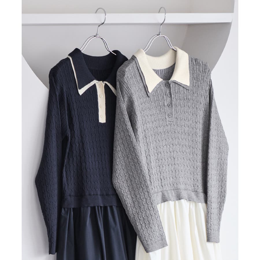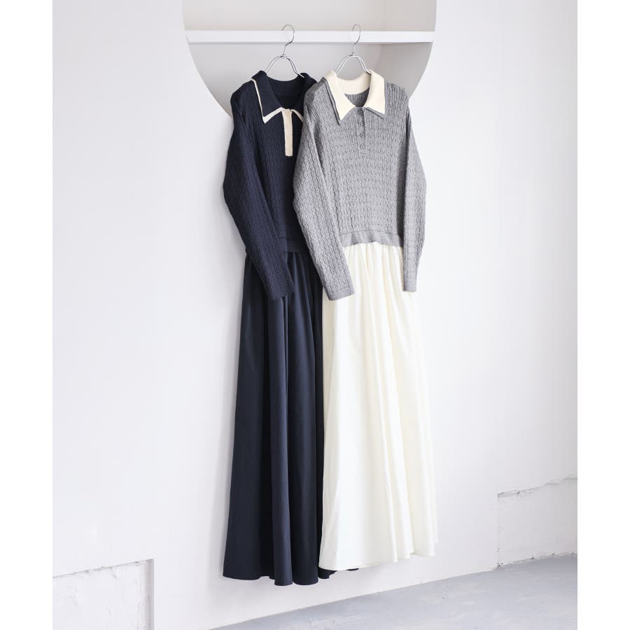 コンパクトなトップスに裾がふんわりと広がったスカートでメリハリのあるシルエット。トップス部分は細いケーブル編み。襟周りはダブルカラーと配色使いでトレンド感のある1枚。お出かけや通勤にも着回し可能。着るだけでこなれ感のあるスタイリングが完成します!