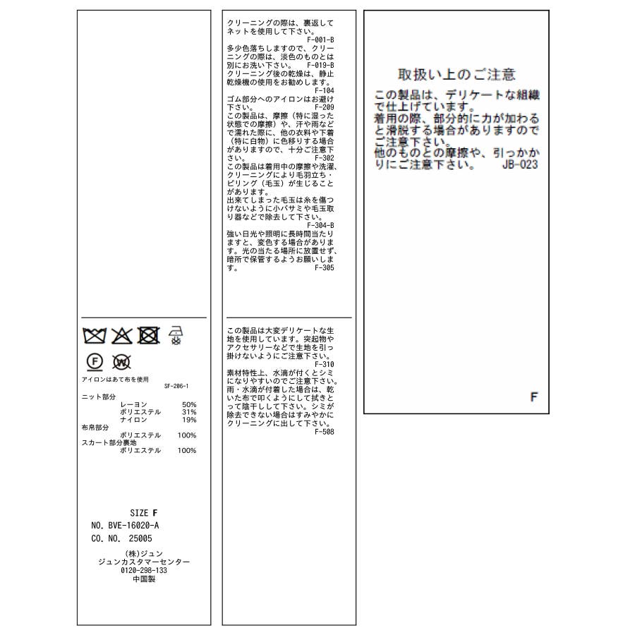 | 素材 | (ニット部分) レーヨン 50% ポリエステル 31% ナイロン 19% (布帛部分) ポリエステル 100% (スカート部分裏地) ポリエステル 100% |