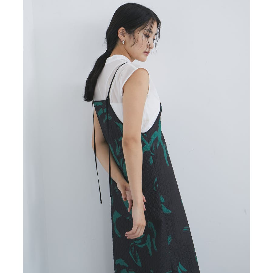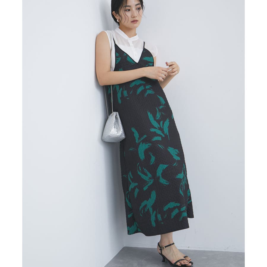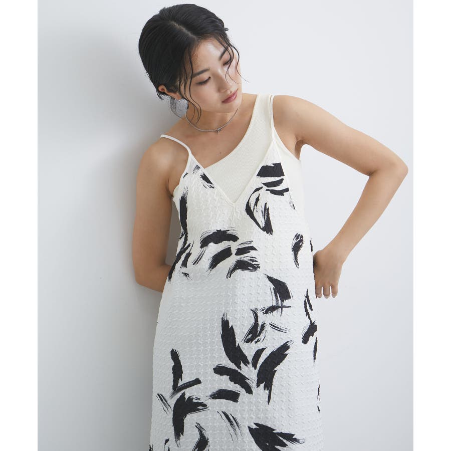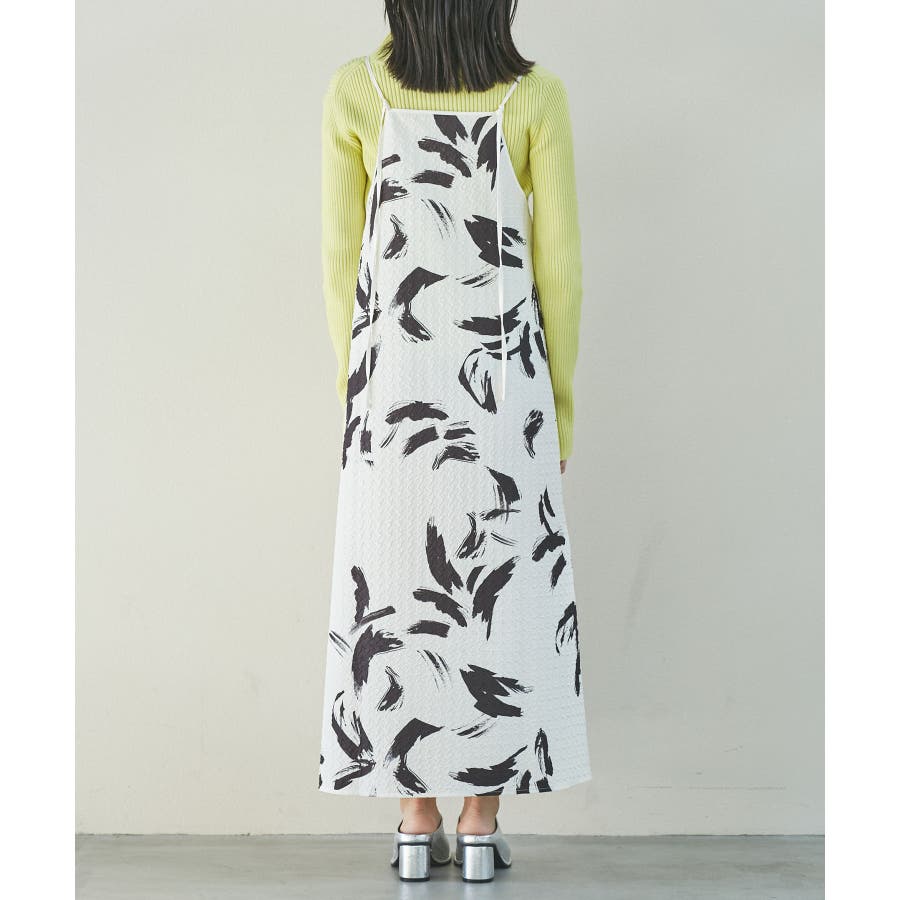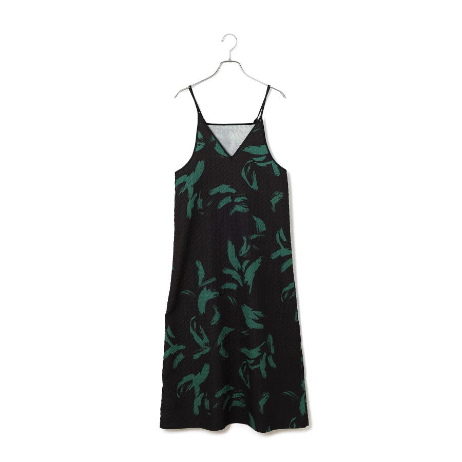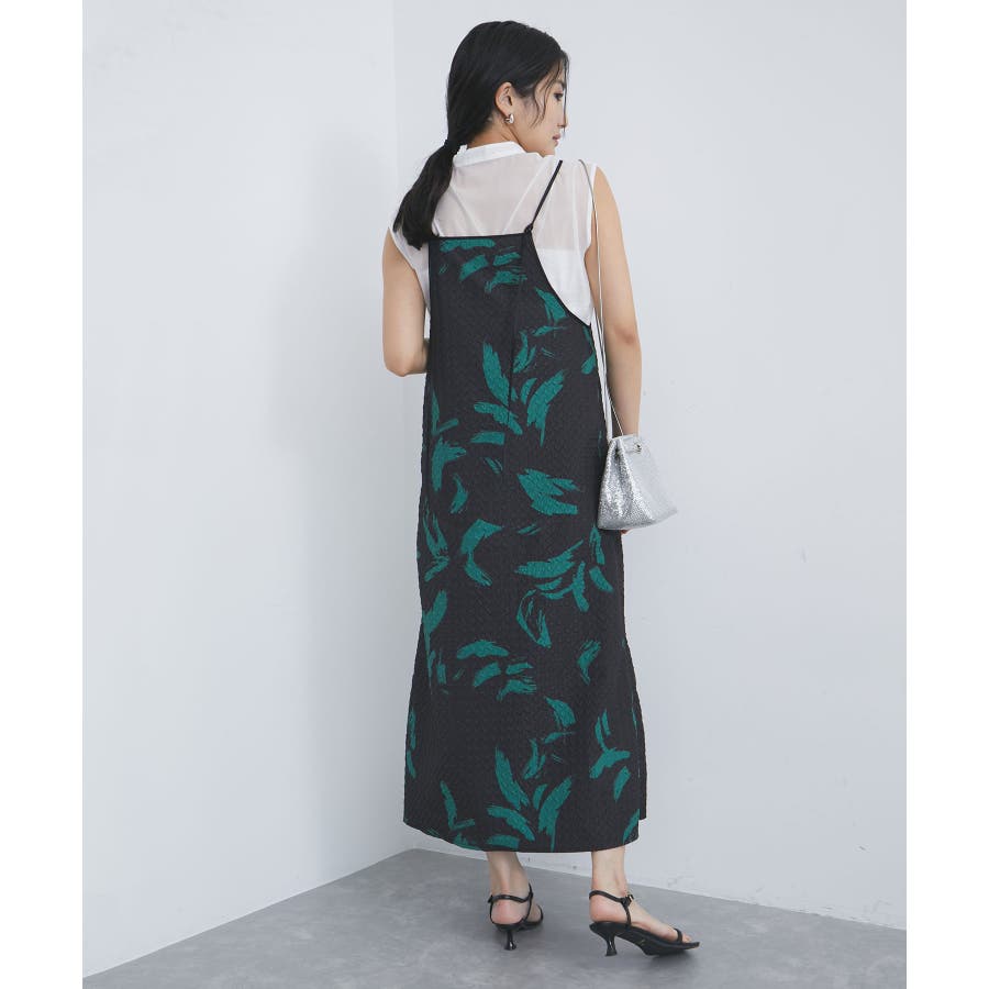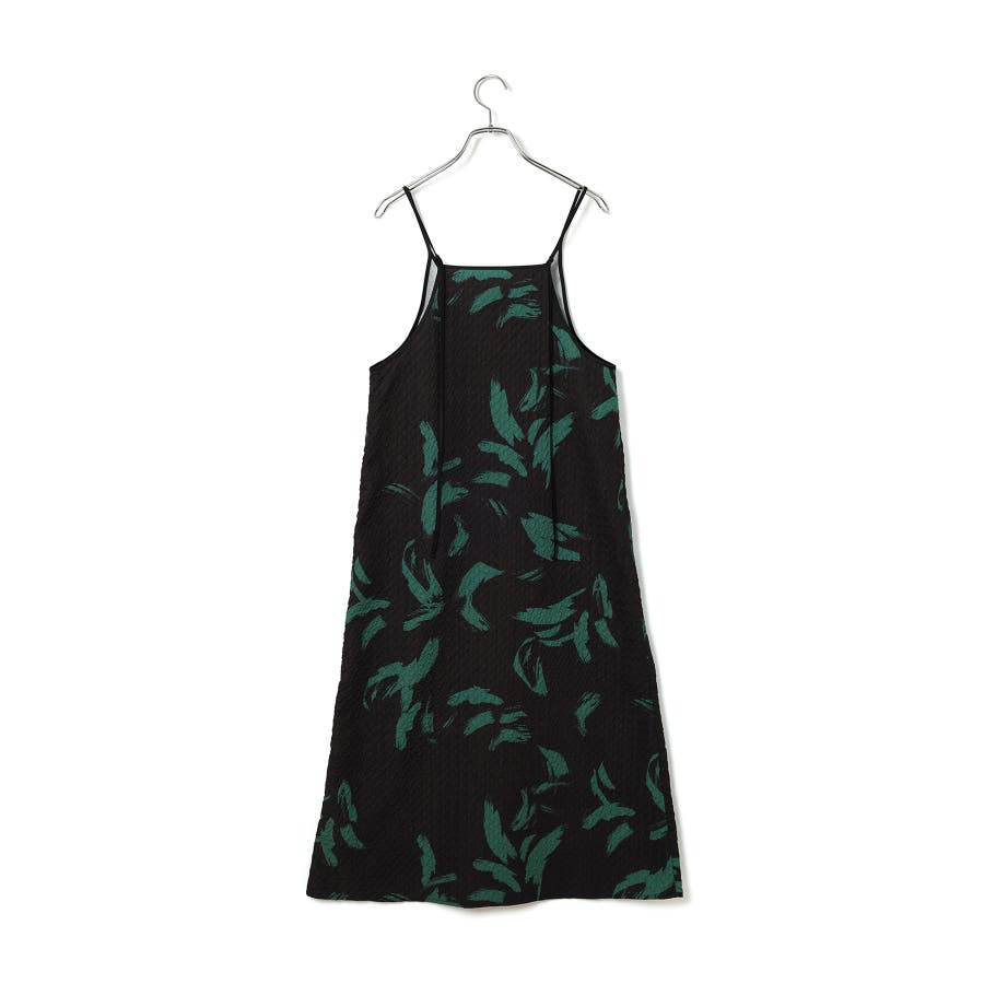 【デザイン・シルエット】 筆で描いたような、葉っぱのような柄のふくれジャガード素材のキャミワンピース。