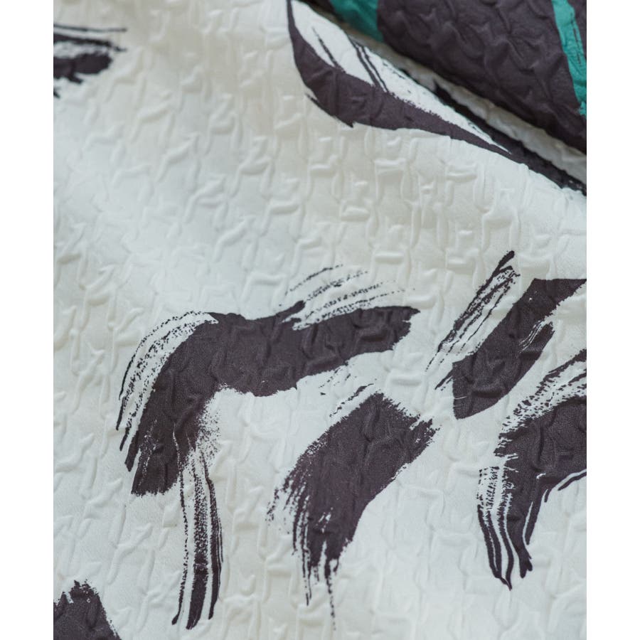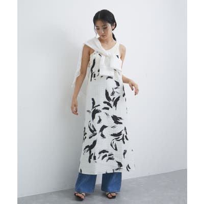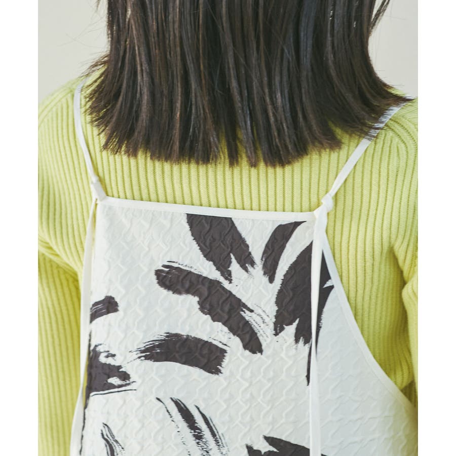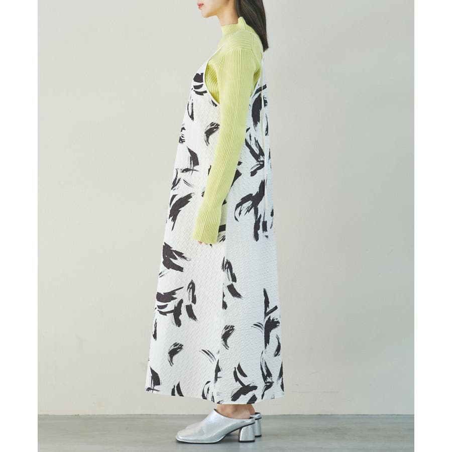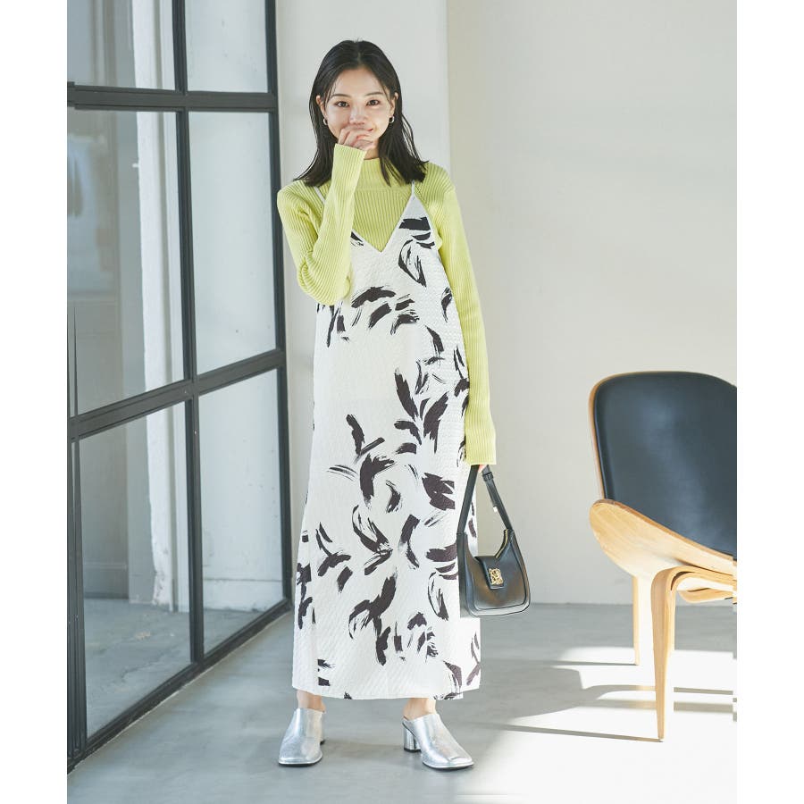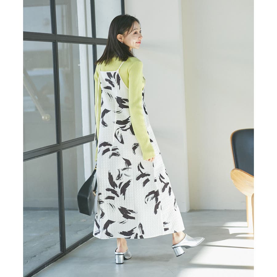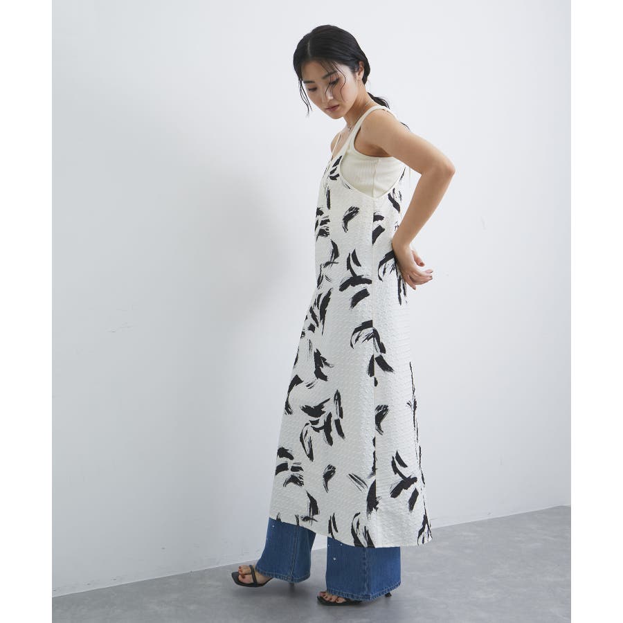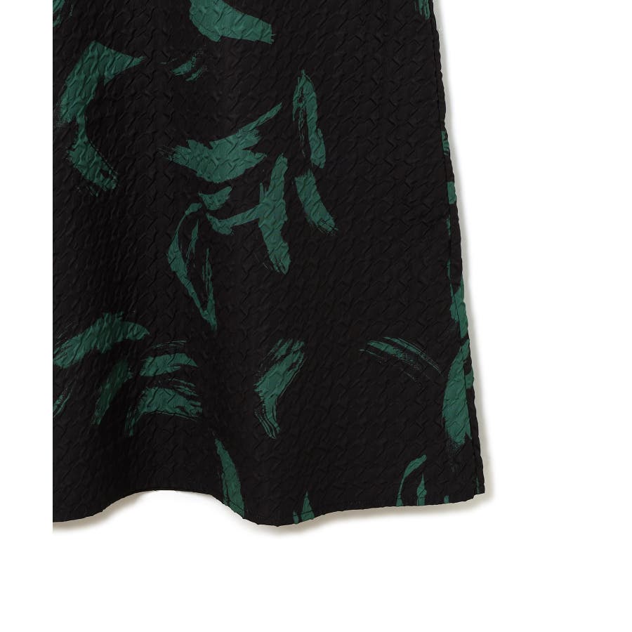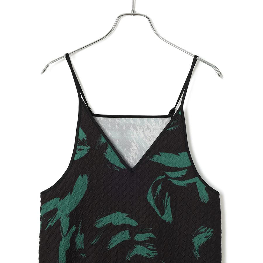 【デザイン・シルエット】 筆で描いたような、葉っぱのような柄のふくれジャガード素材のキャミワンピース。