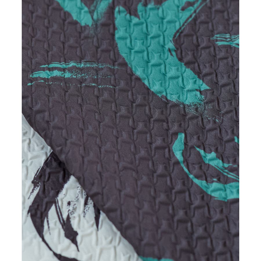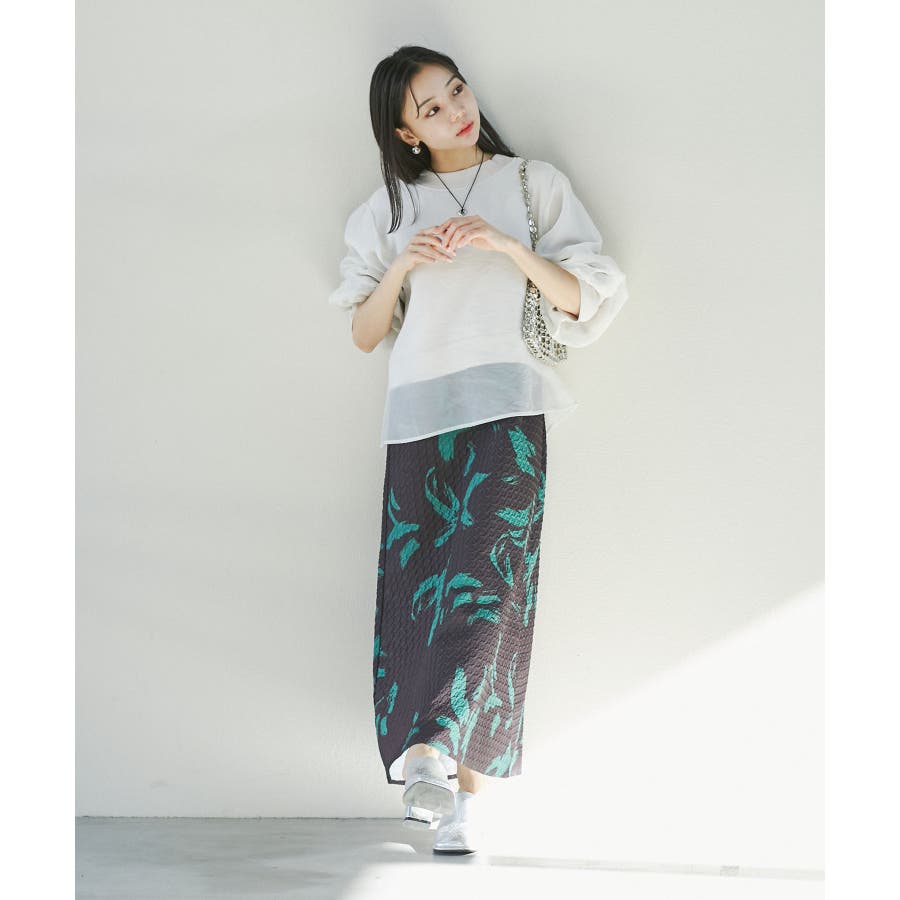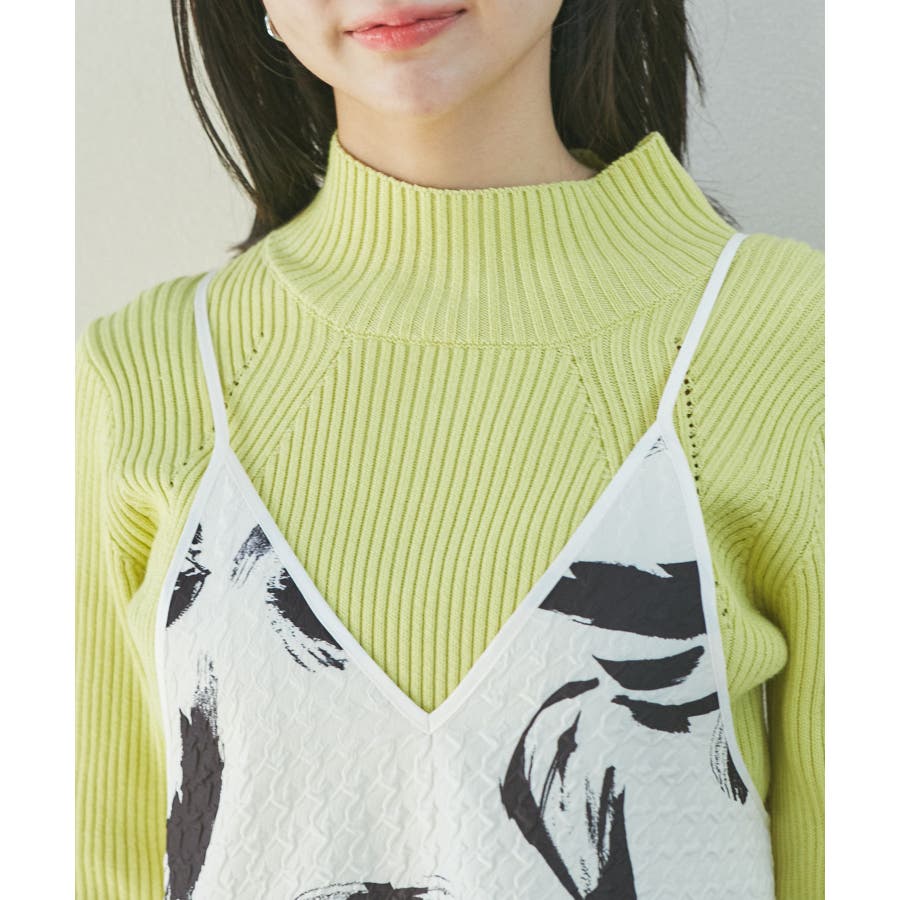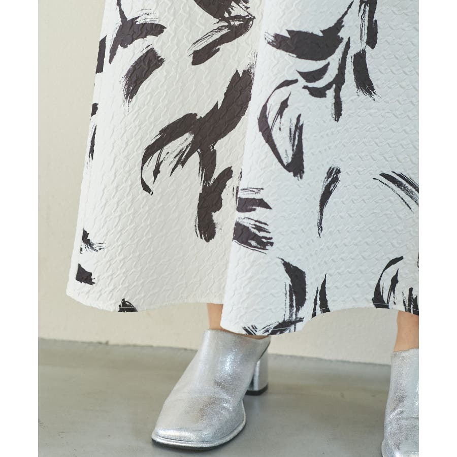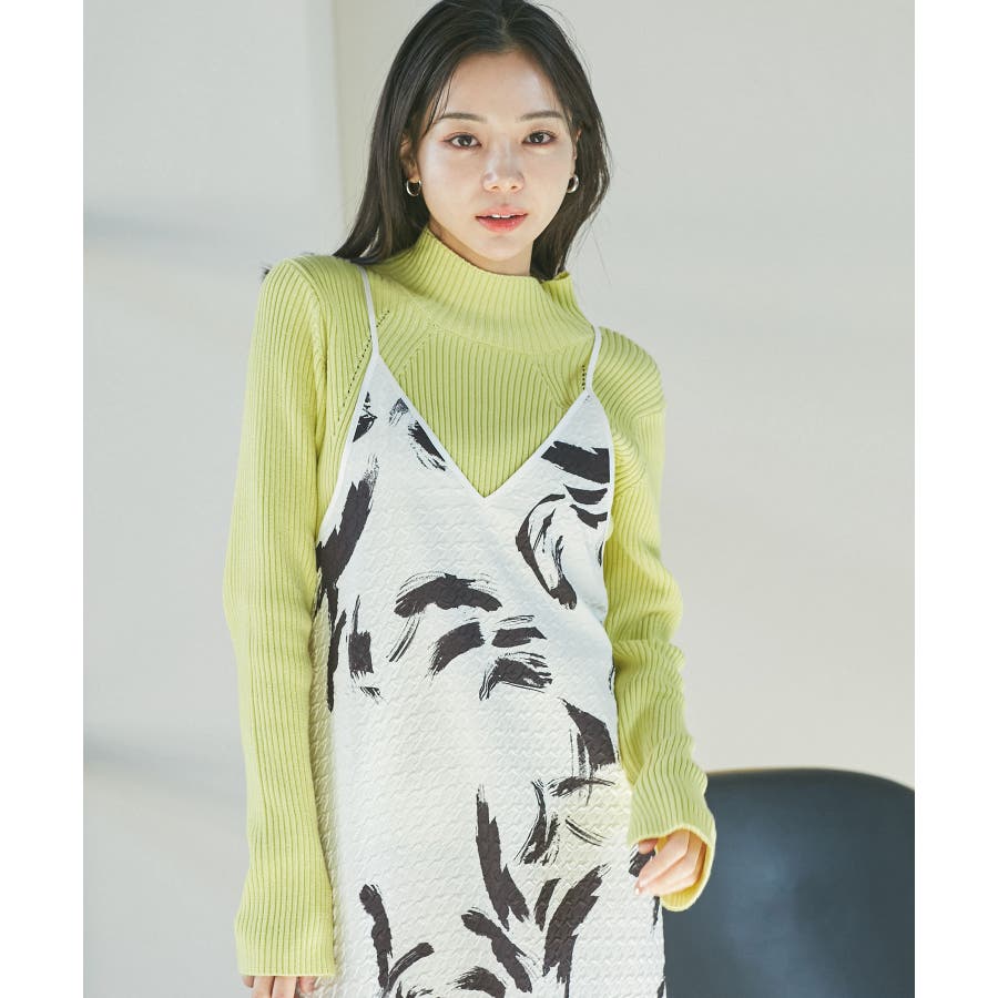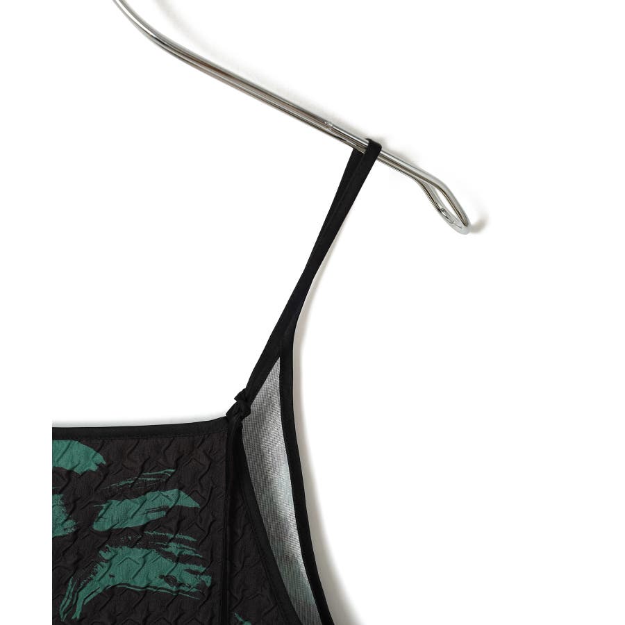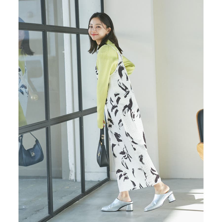【デザイン・シルエット】 筆で描いたような、葉っぱのような柄のふくれジャガード素材のキャミワンピース。