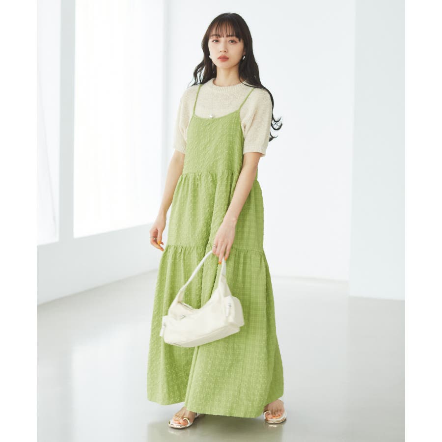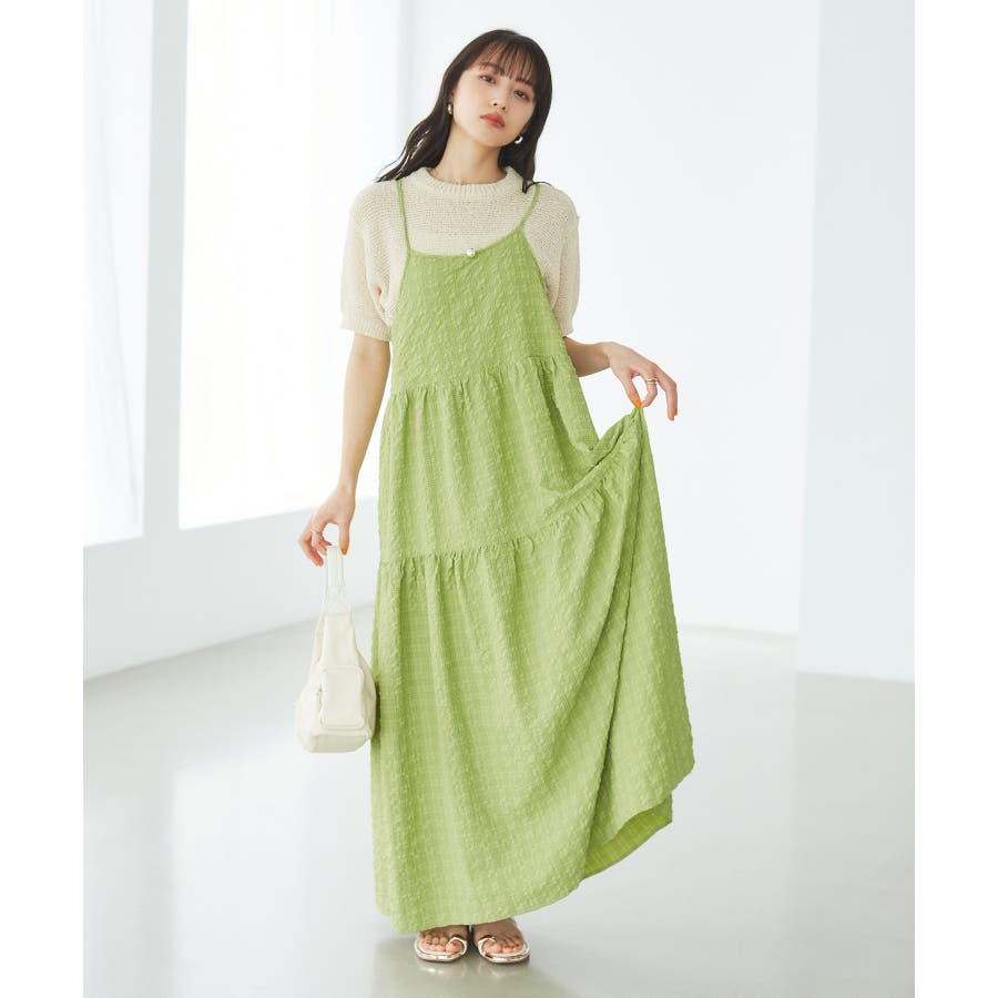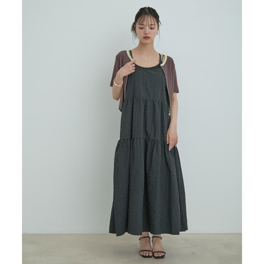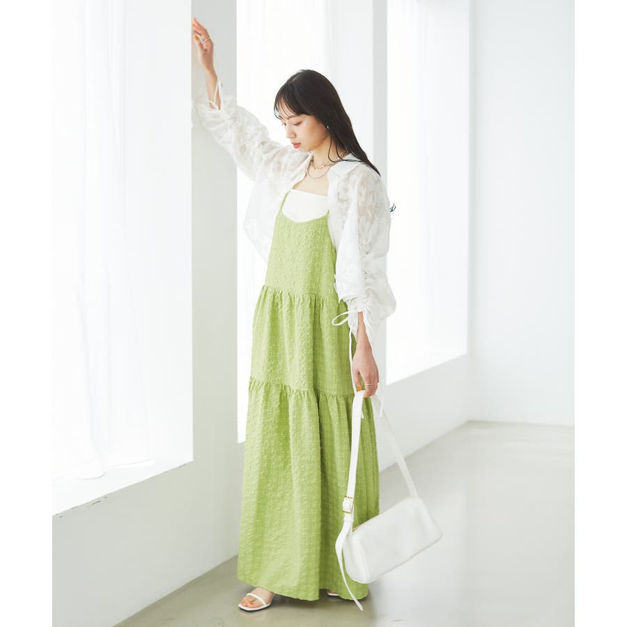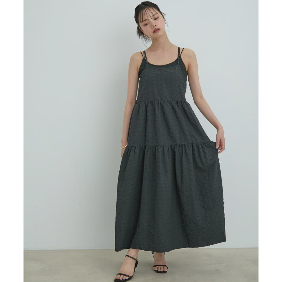 ◆2024春夏◆ 【デザイン・シルエット】 トレンドのぽこぽことした表面変化のある生地を使用したキャミワンピースです。 インナーを変えて、春、夏、秋とロングシーズン着用できるロングキャミワンピースです。