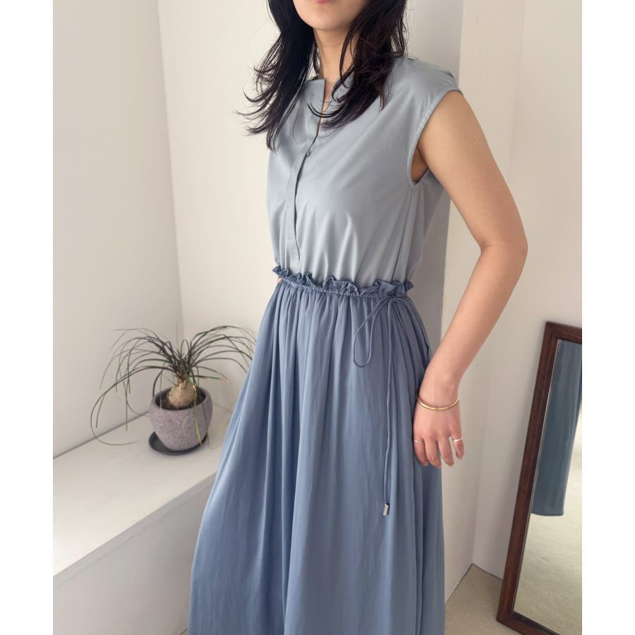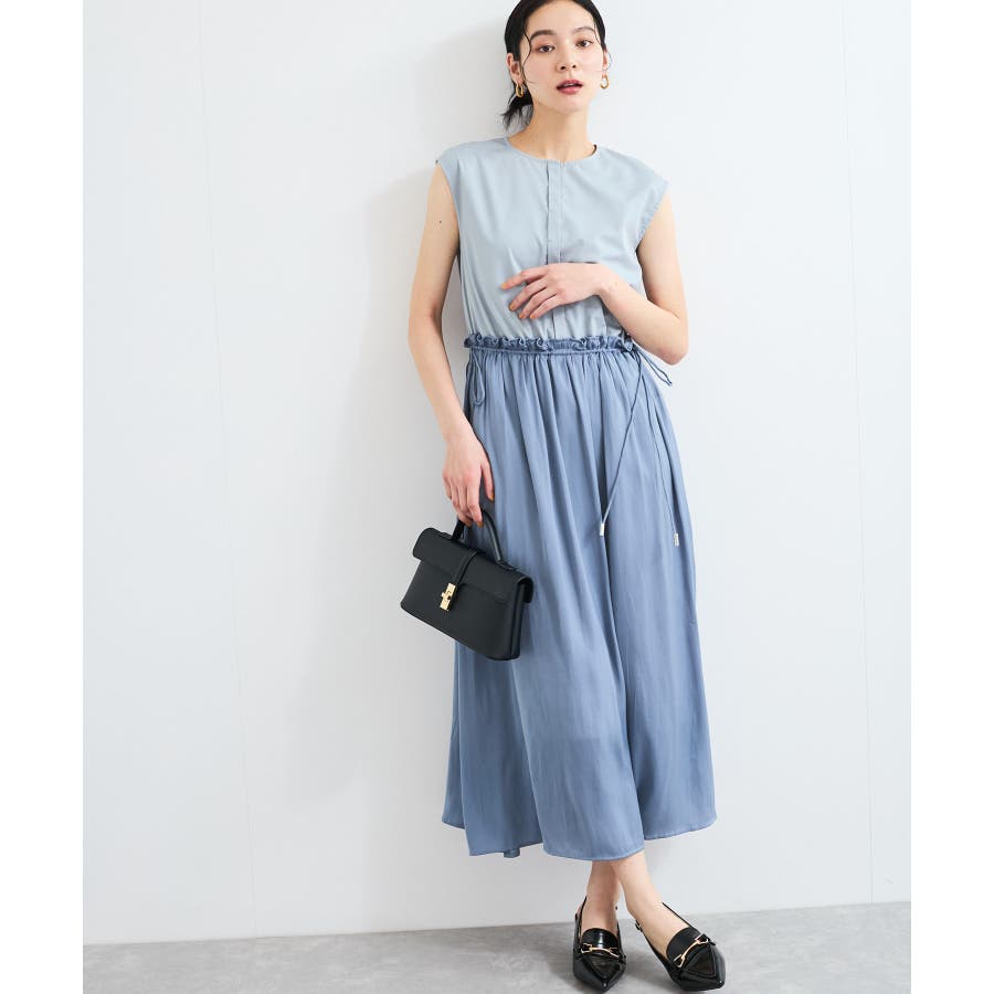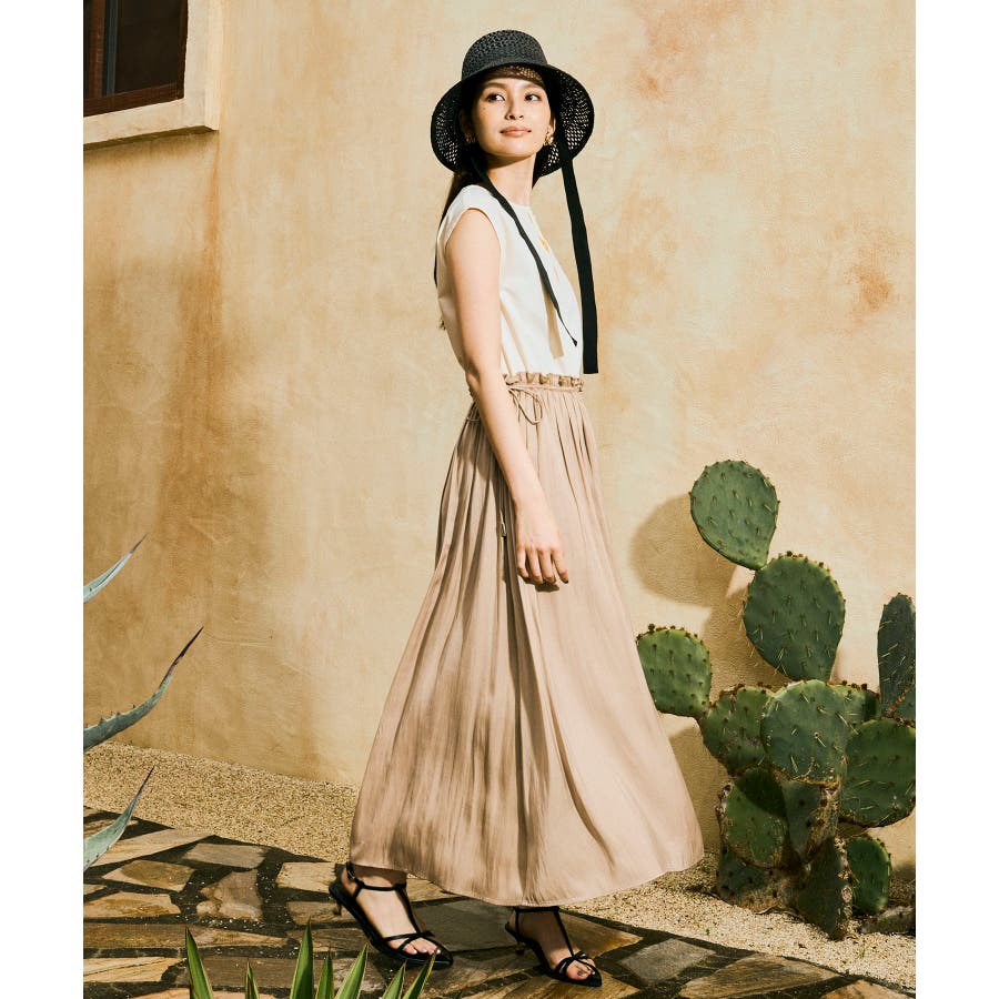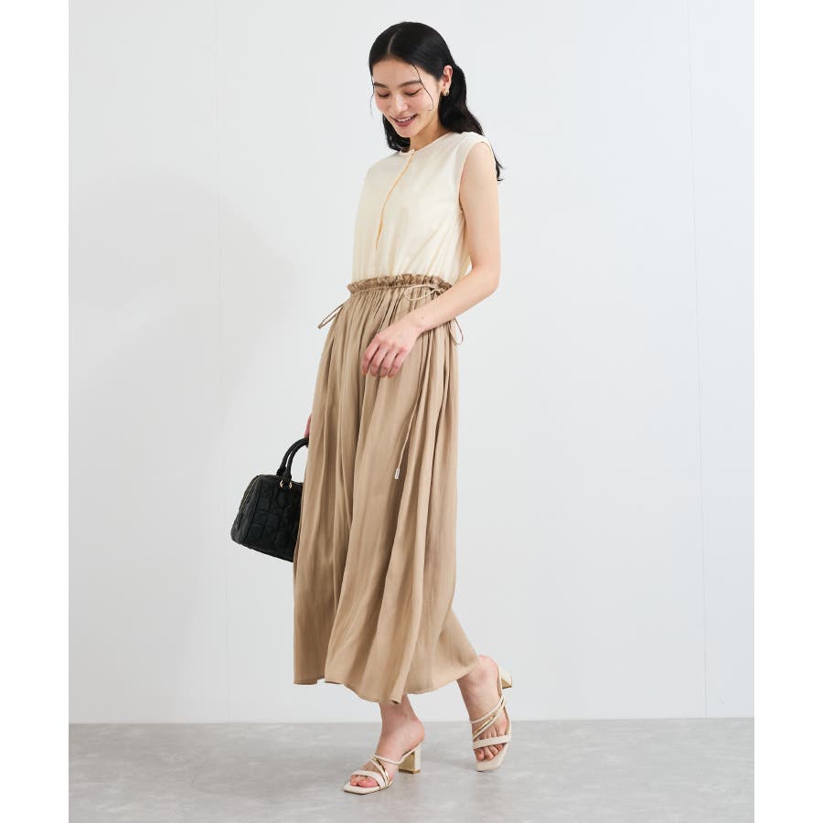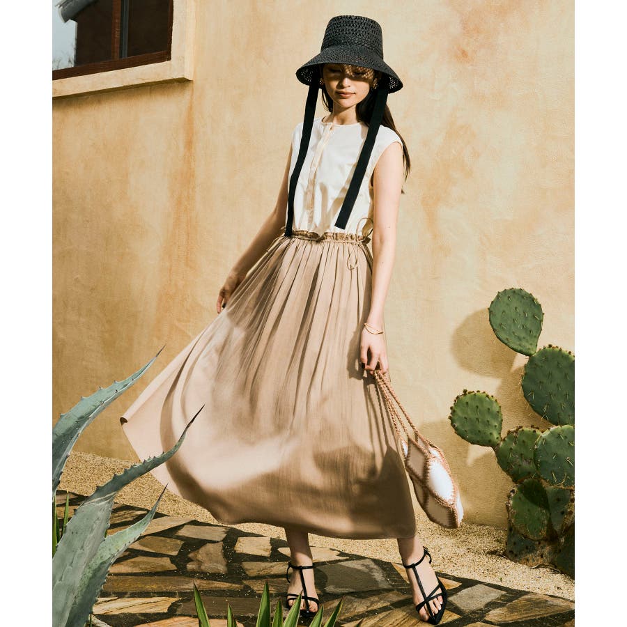 スカートはたっぷり寄せたギャザーから流れるようなシルエットが特徴的で、女性らしく軽やかな印象に見せてくれます。