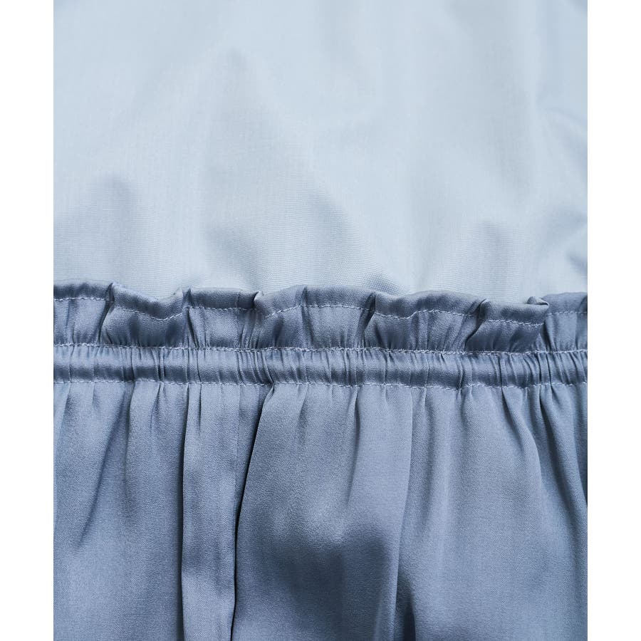 上身頃はお仕事でも使える綺麗めなシャツブラウス、スカート部分はやや光沢のある素材で歩く度に揺れる女性らしいシルエットに。