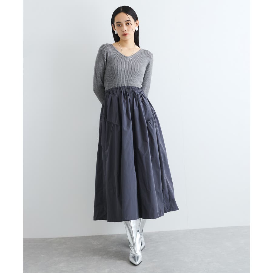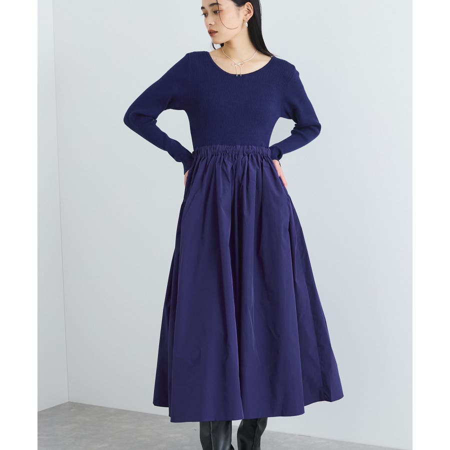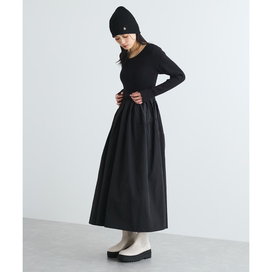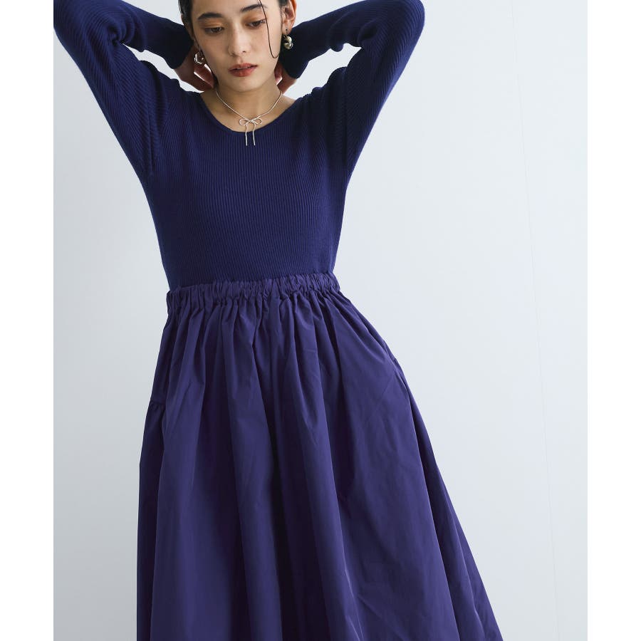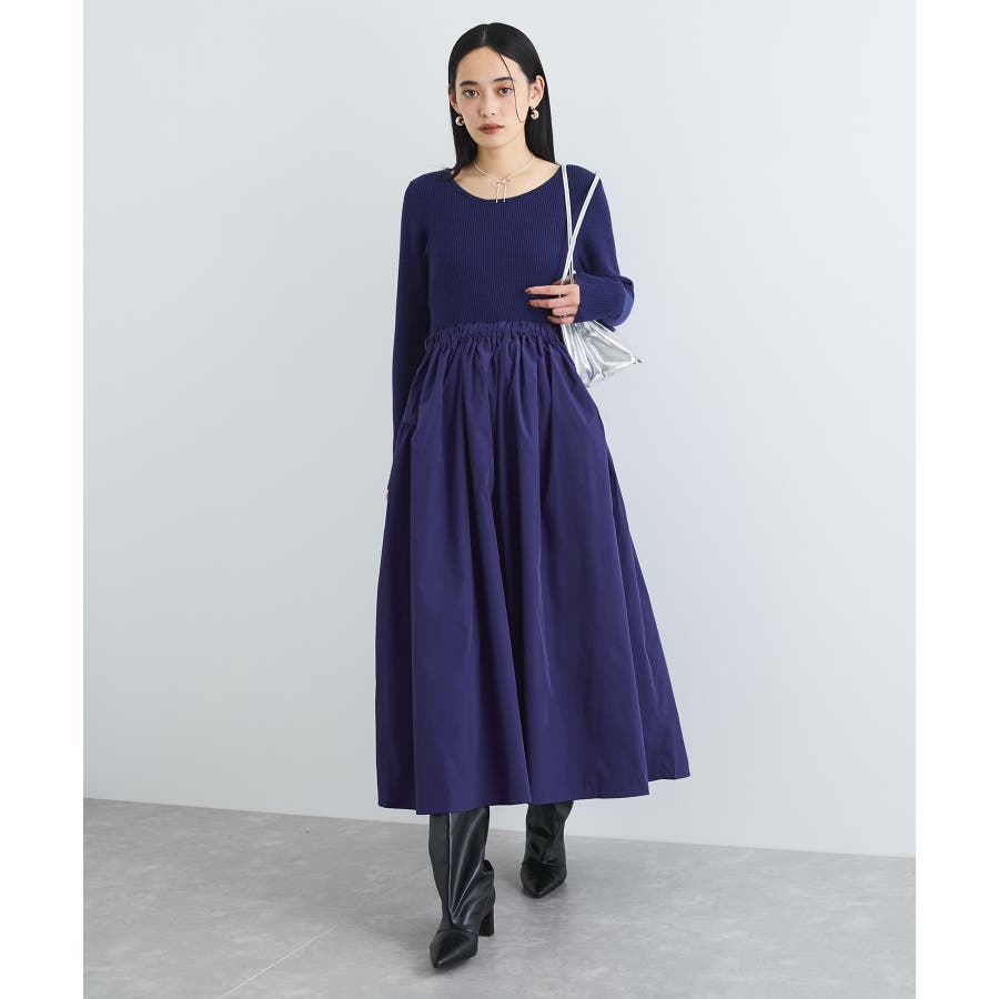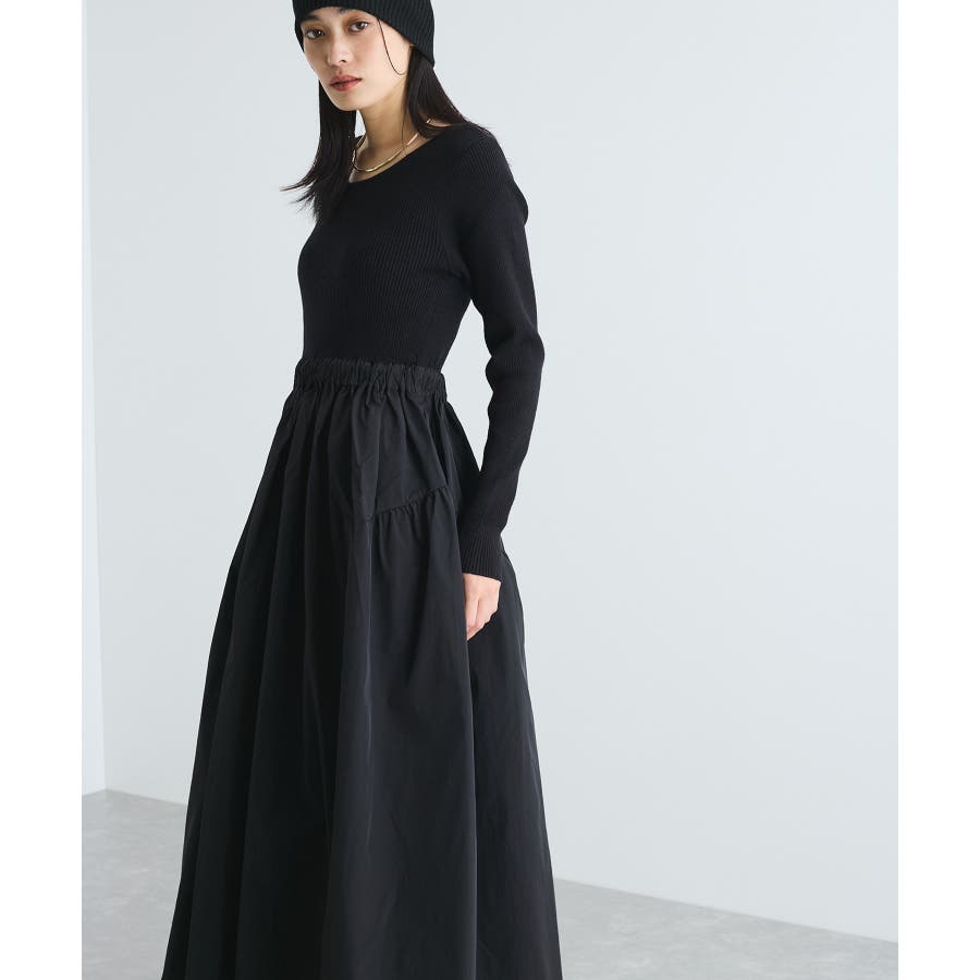 【デザイン・シルエット】 リブニットとタフタのドッキングワンピースです。