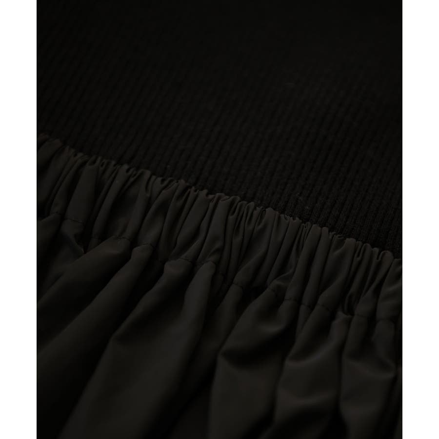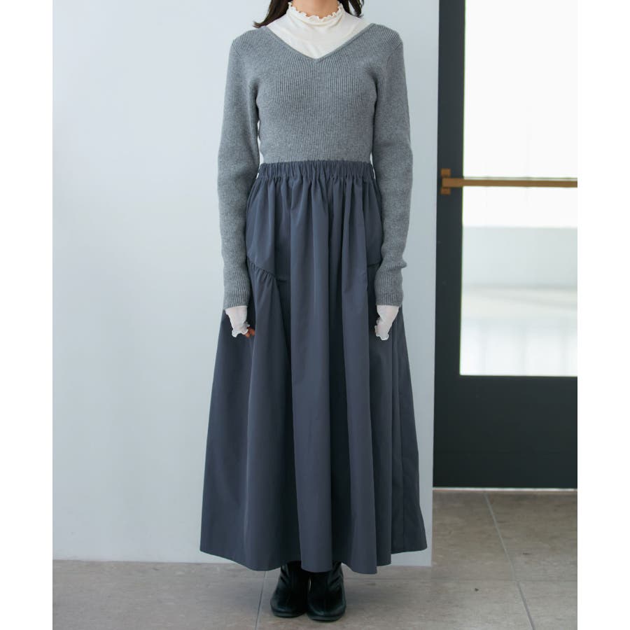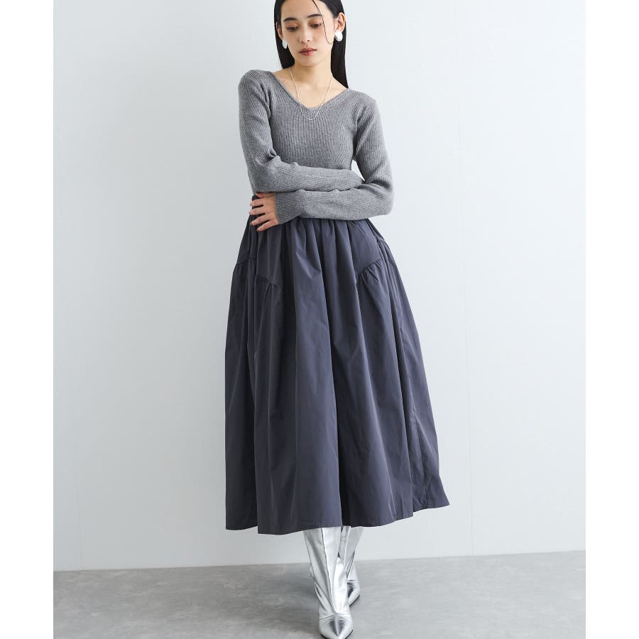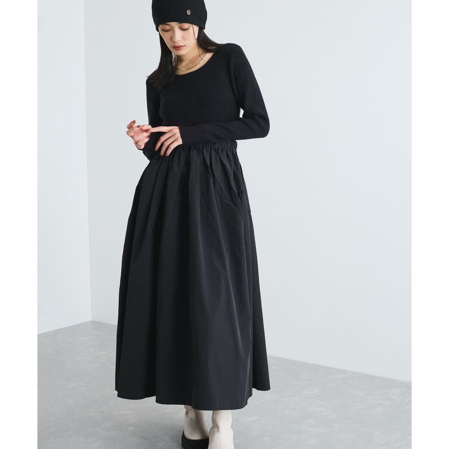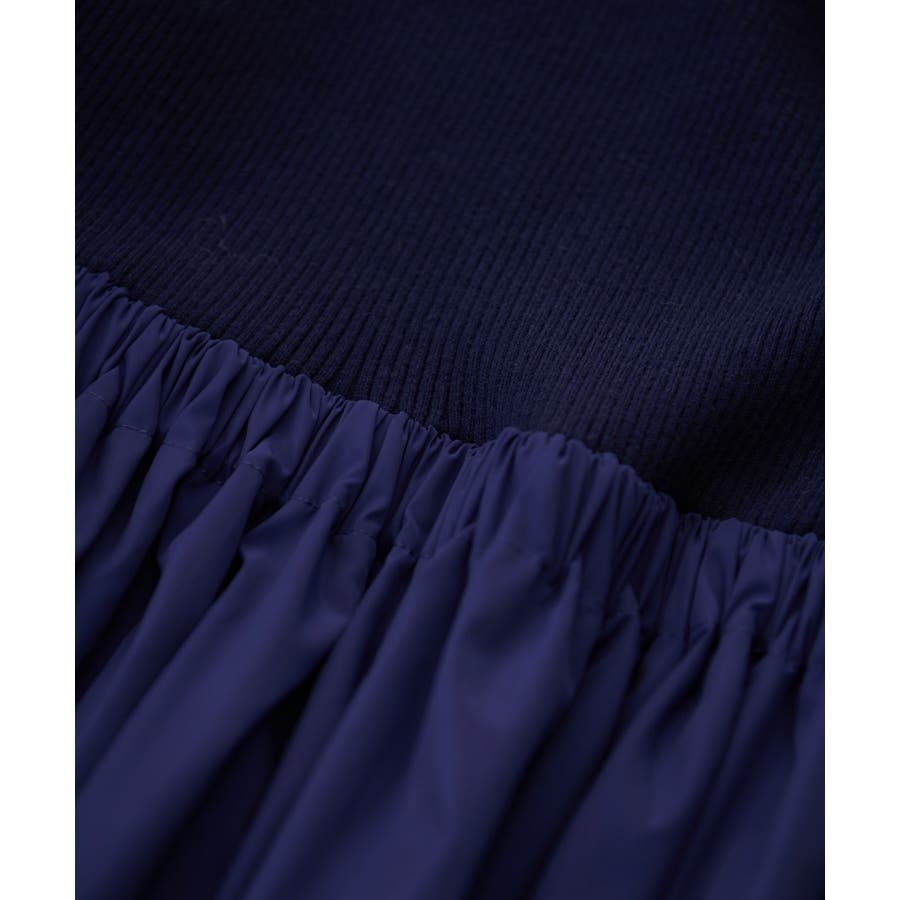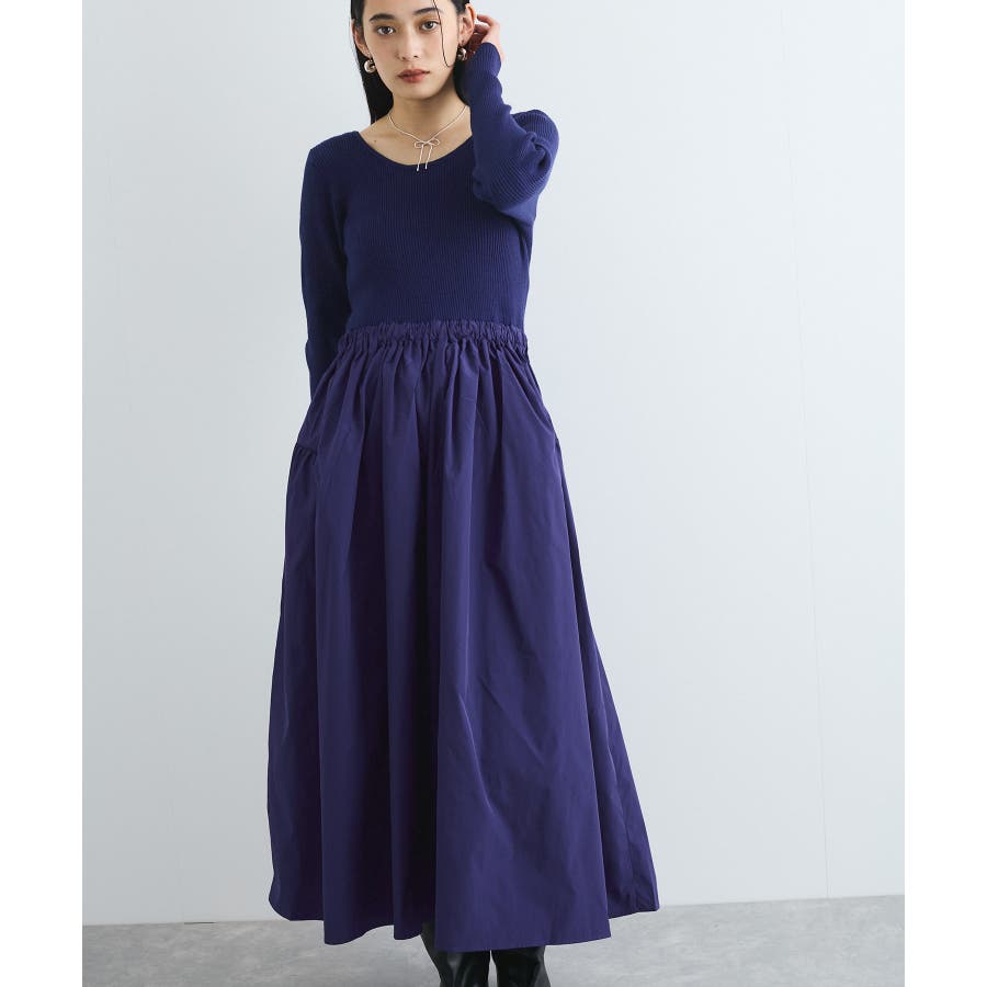【デザイン・シルエット】 リブニットとタフタのドッキングワンピースです。