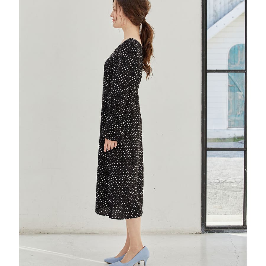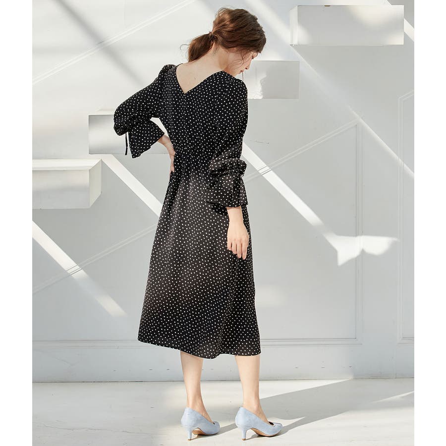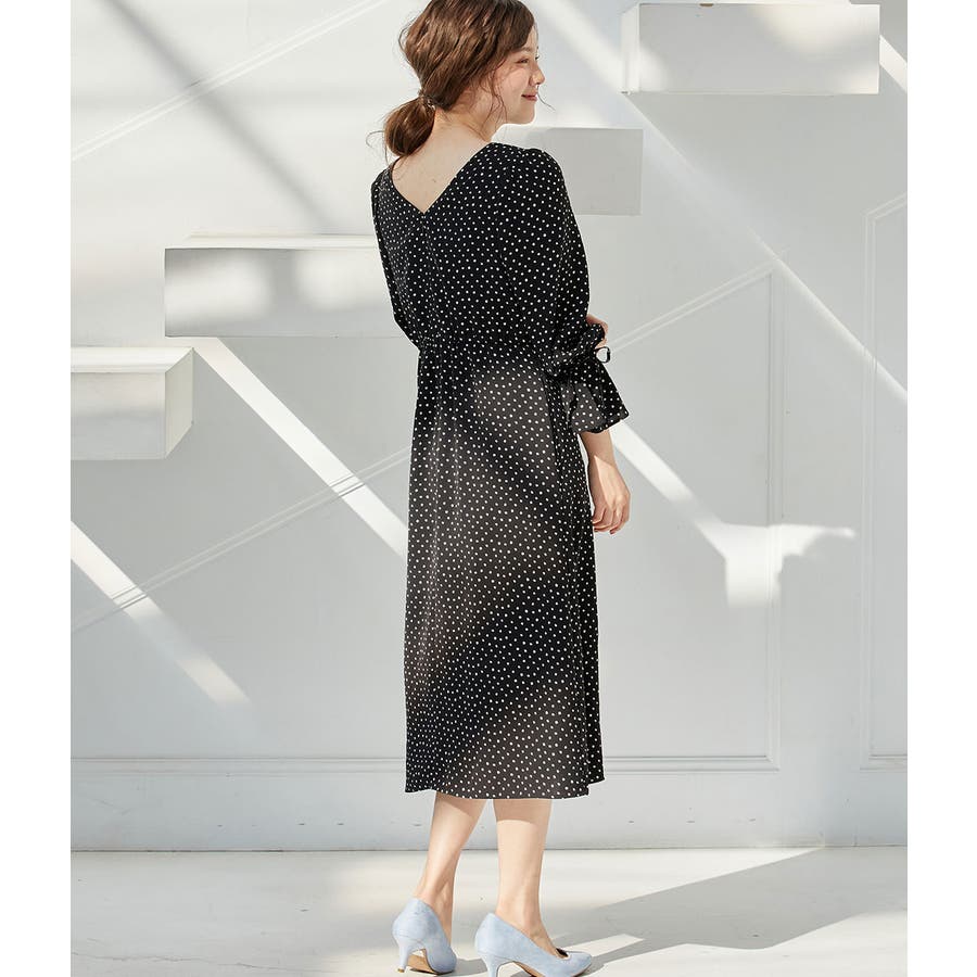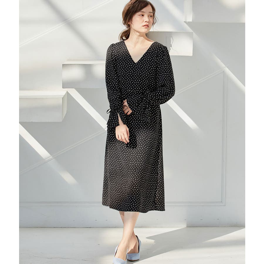 クラシックなムードのドット柄ワンピース。 ストンと落ちるナローシルエットで、大人な着こなしを演出します。 袖口にはギャザーを入れて、ちょこんとしたリボンをオン。 大胆に開く前後Vカットのネックにも注目です。