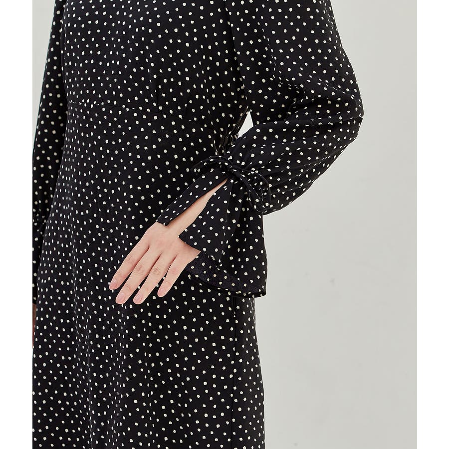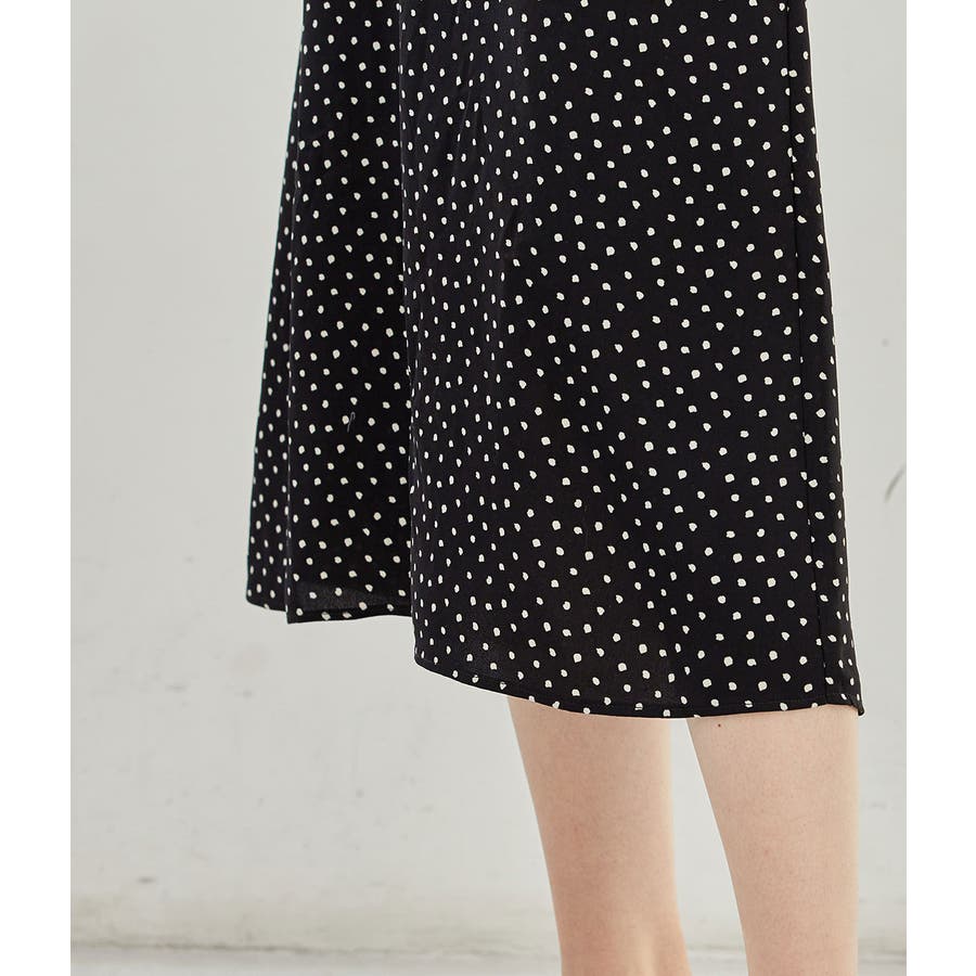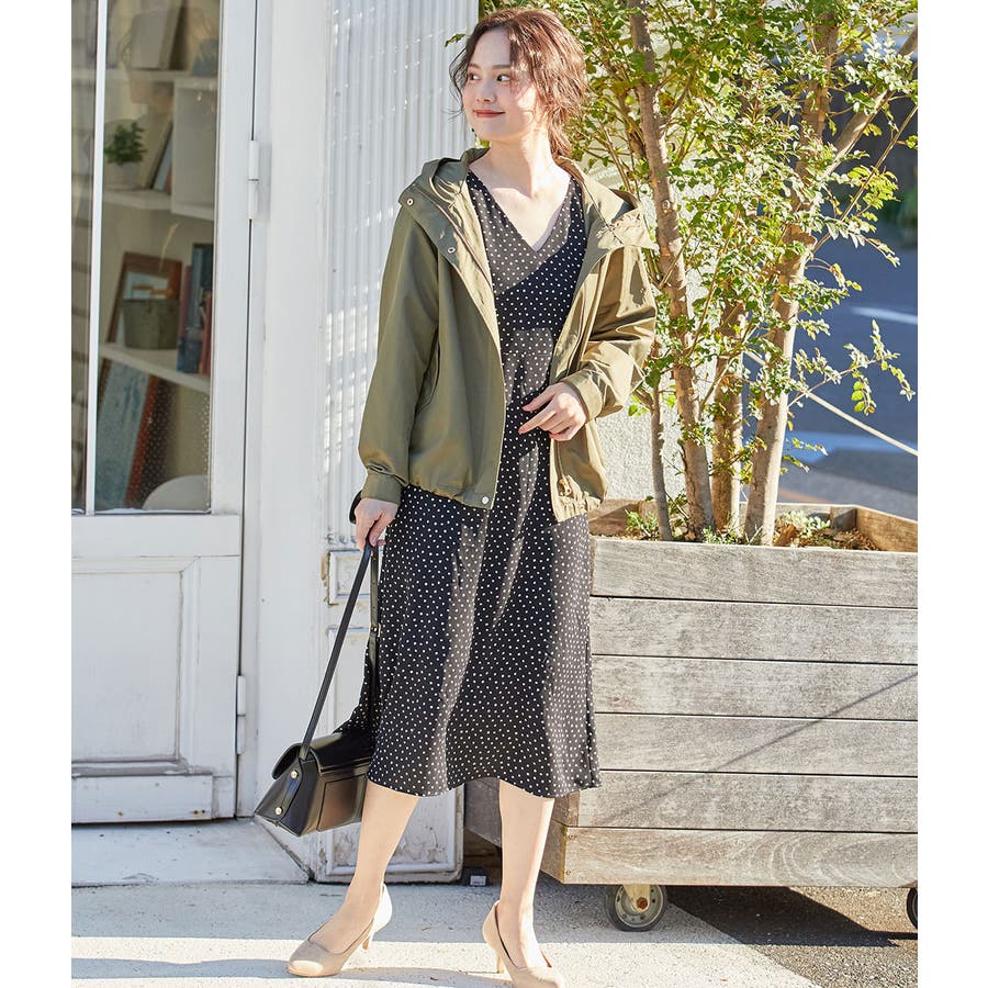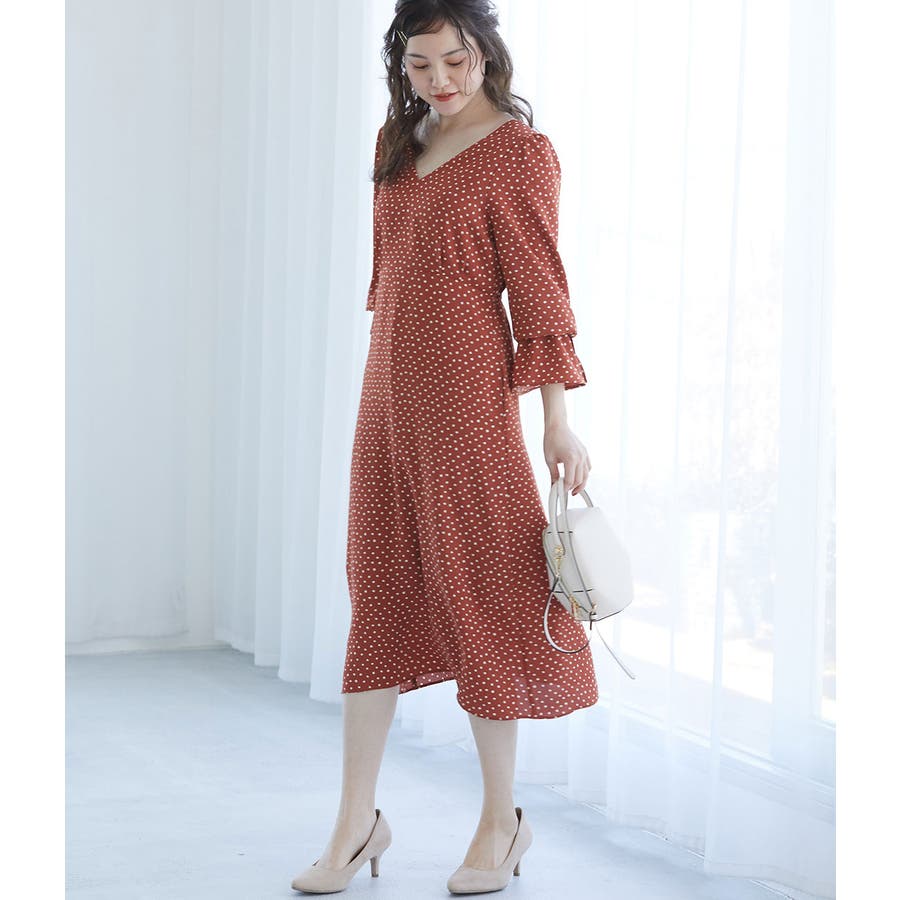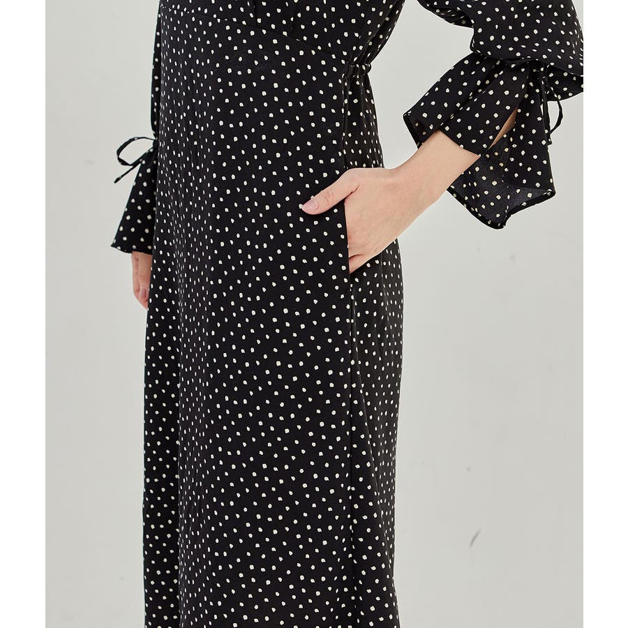 クラシックなムードのドット柄ワンピース。 ストンと落ちるナローシルエットで、大人な着こなしを演出します。 袖口にはギャザーを入れて、ちょこんとしたリボンをオン。 大胆に開く前後Vカットのネックにも注目です。