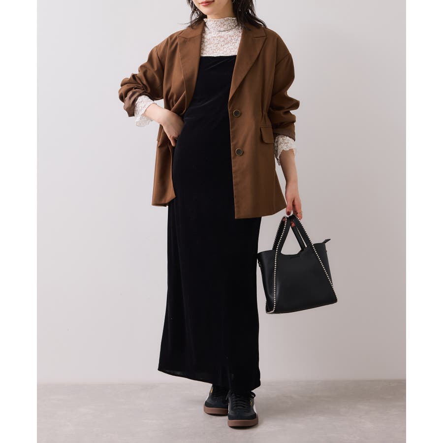 ベロアの生地を活かして、インナーはTシャツからリブニットまで様々な合わせが出来ます。