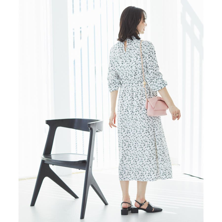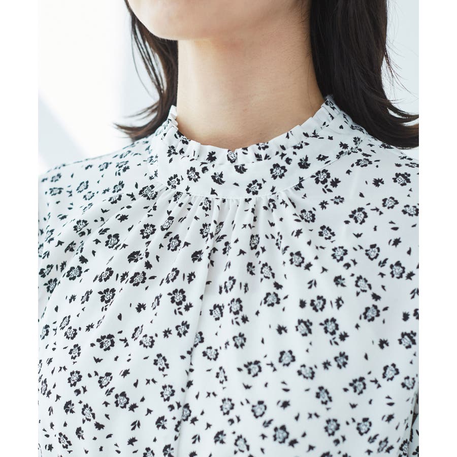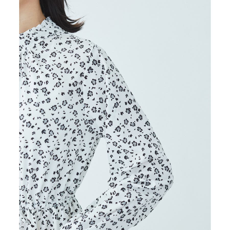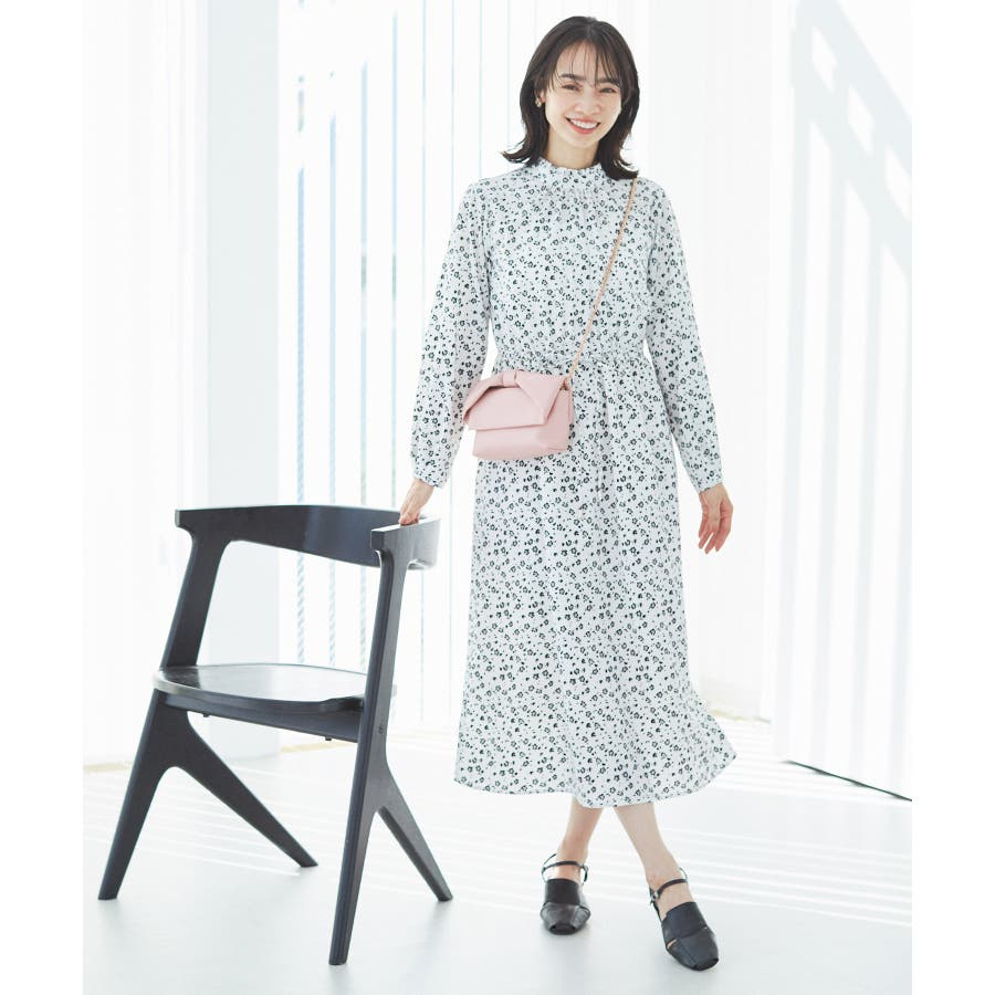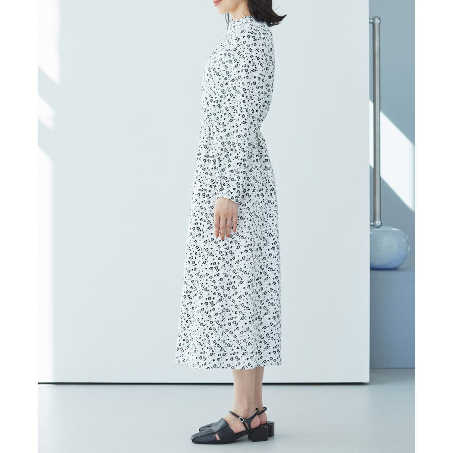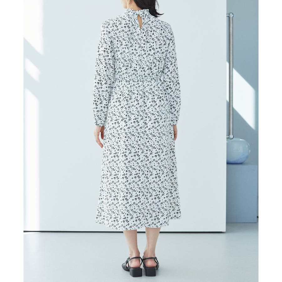 【ホワイト系(11)】【一部店舗/WEB限定】【洗える】ハイネックフリルフラワープリントワンピース