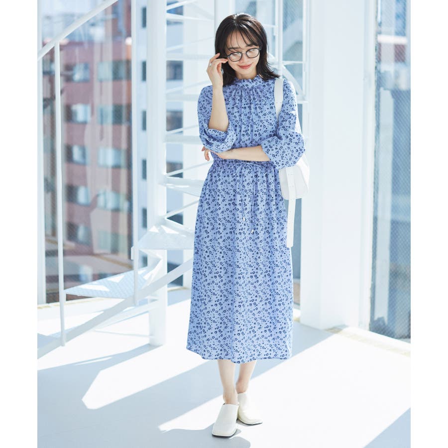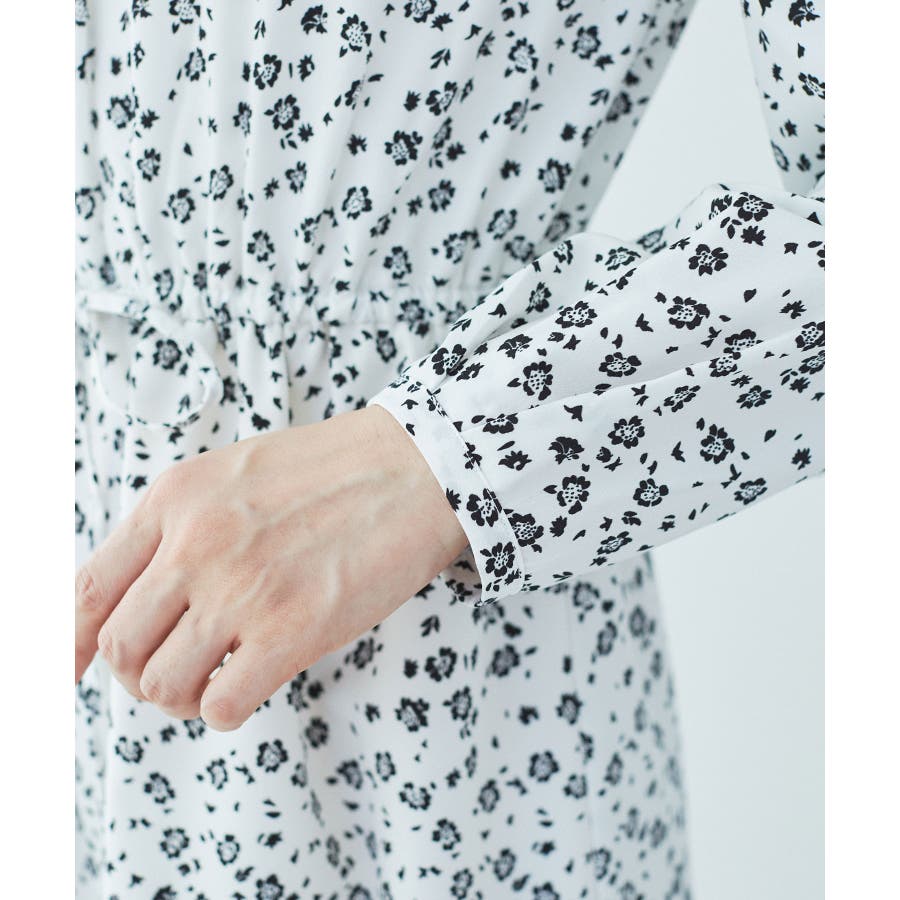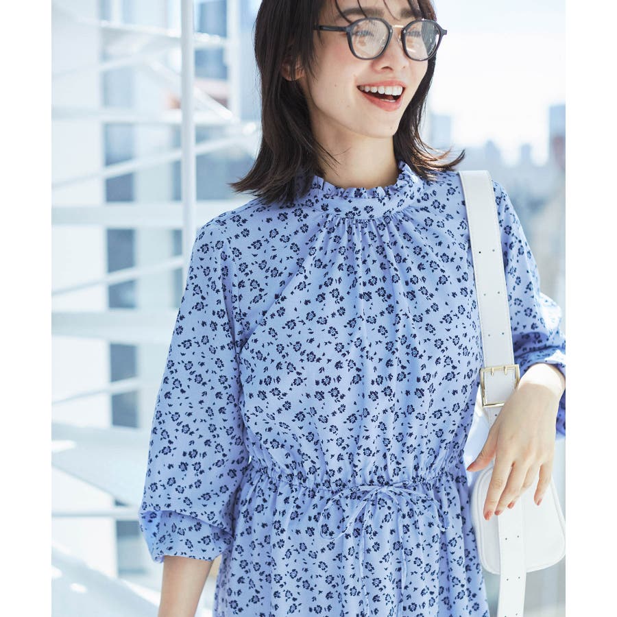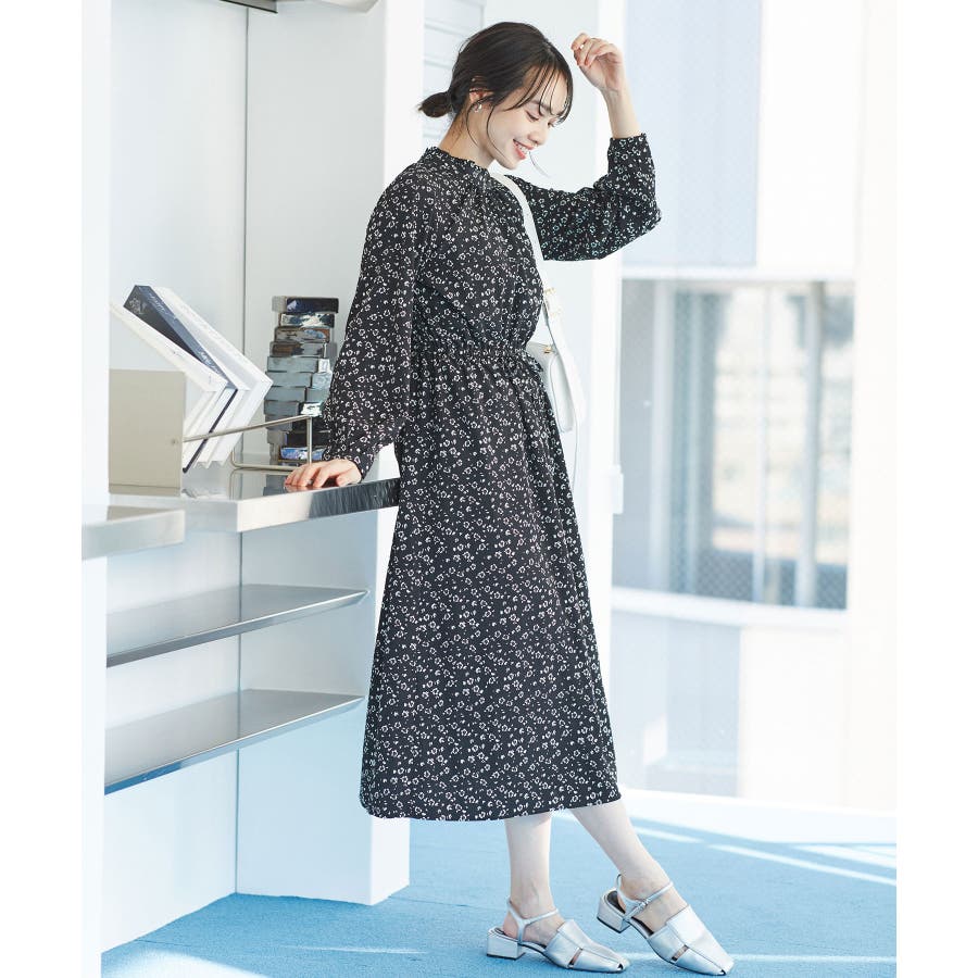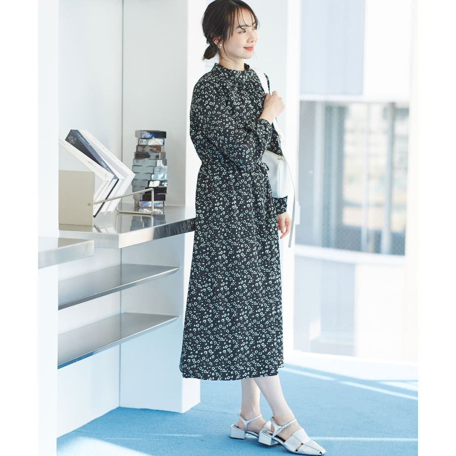 【ホワイト系(11)】【一部店舗/WEB限定】【洗える】ハイネックフリルフラワープリントワンピース