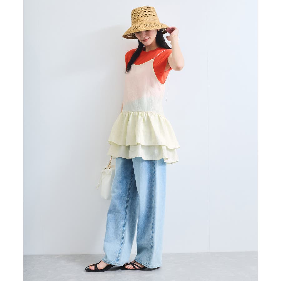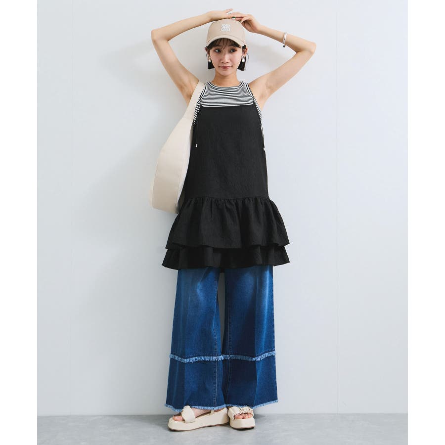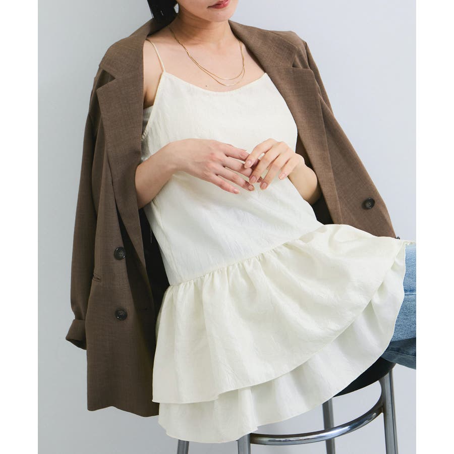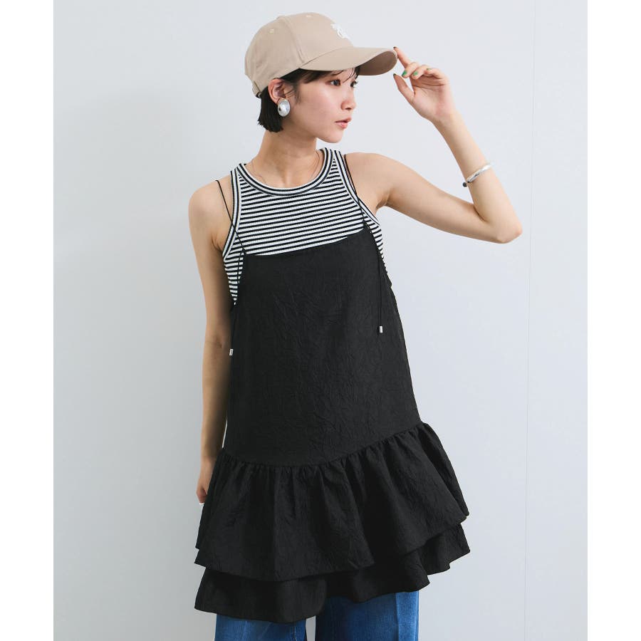 華奢な肩紐と、ふんわりと広がるティアードフリルが魅力のキャミチュニックワンピース。