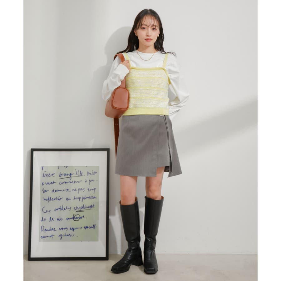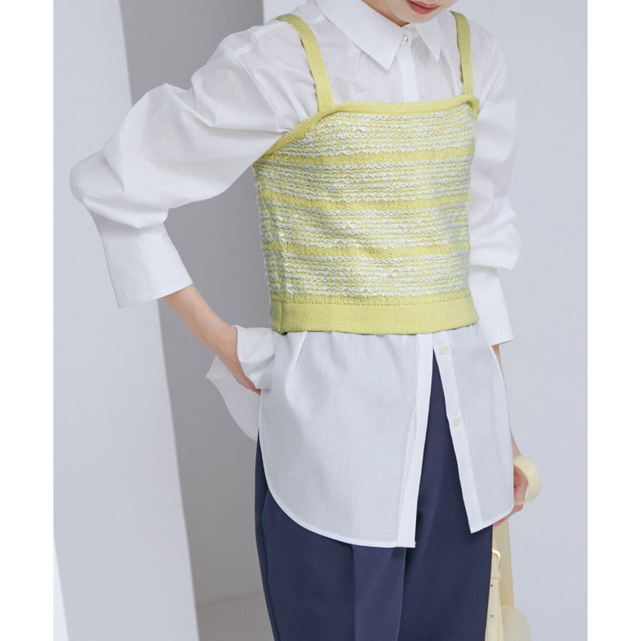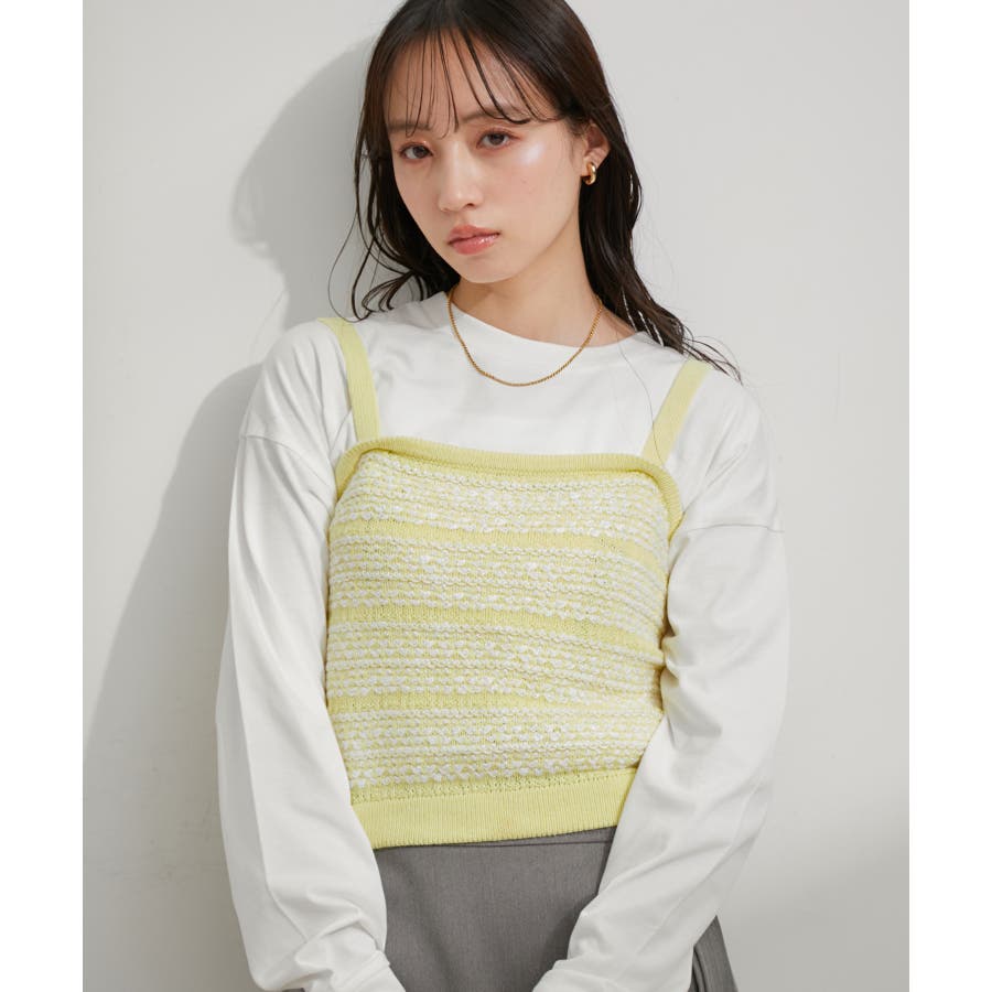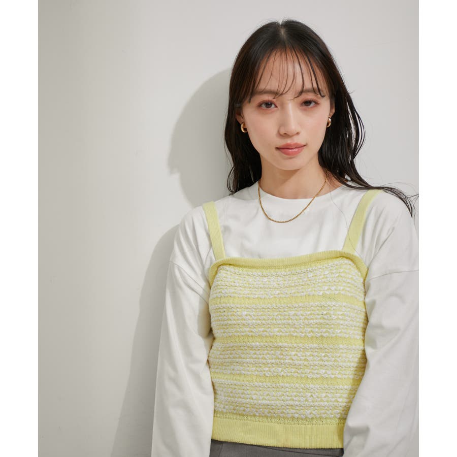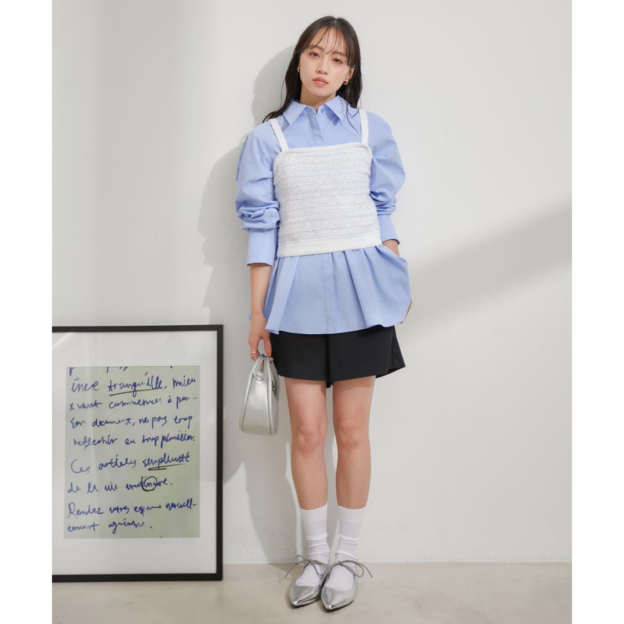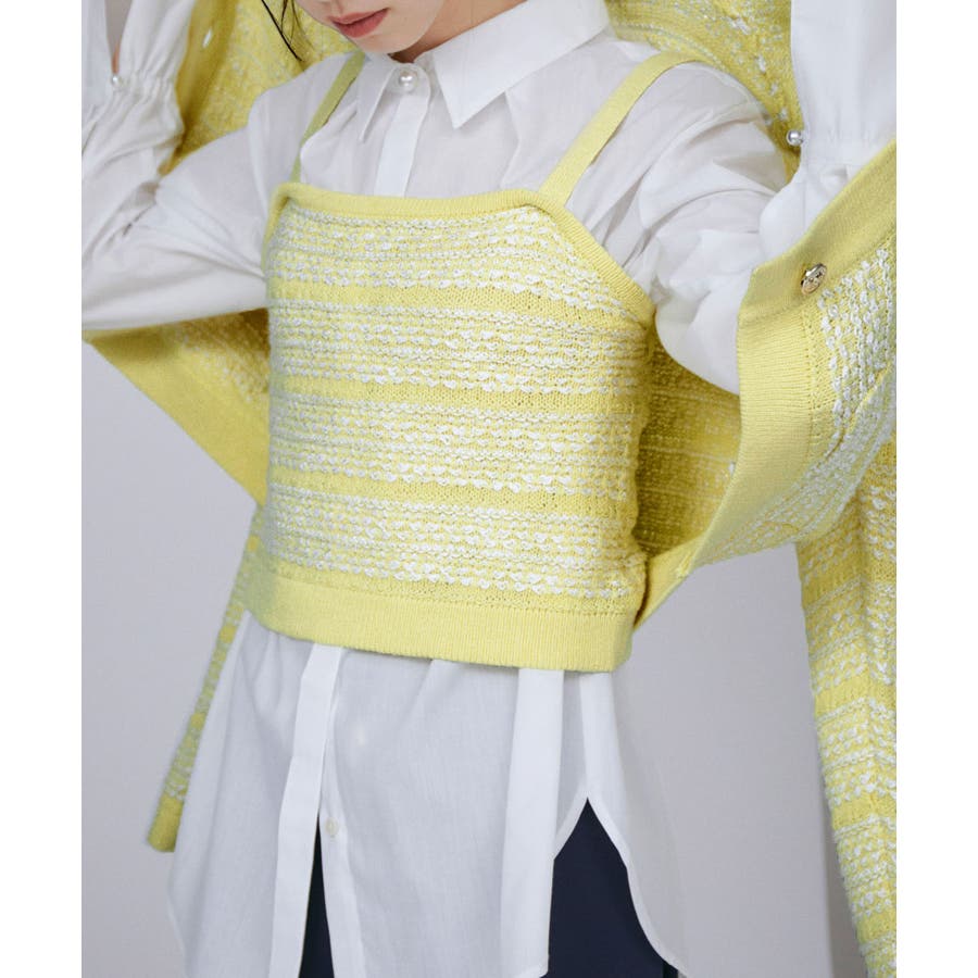 【デザイン・シルエット】 いろいろなレイヤードスタイルが楽しめるビスチェ。 ツイードデザインでトレンド感も出て新鮮な印象に!