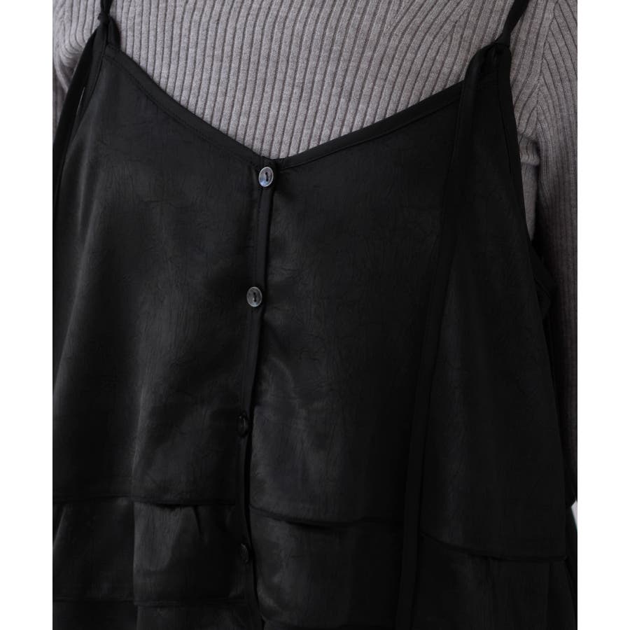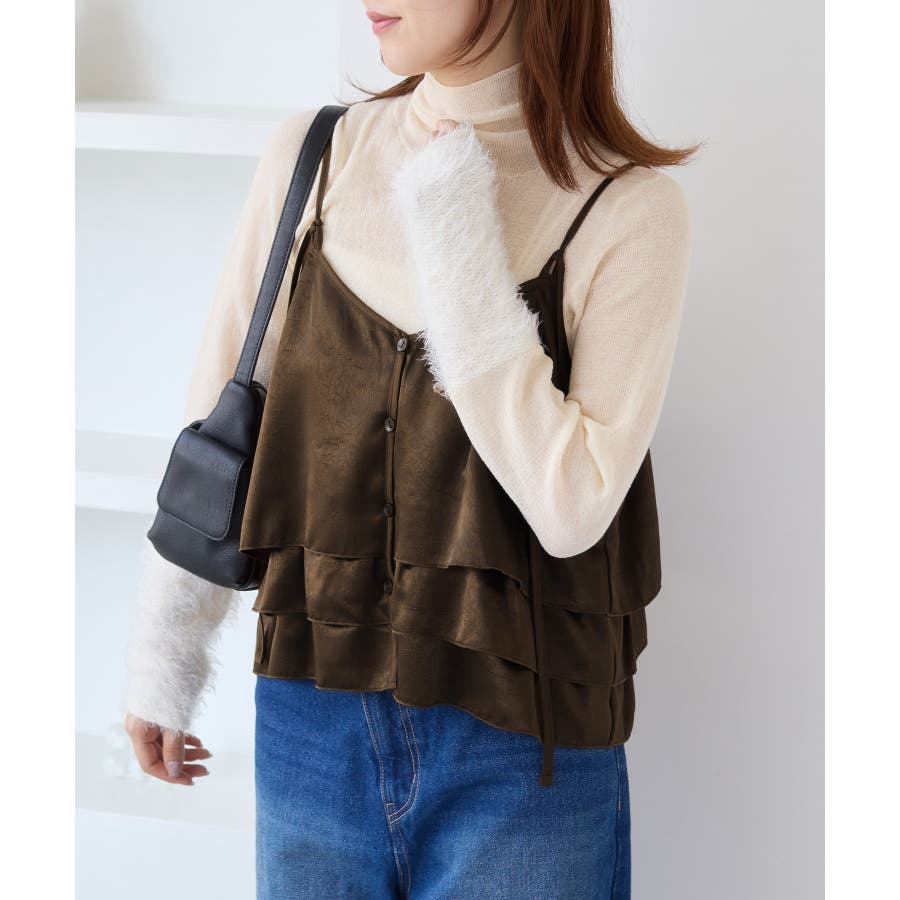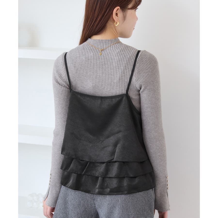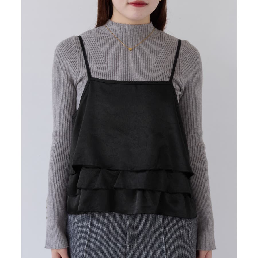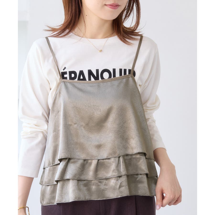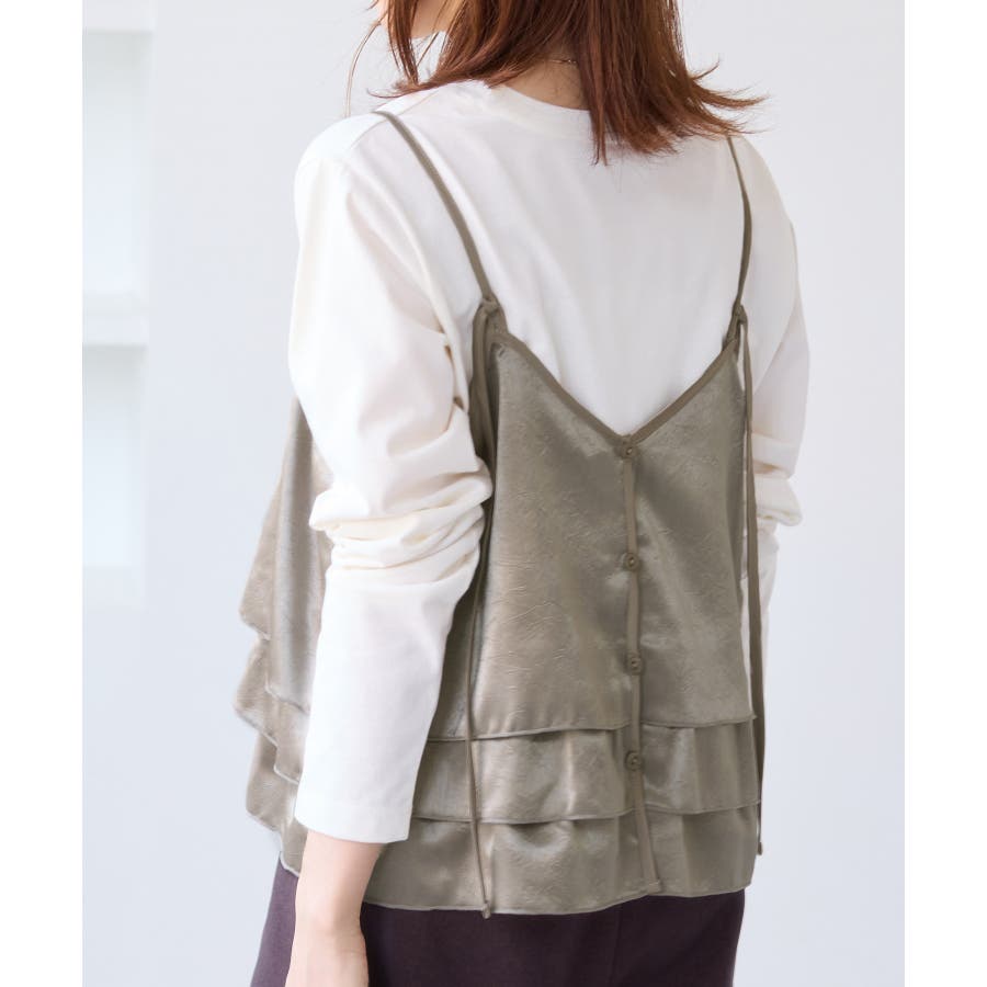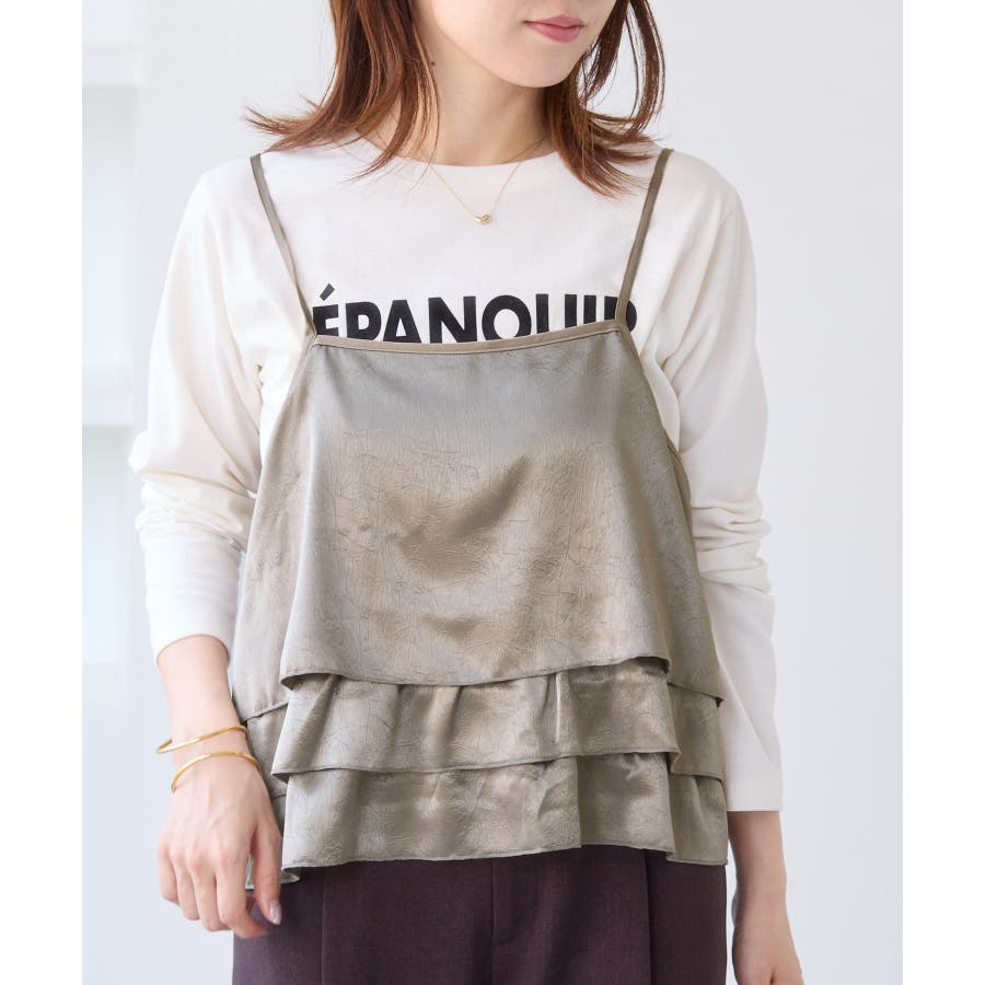 段になったフリルが立体的で、動くたびに表情を変えます。華奢なストラップで肩まわりはすっきりと見せ、インナーとのレイヤードもしやすいデザインに。コンパクトな着丈なのでウエスト位置が高く見え、スタイルアップ効果も期待できます。