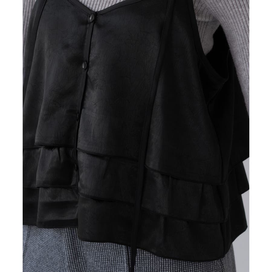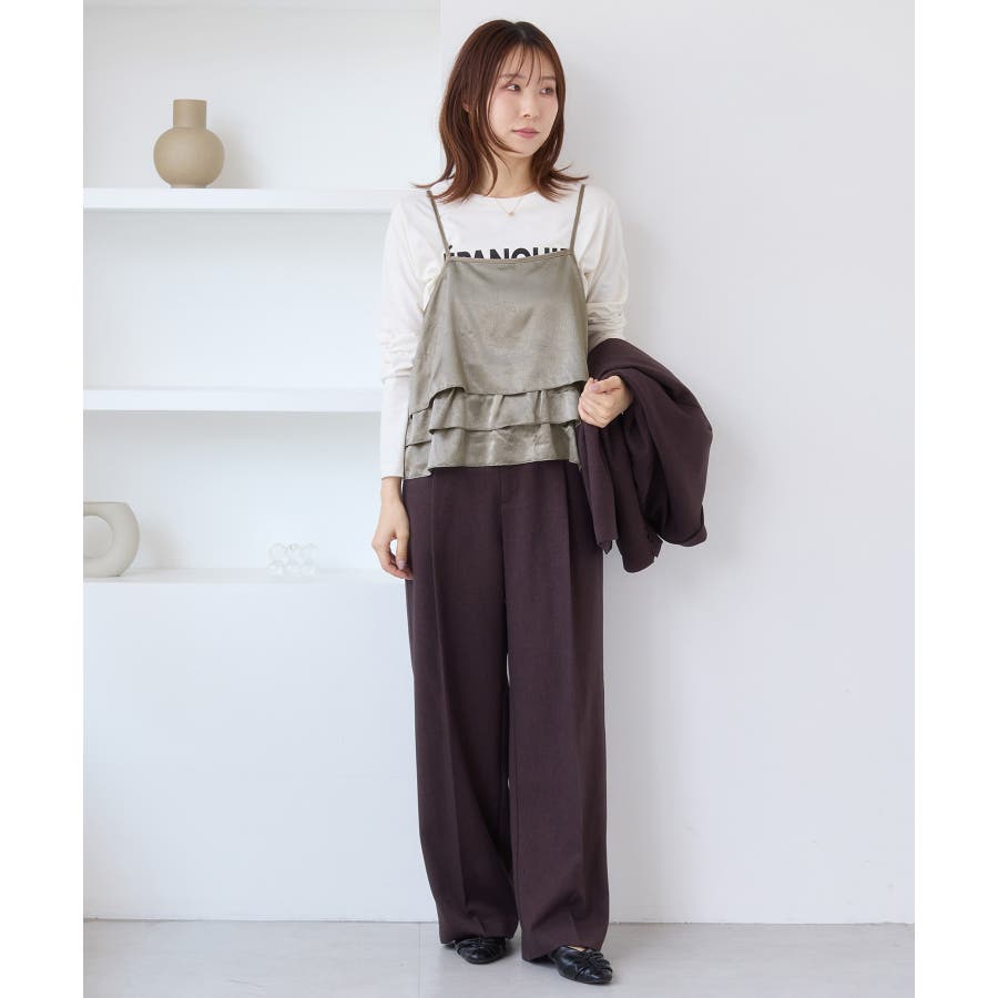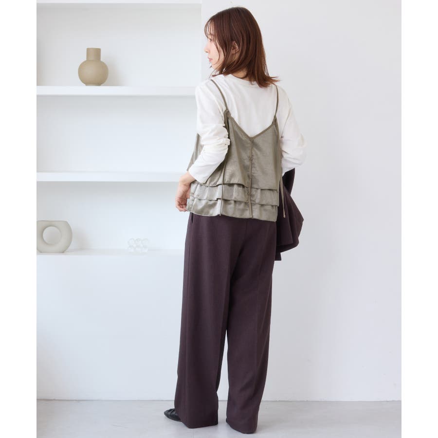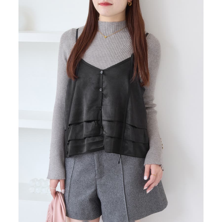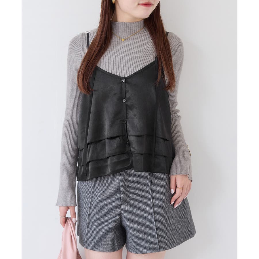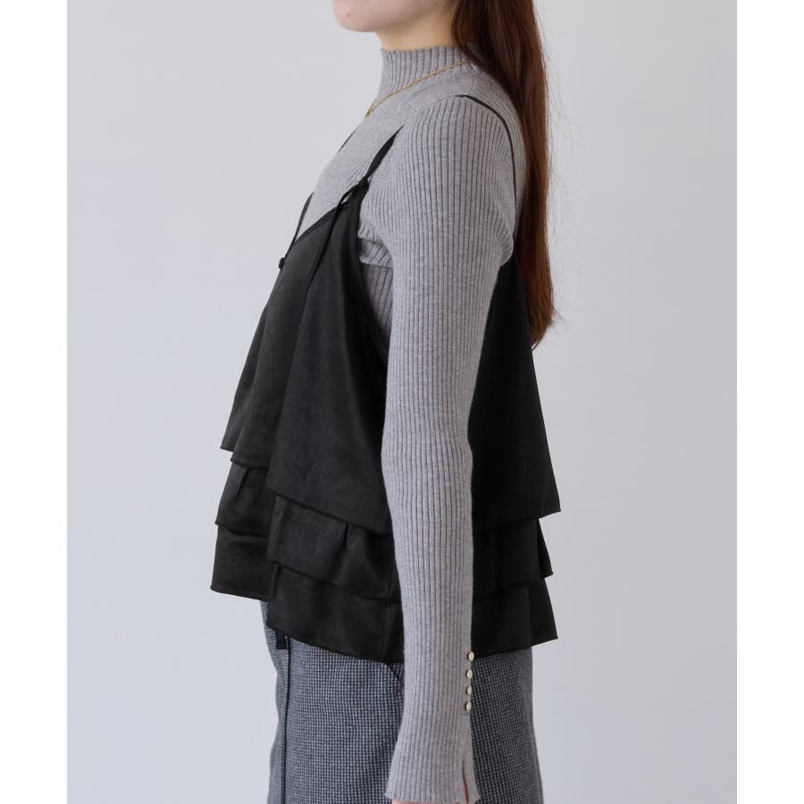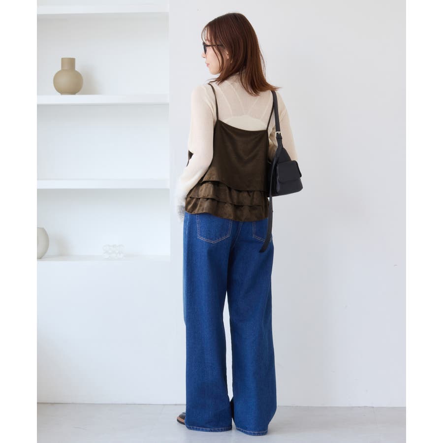 段になったフリルが立体的で、動くたびに表情を変えます。華奢なストラップで肩まわりはすっきりと見せ、インナーとのレイヤードもしやすいデザインに。コンパクトな着丈なのでウエスト位置が高く見え、スタイルアップ効果も期待できます。