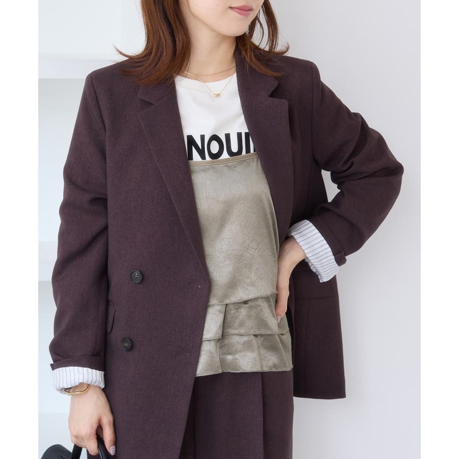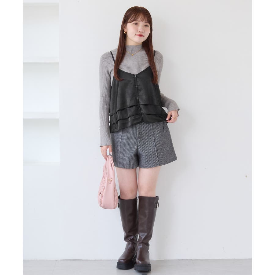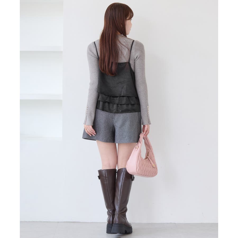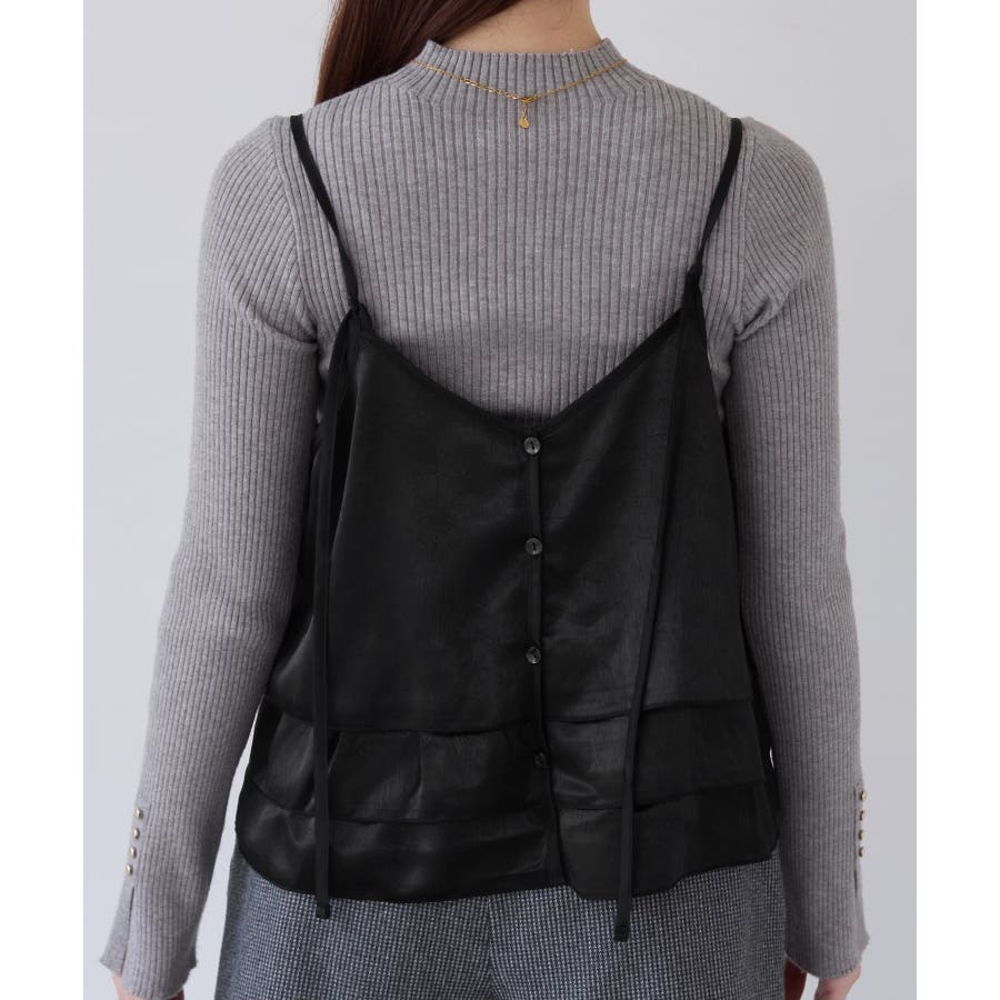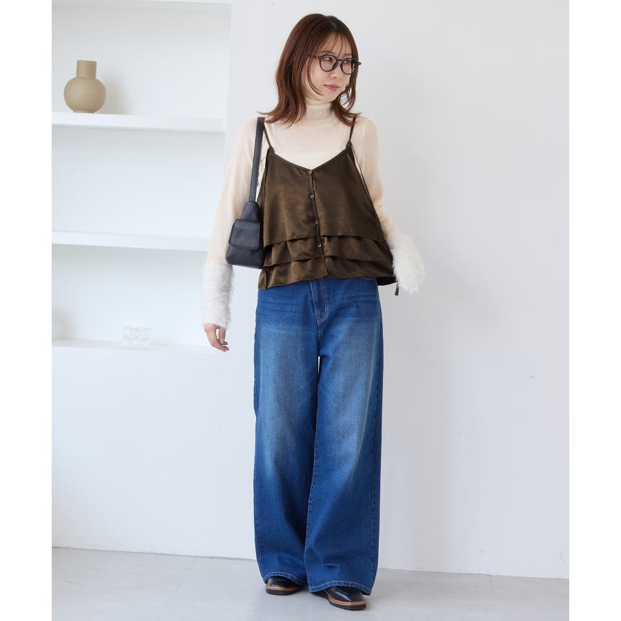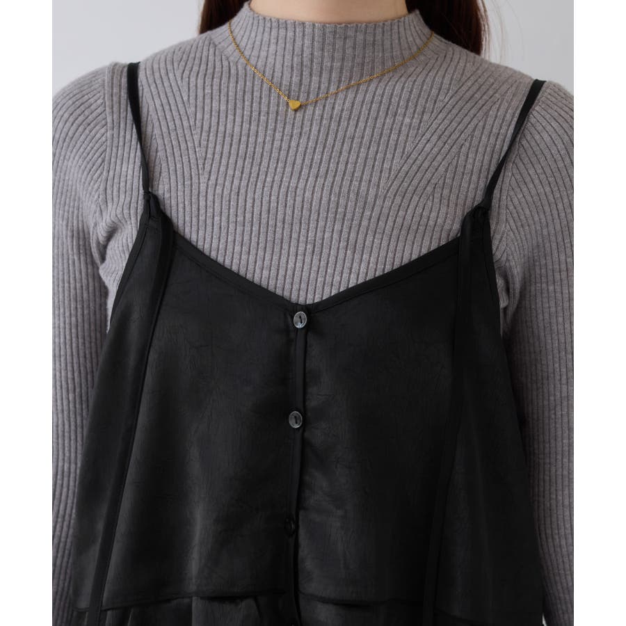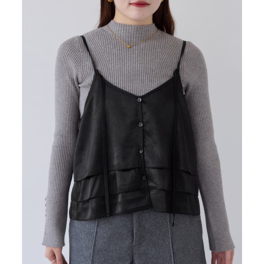 段になったフリルが立体的で、動くたびに表情を変えます。華奢なストラップで肩まわりはすっきりと見せ、インナーとのレイヤードもしやすいデザインに。コンパクトな着丈なのでウエスト位置が高く見え、スタイルアップ効果も期待できます。