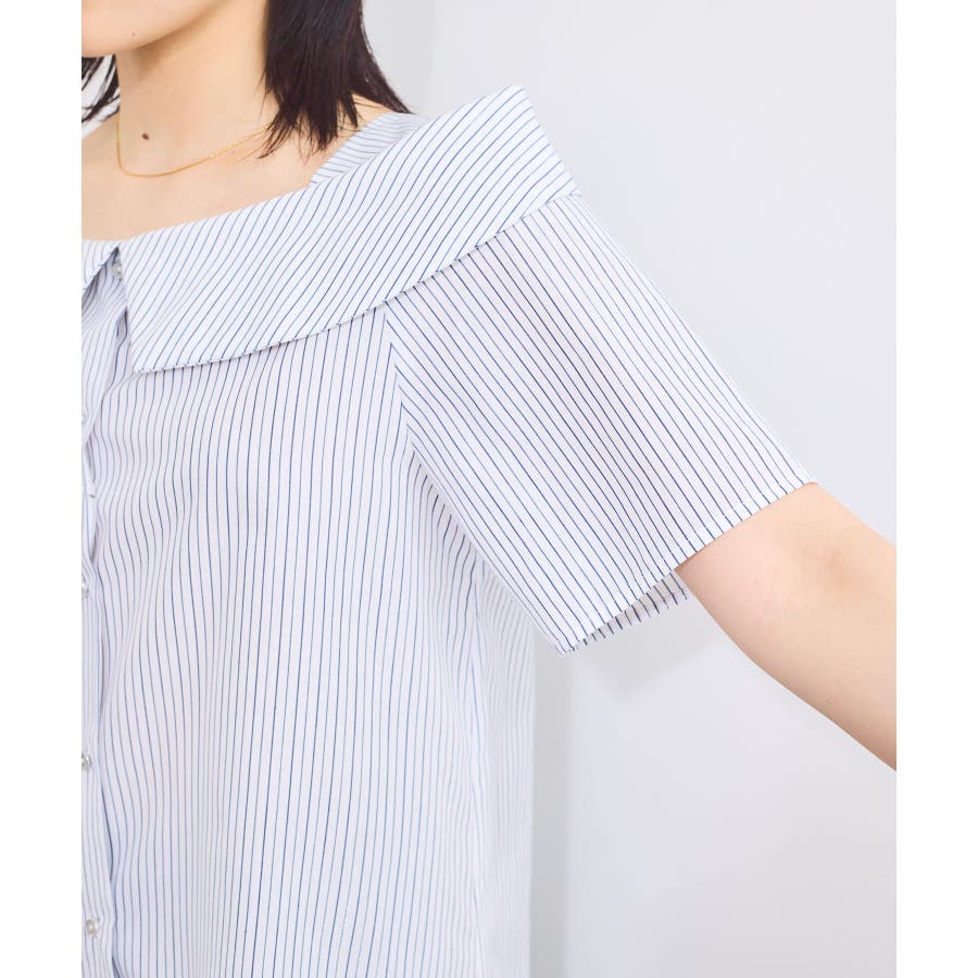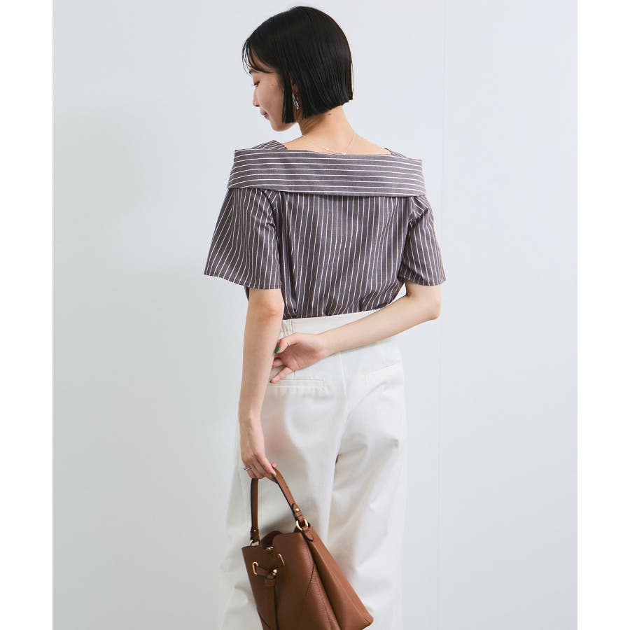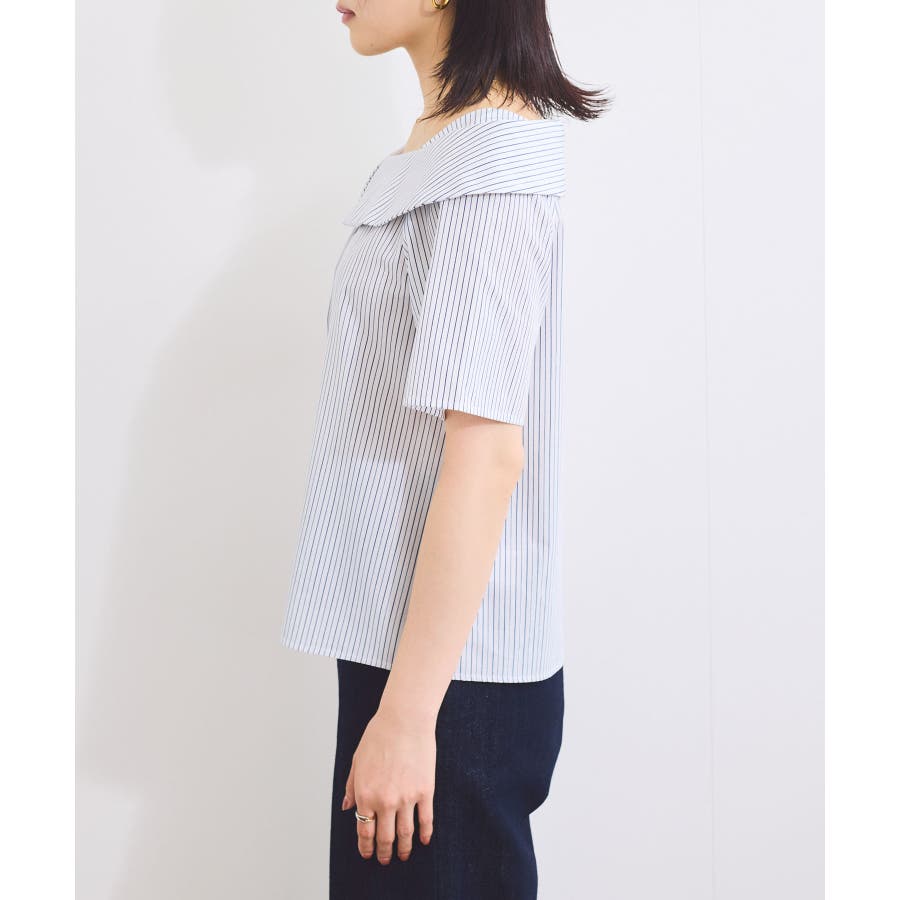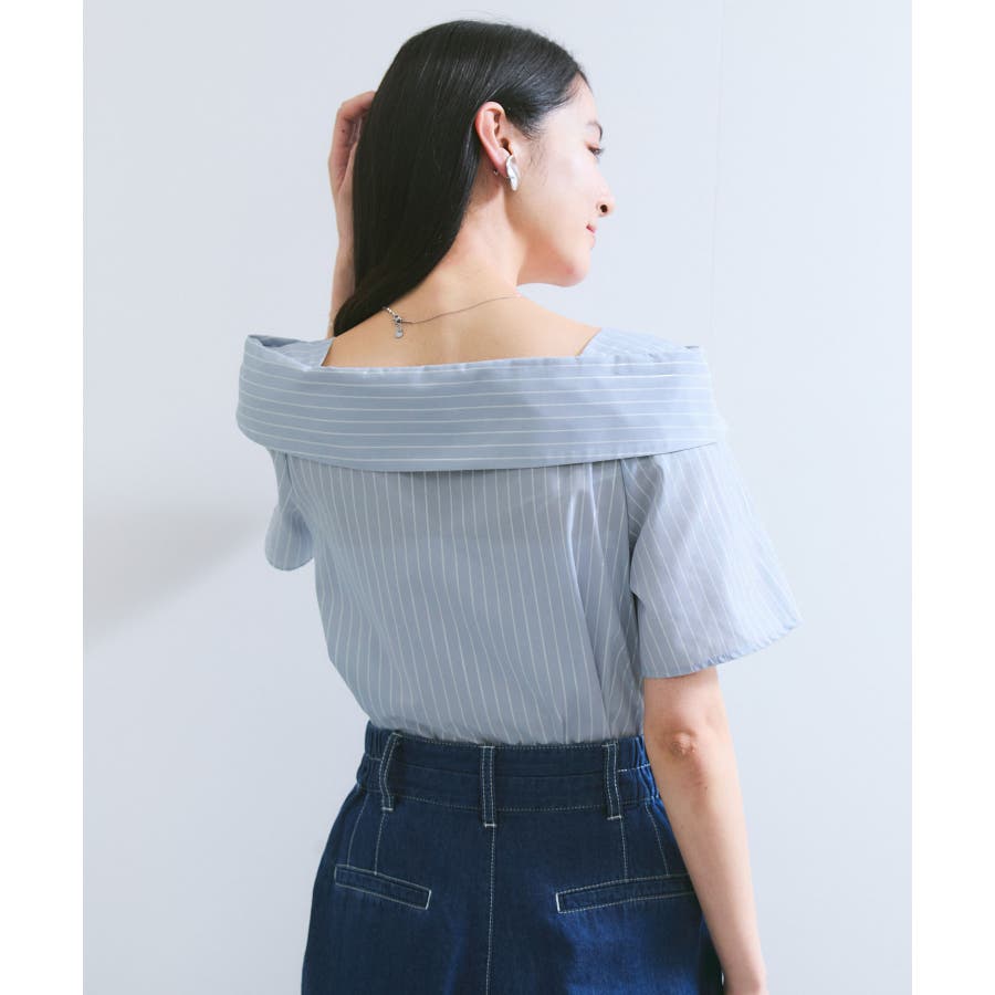 【新色追加】【防シワ】ラメミックスオフショルダー風ストライプシャツ