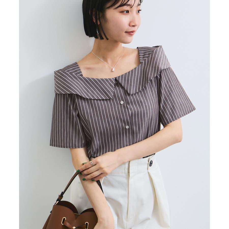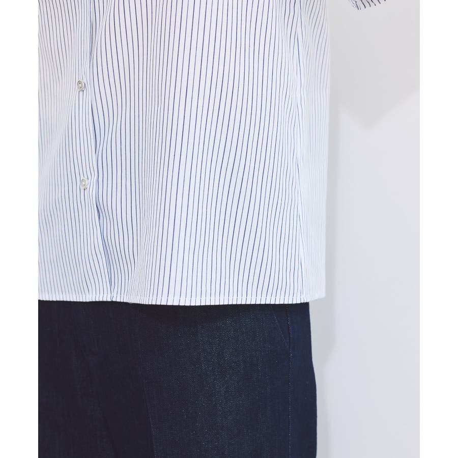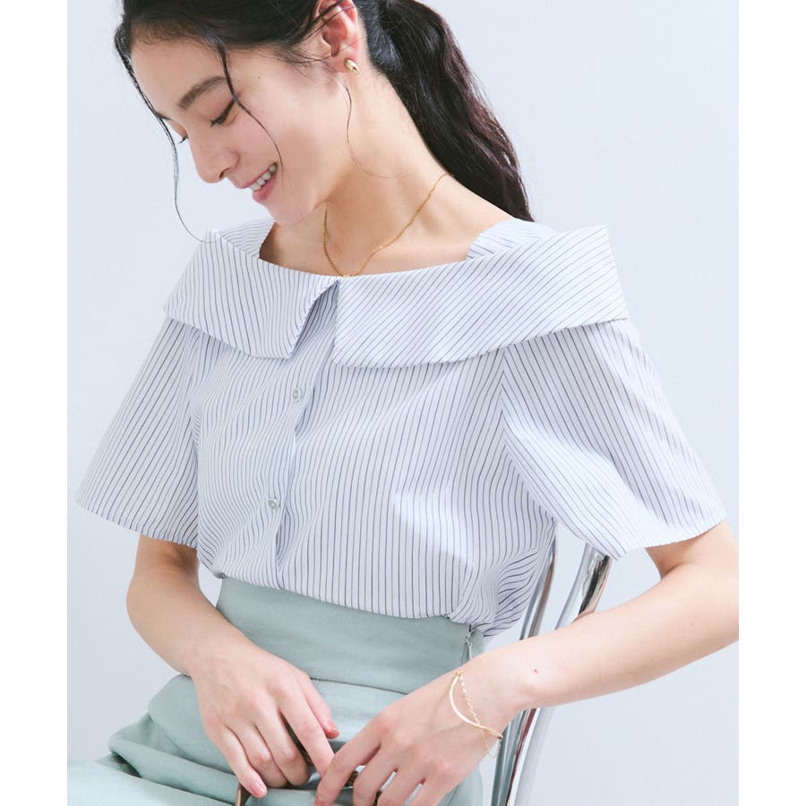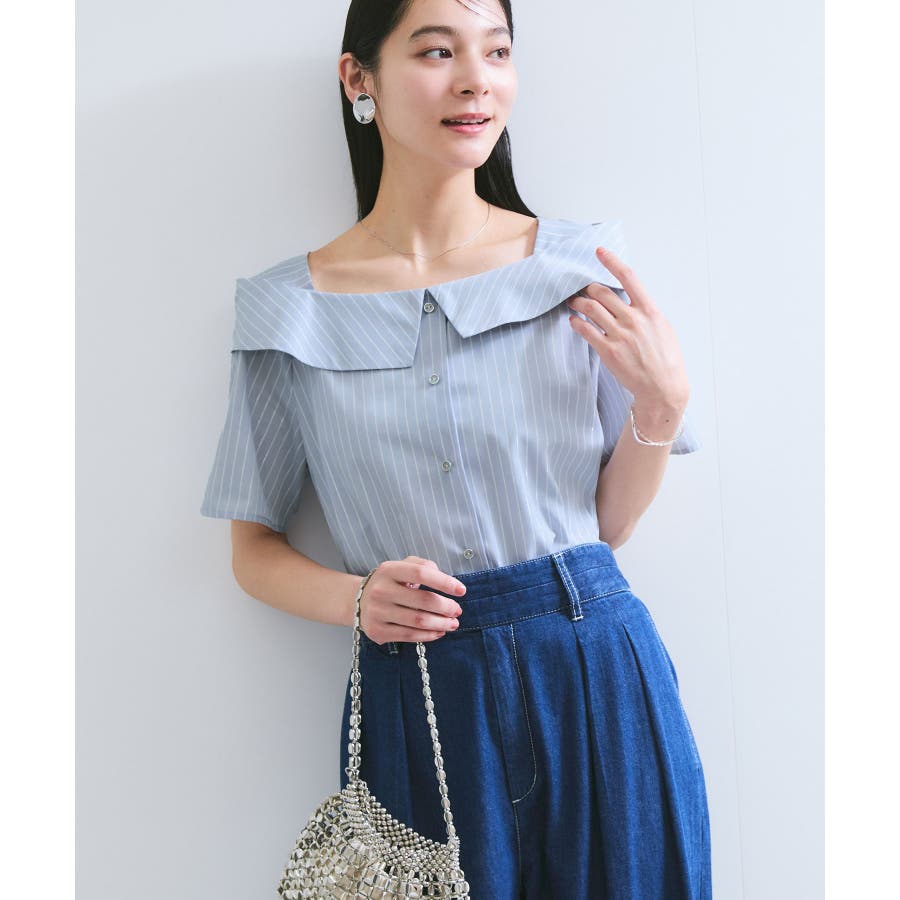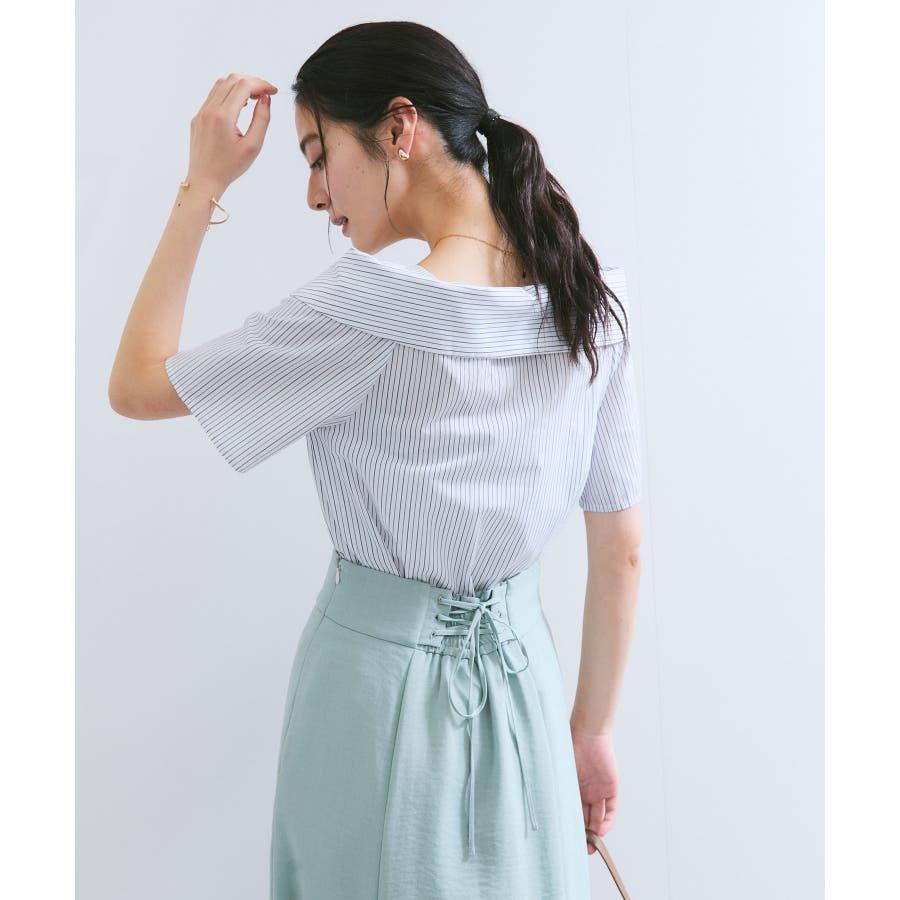 【新色追加】【防シワ】ラメミックスオフショルダー風ストライプシャツ