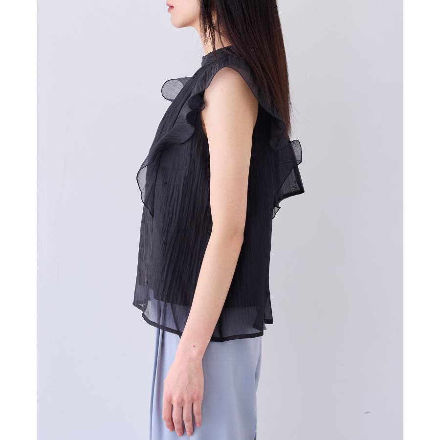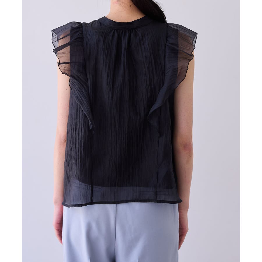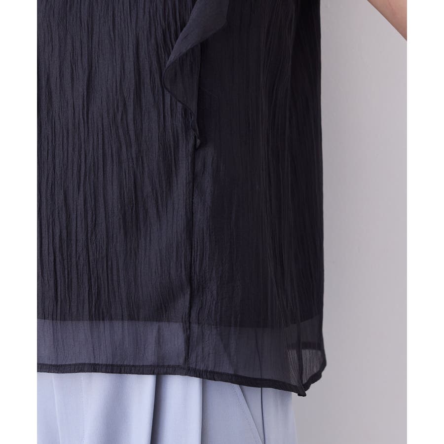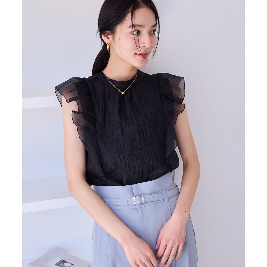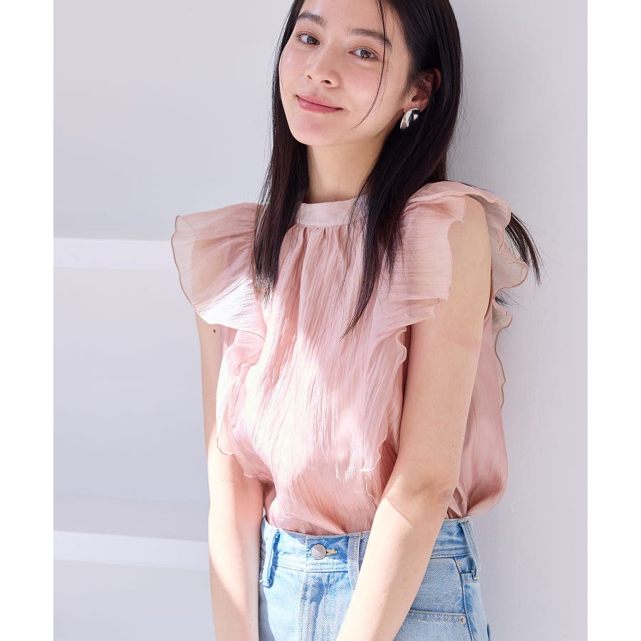 柔らかい風合いと艶のあるシャイニーシアー素材で華やかさを演出します。清涼感があり、レディライクなデザイントップスは夏服として大活躍間違いなし。