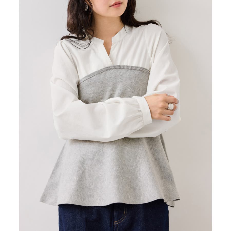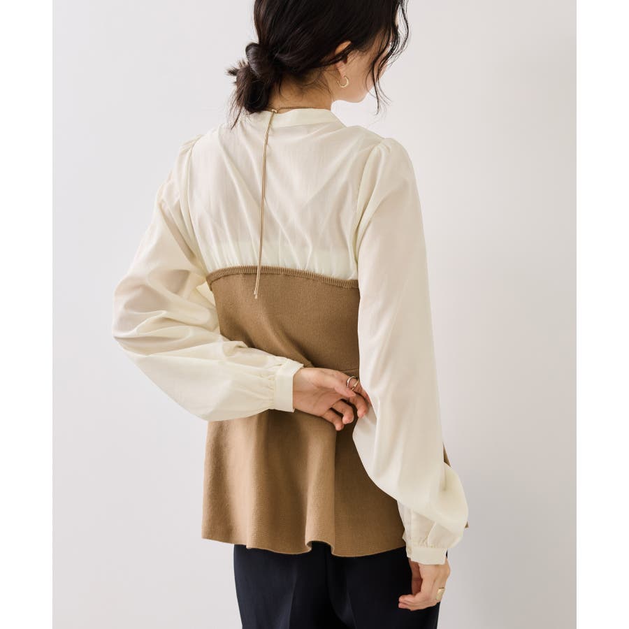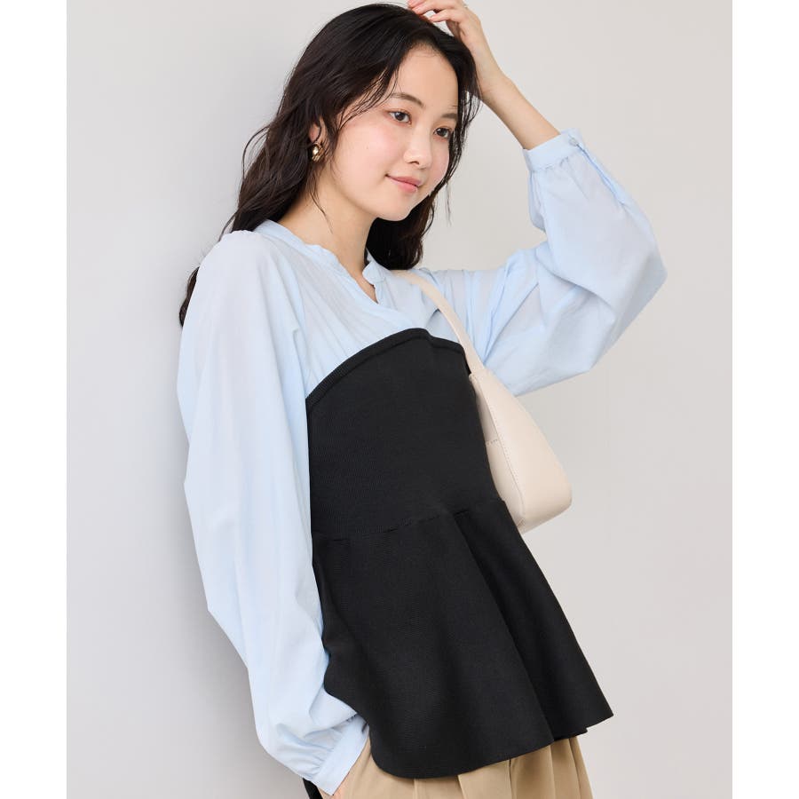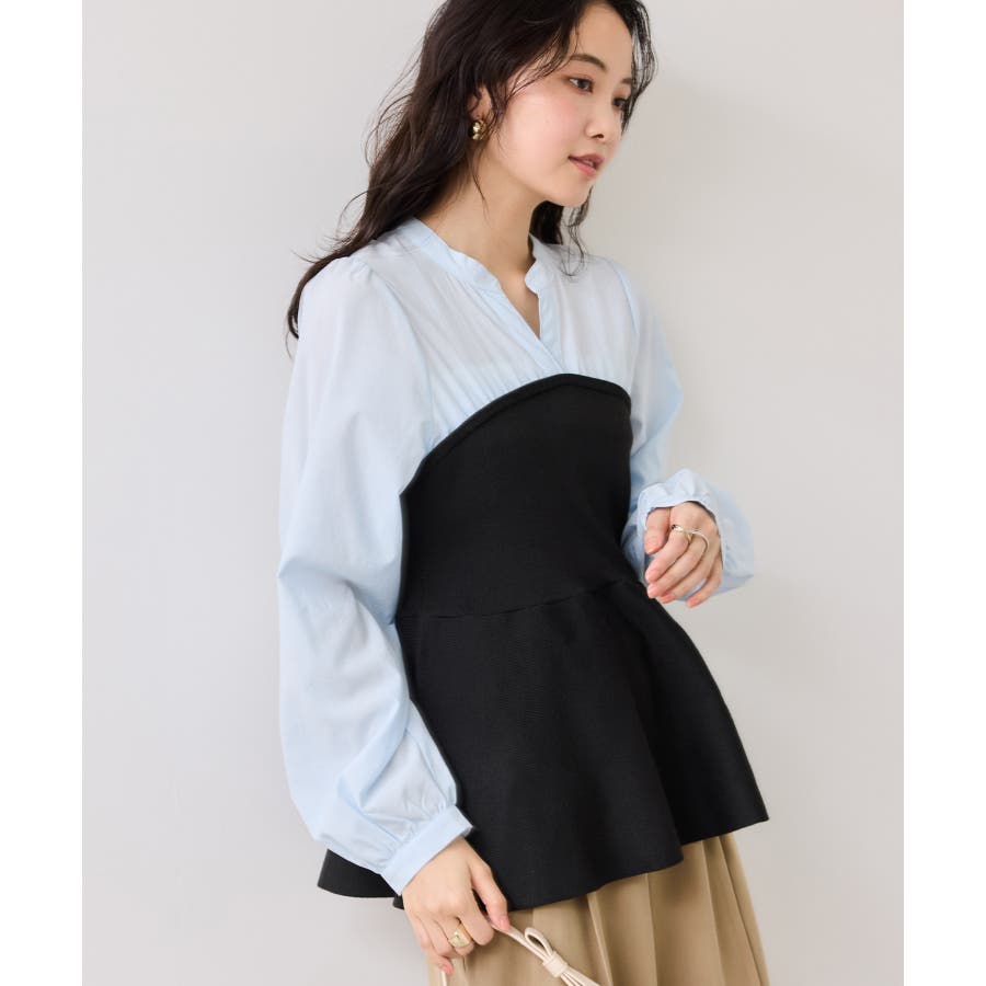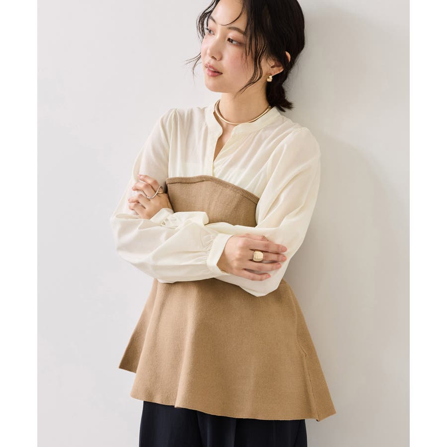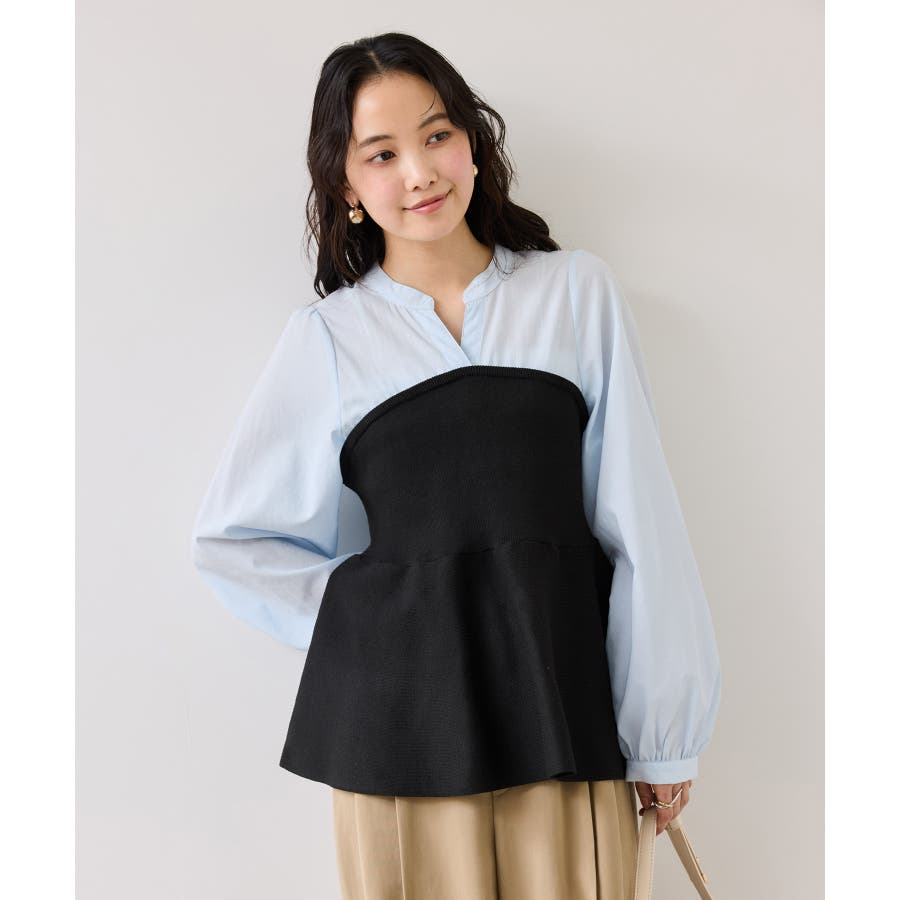 シンプルなデザインのキーネックブラウスにトレンドのペプラムニットをドッキングさせたニットドッキングブラウスです。気になる腰回りやお尻を綺麗に隠し、スタイルアップしてくれるデザインです。