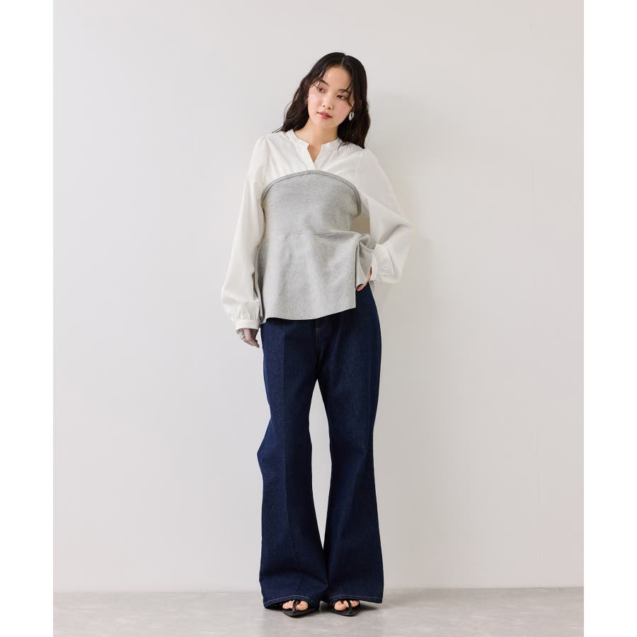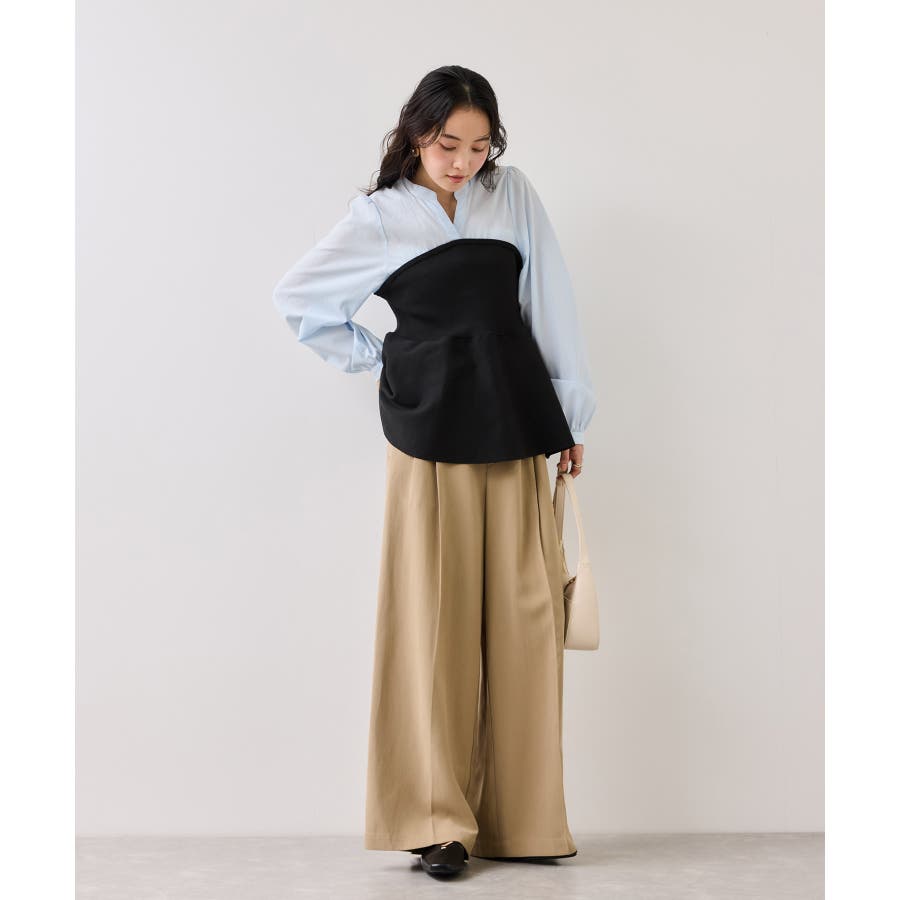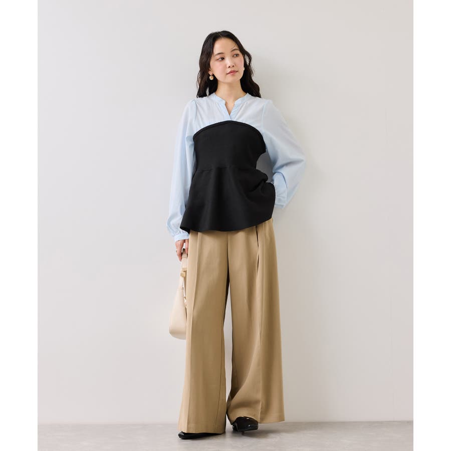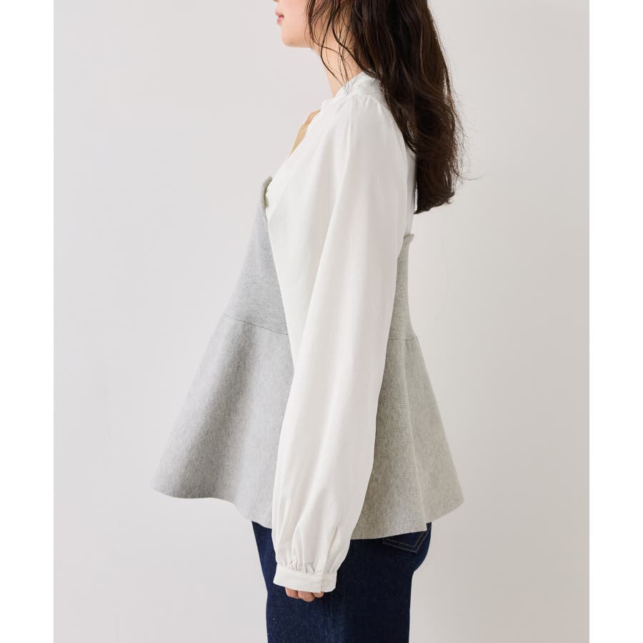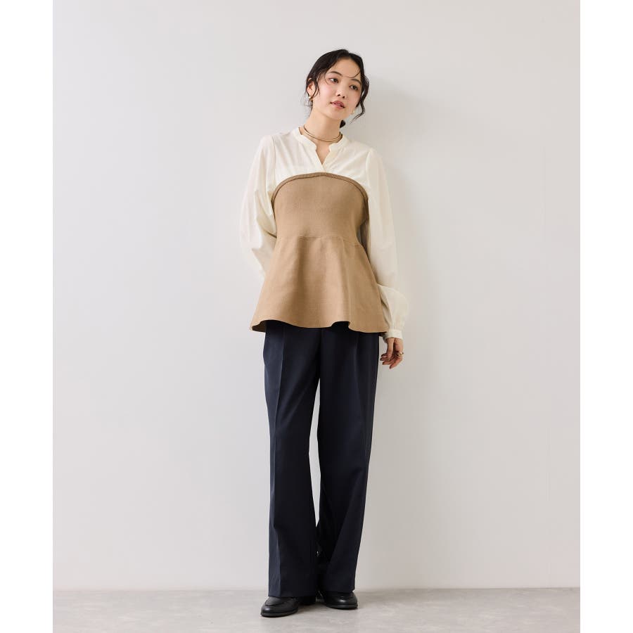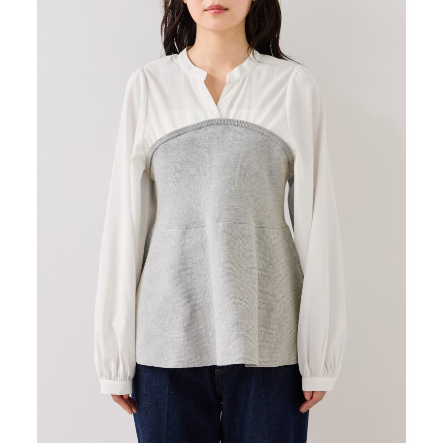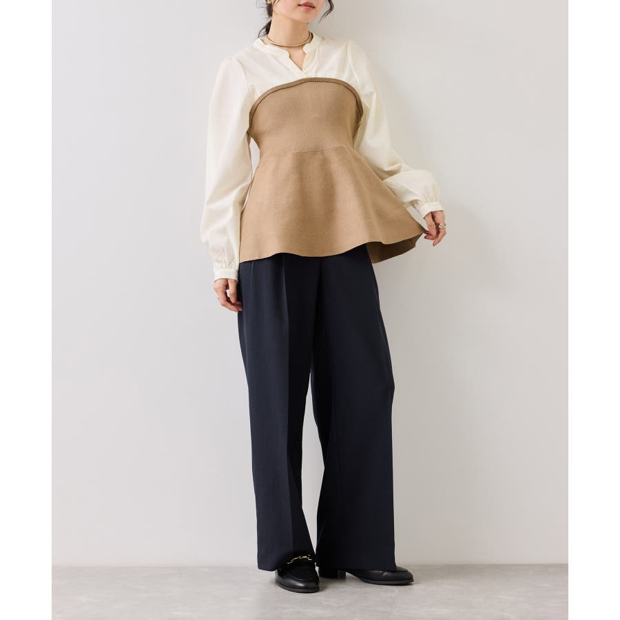 シンプルなデザインのキーネックブラウスにトレンドのペプラムニットをドッキングさせたニットドッキングブラウスです。気になる腰回りやお尻を綺麗に隠し、スタイルアップしてくれるデザインです。