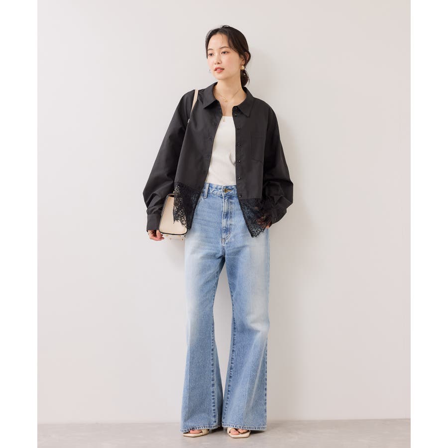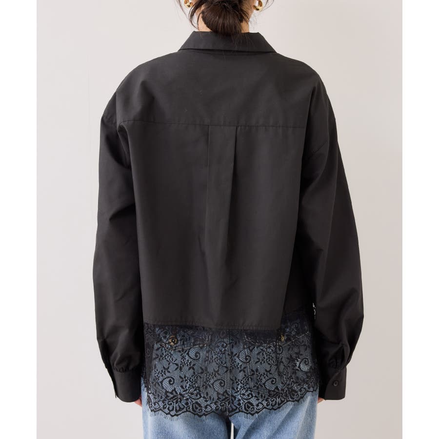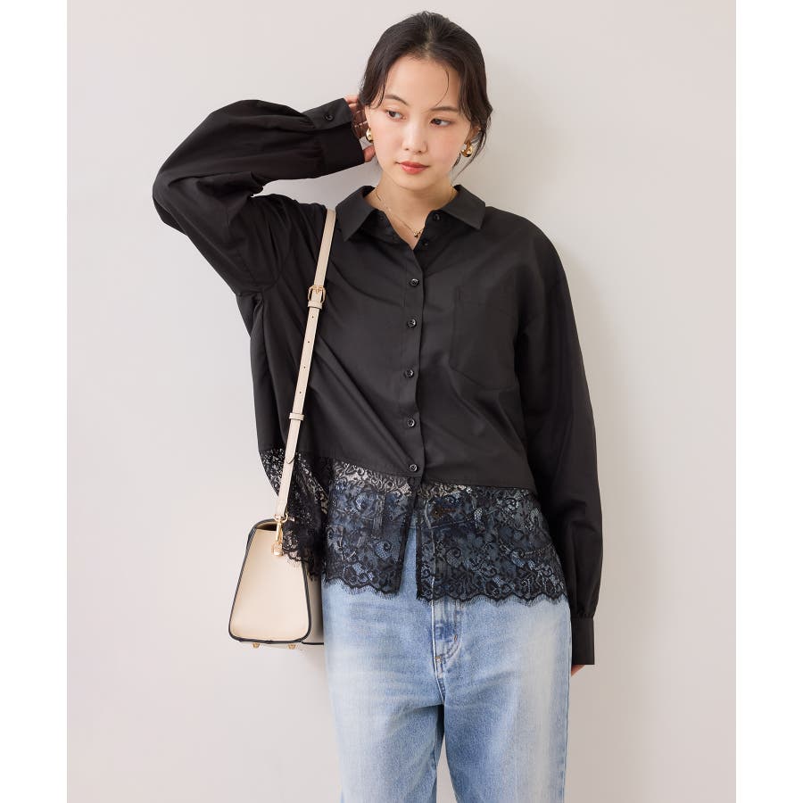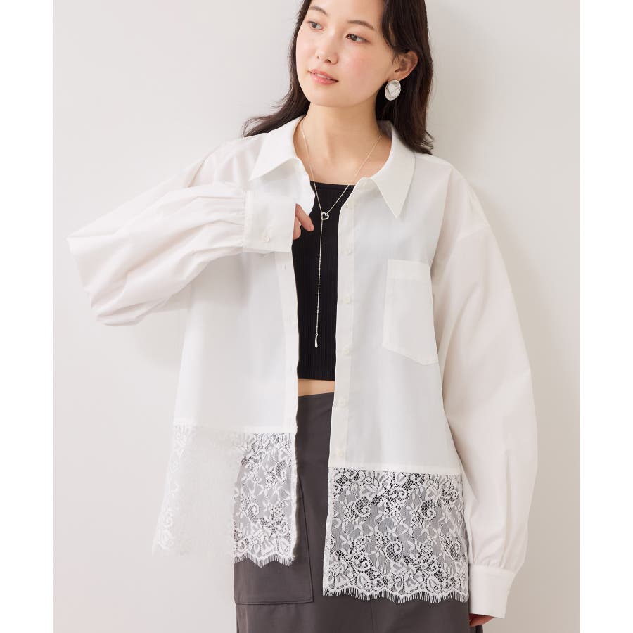 ぱりっとしたシャツ素材に繊細なレースがマッチしていて華やかなシャツです。