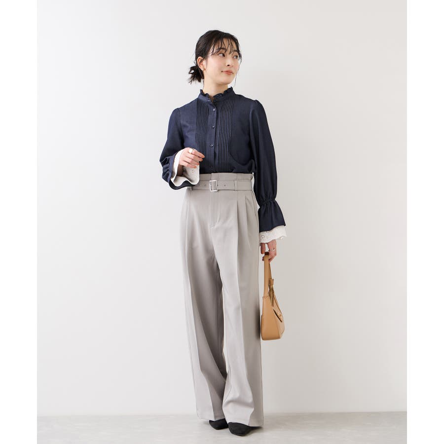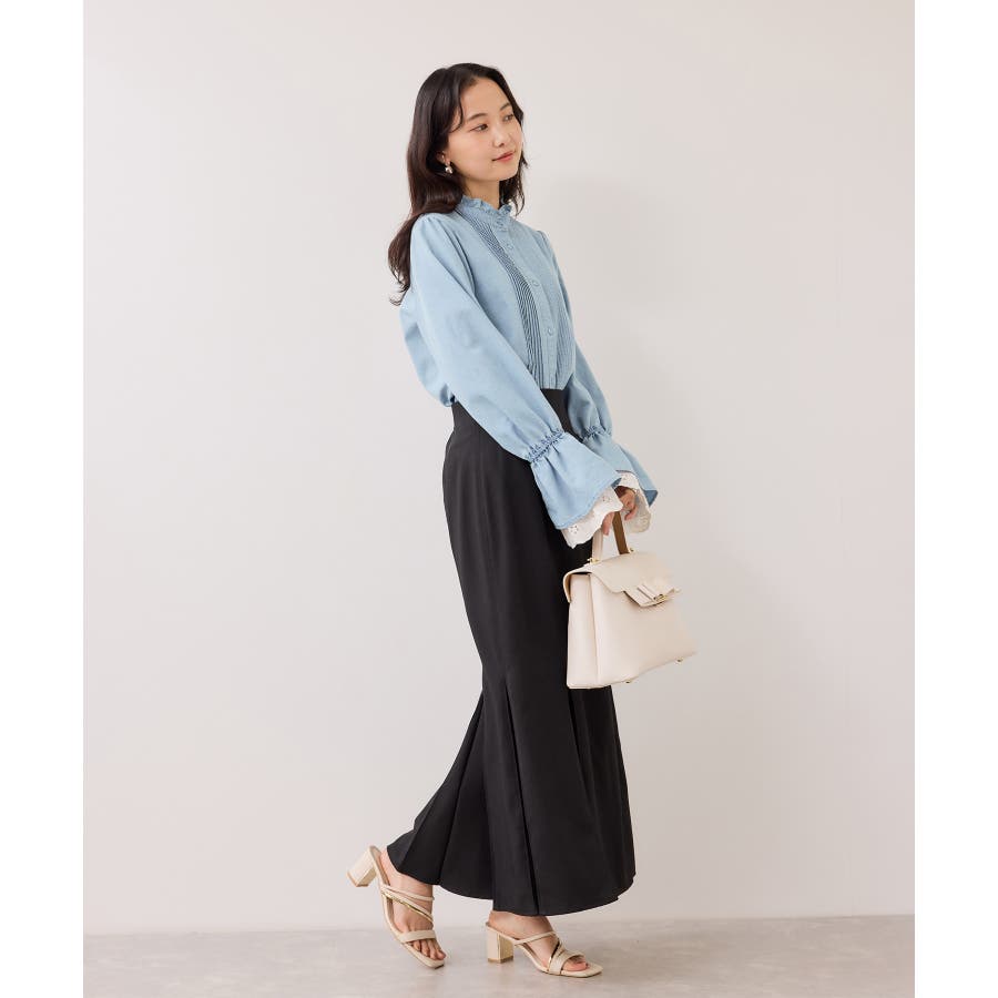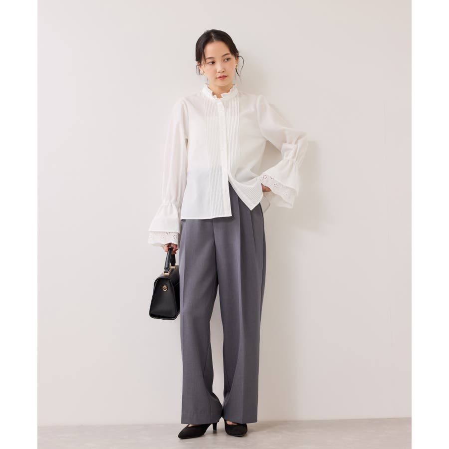 1枚で華やかなブラウスなので、ベーシックボトムとの相性◎です。