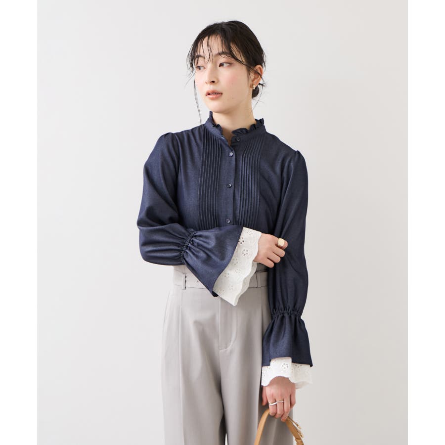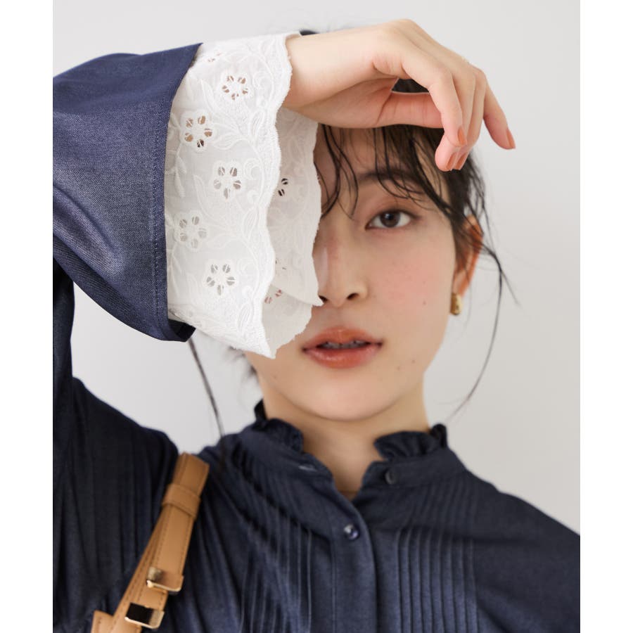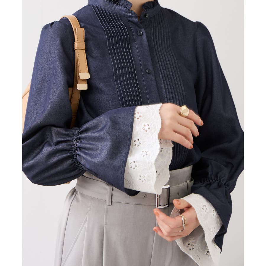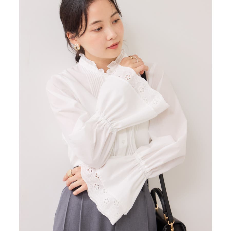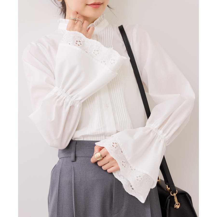 レースのレイヤードスリーブが春らしくアクセントになるデザインブラウス。