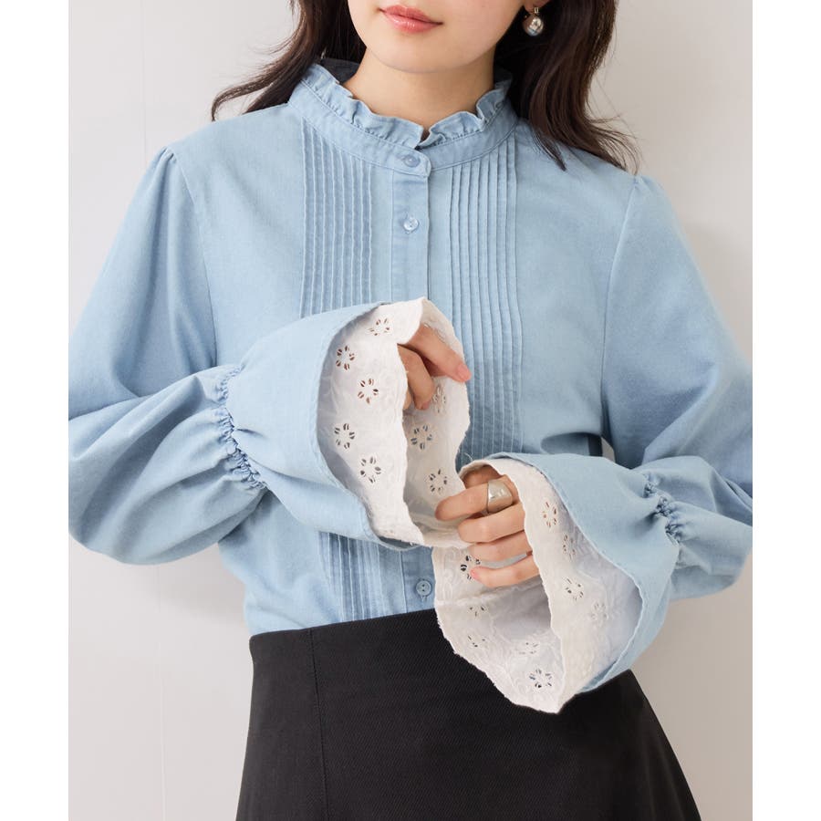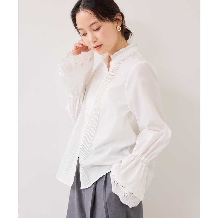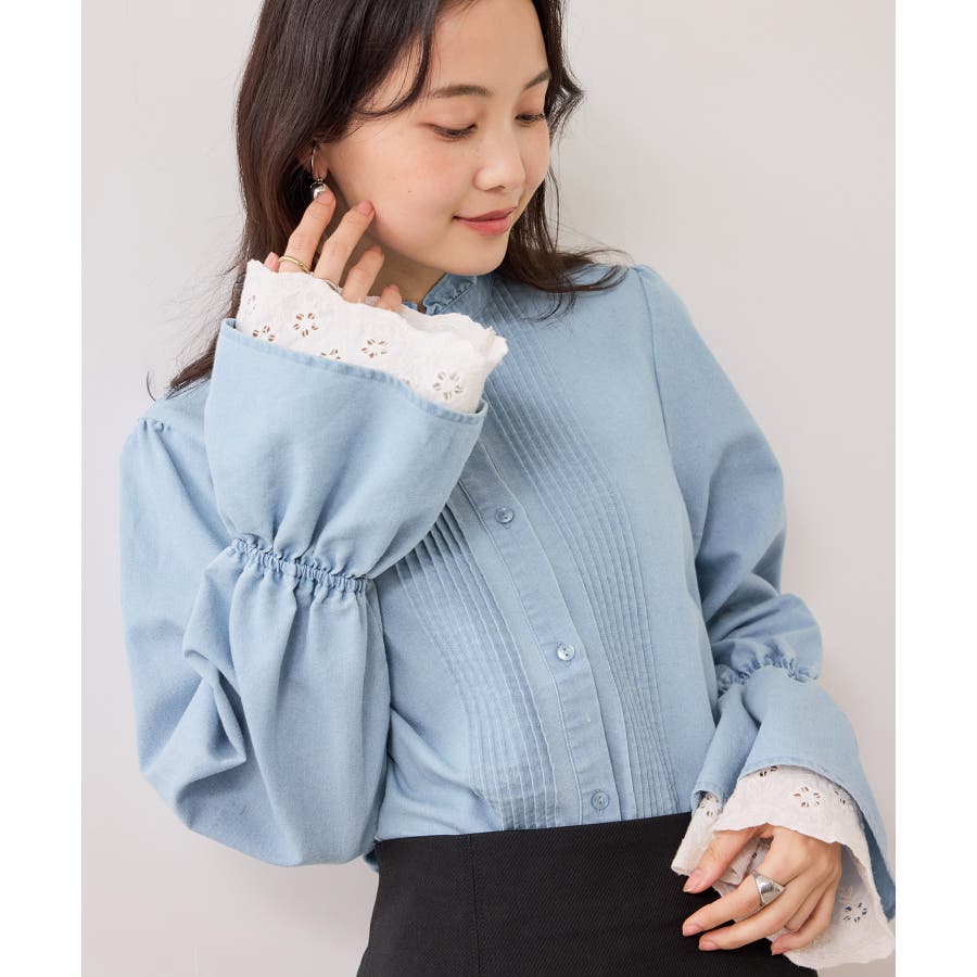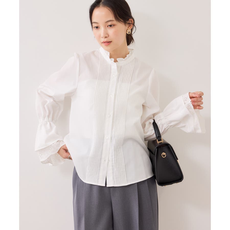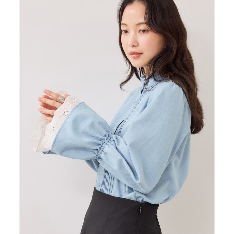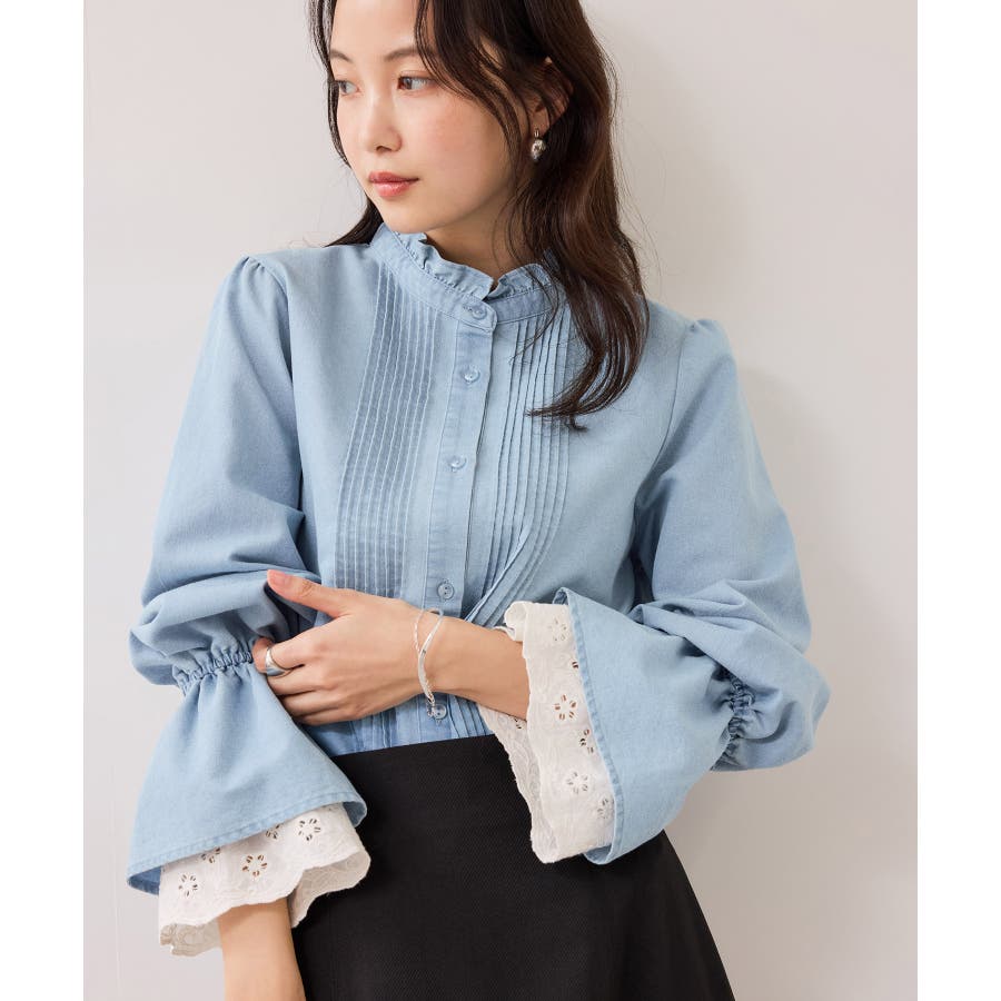レースのレイヤードスリーブが春らしくアクセントになるデザインブラウス。