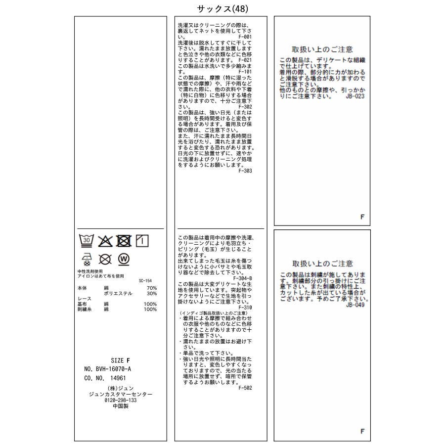 サックス(48):(本体) 綿 70% ポリエステル 30% (レース) (基布) 綿 100% (刺繍糸) 綿 100%