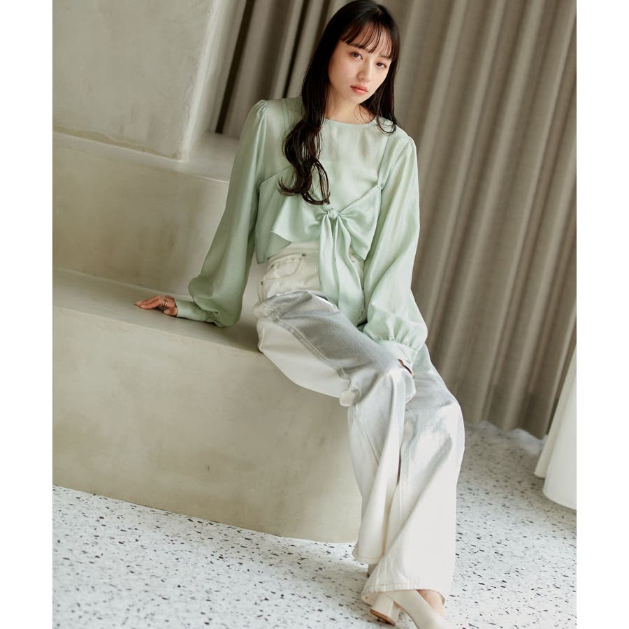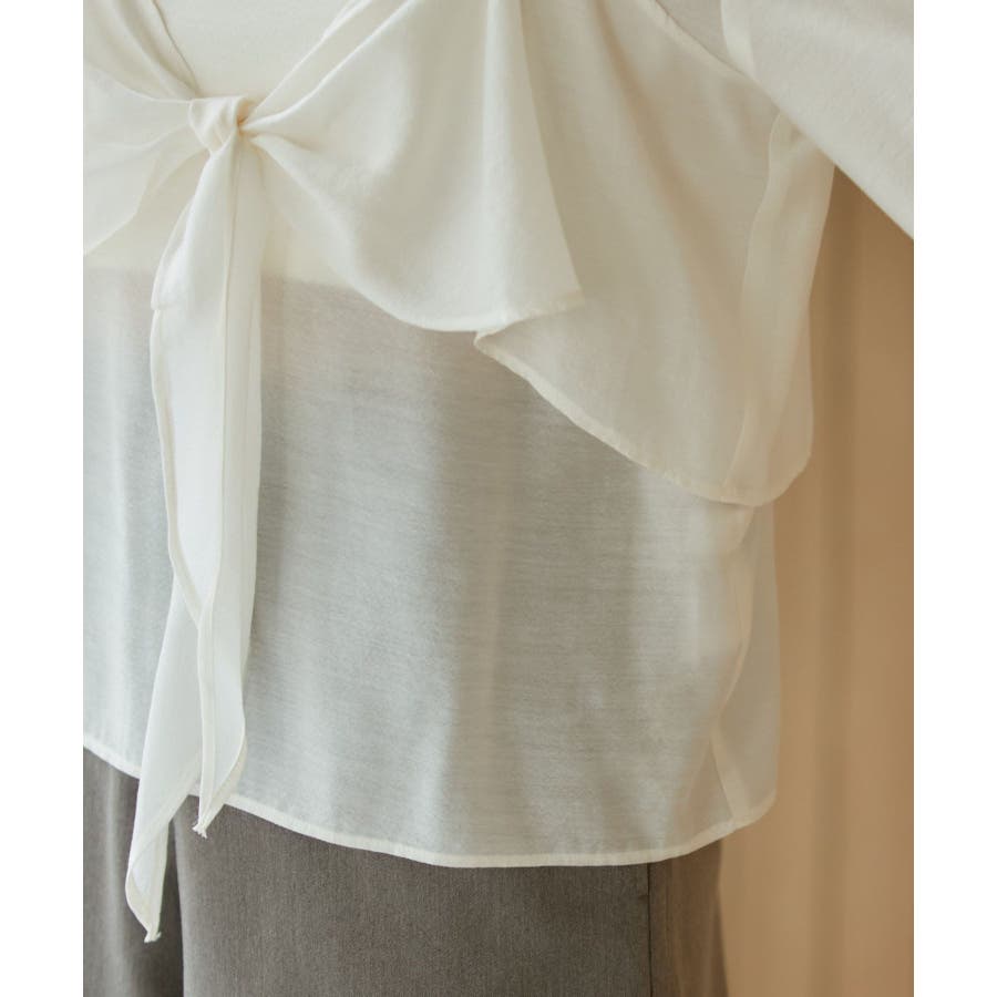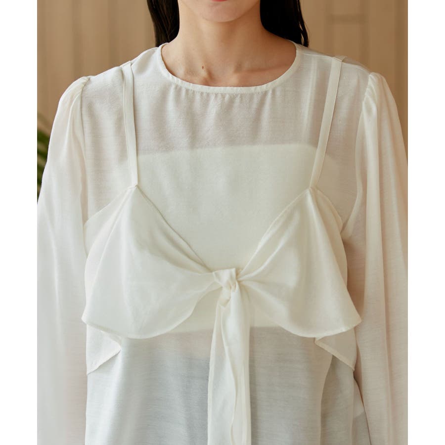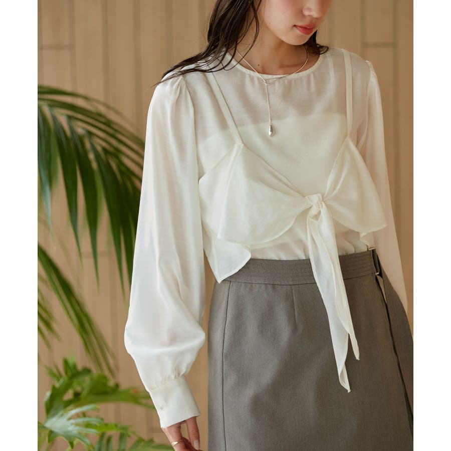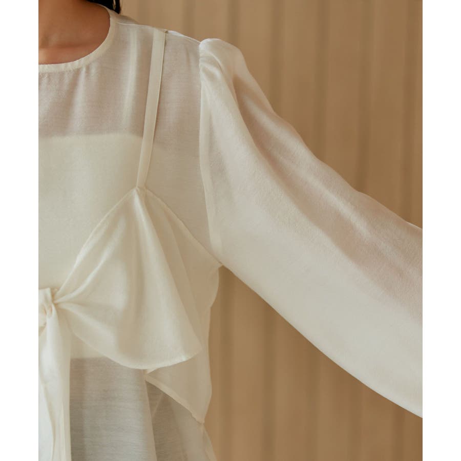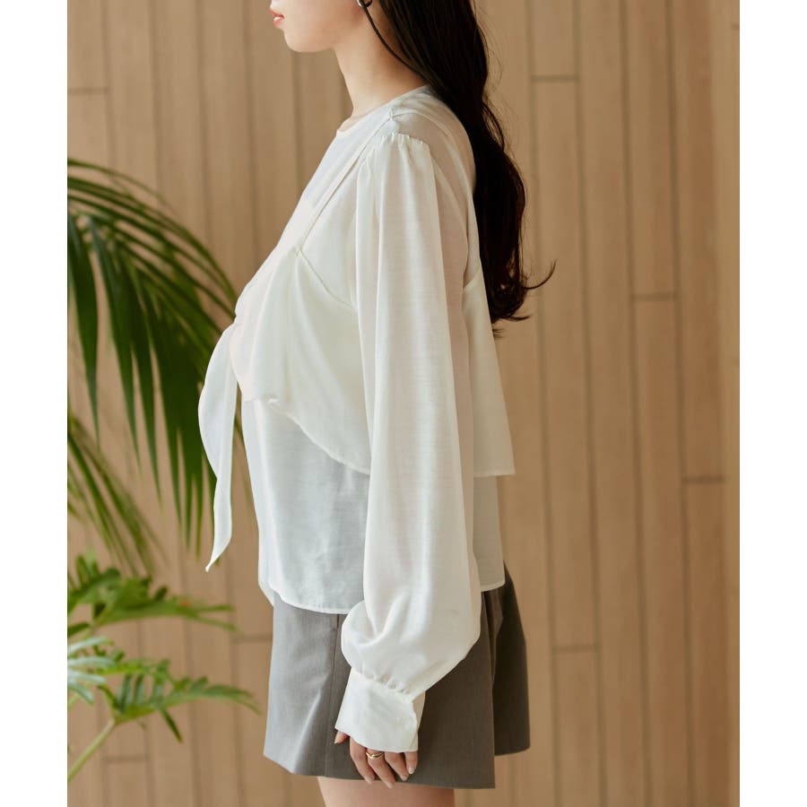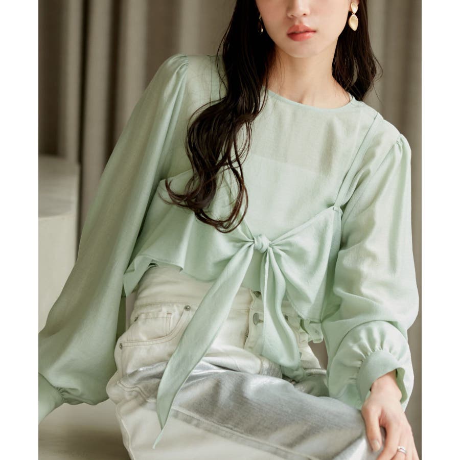 ◆2024春夏◆ 【デザイン・シルエット】 表面感のあるシアー素材が可愛く、簡単にレイヤードスタイルが完結するブラウスです。 同素材のビスチェはフロント部分の結び目がアクセントになります。 袖やフロントにボリュームがあるので、ボトムスにインして着ていただくとバランス◎
