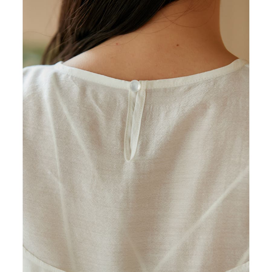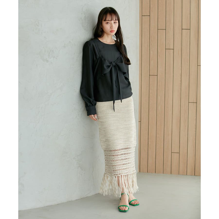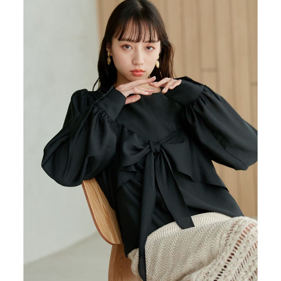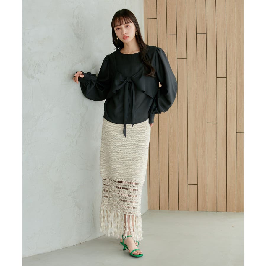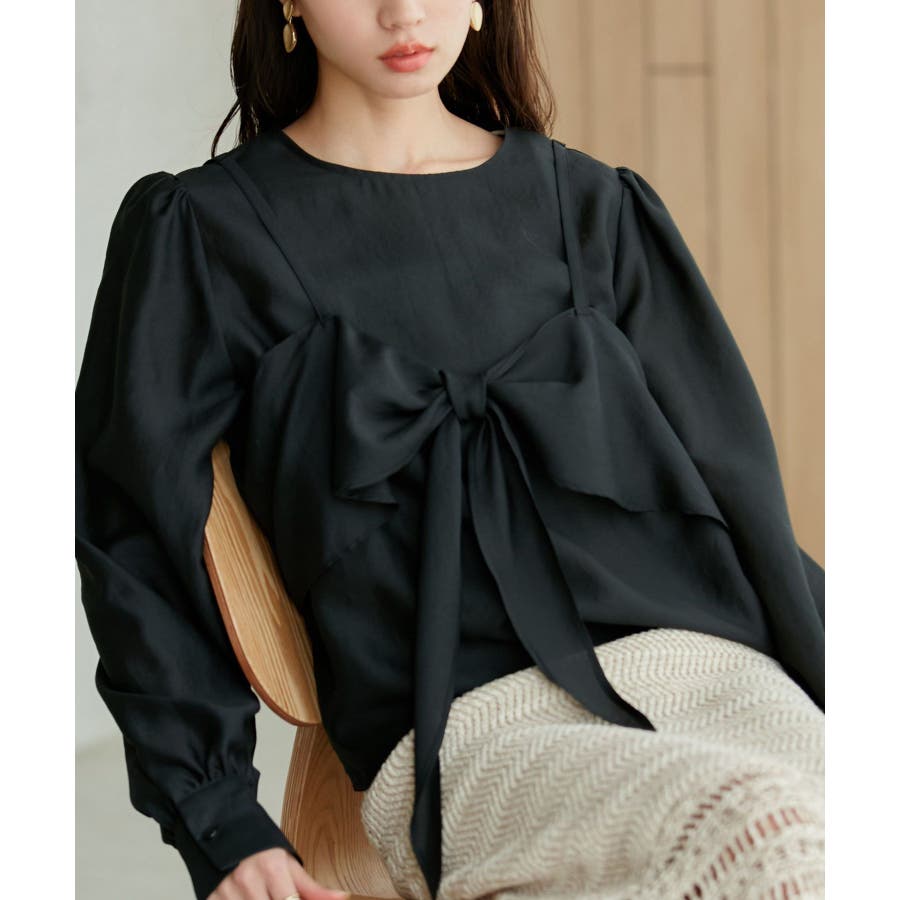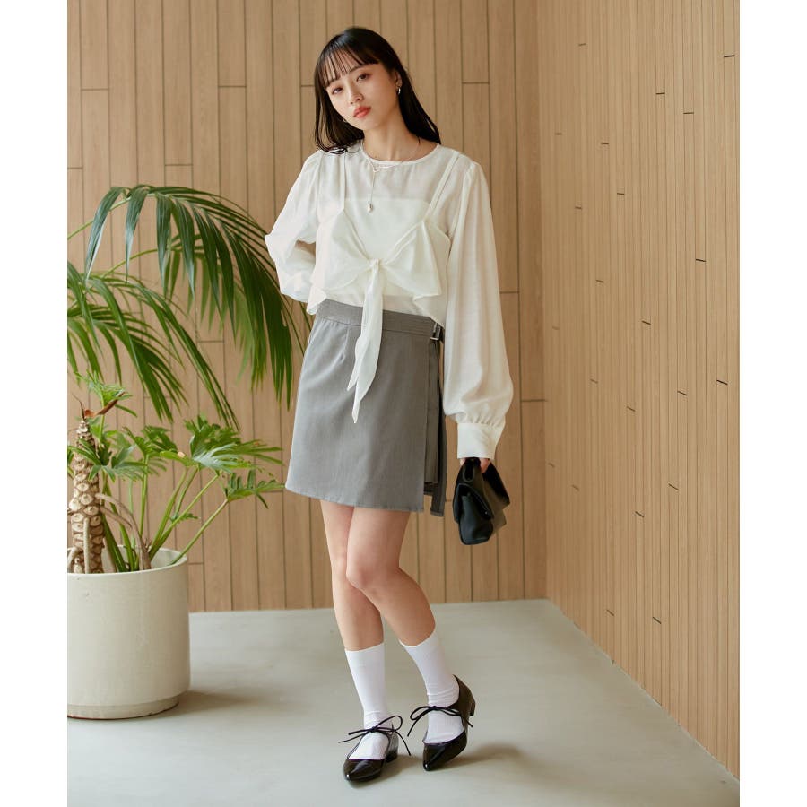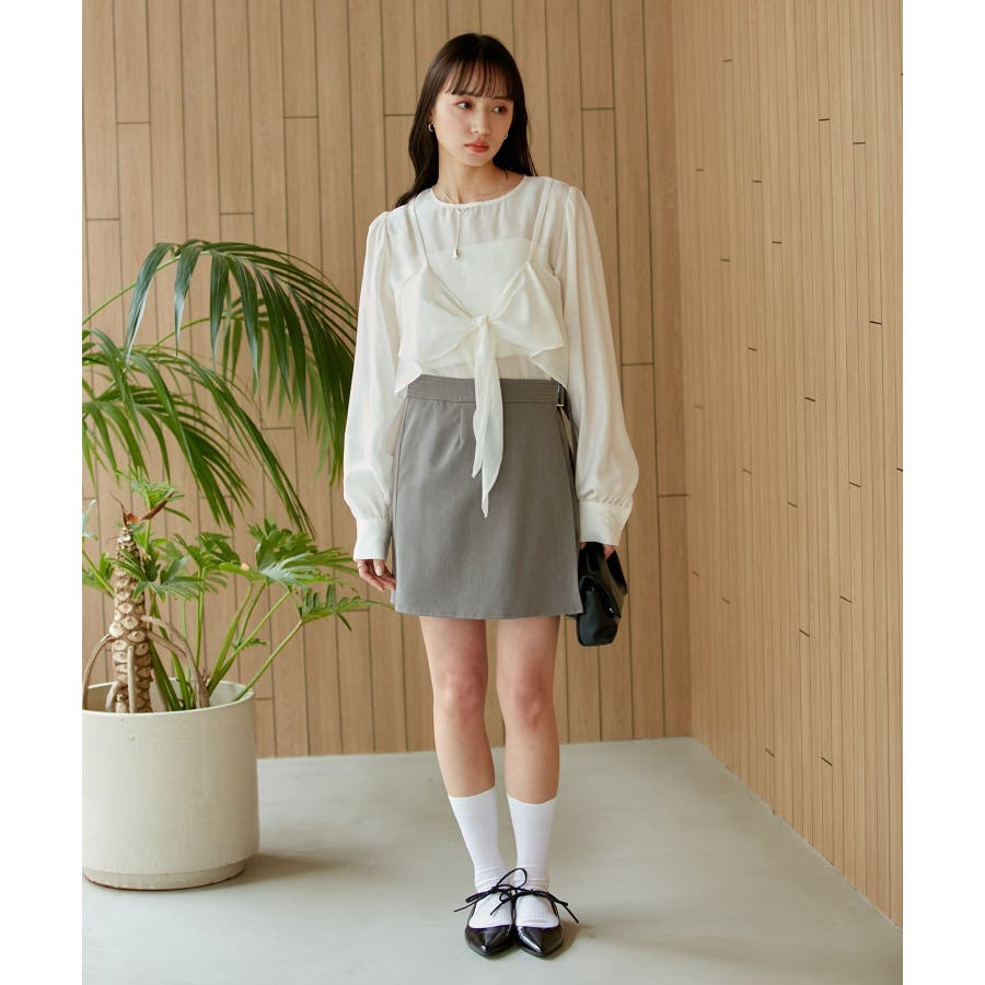 ◆2024春夏◆ 【デザイン・シルエット】 表面感のあるシアー素材が可愛く、簡単にレイヤードスタイルが完結するブラウスです。 同素材のビスチェはフロント部分の結び目がアクセントになります。 袖やフロントにボリュームがあるので、ボトムスにインして着ていただくとバランス◎