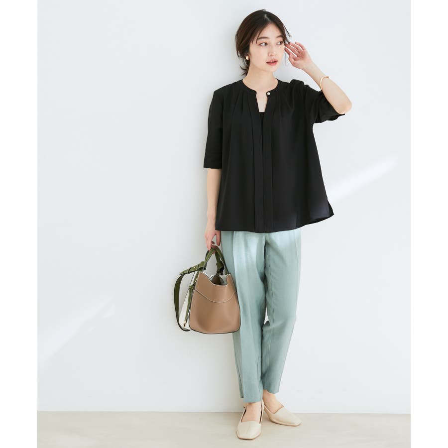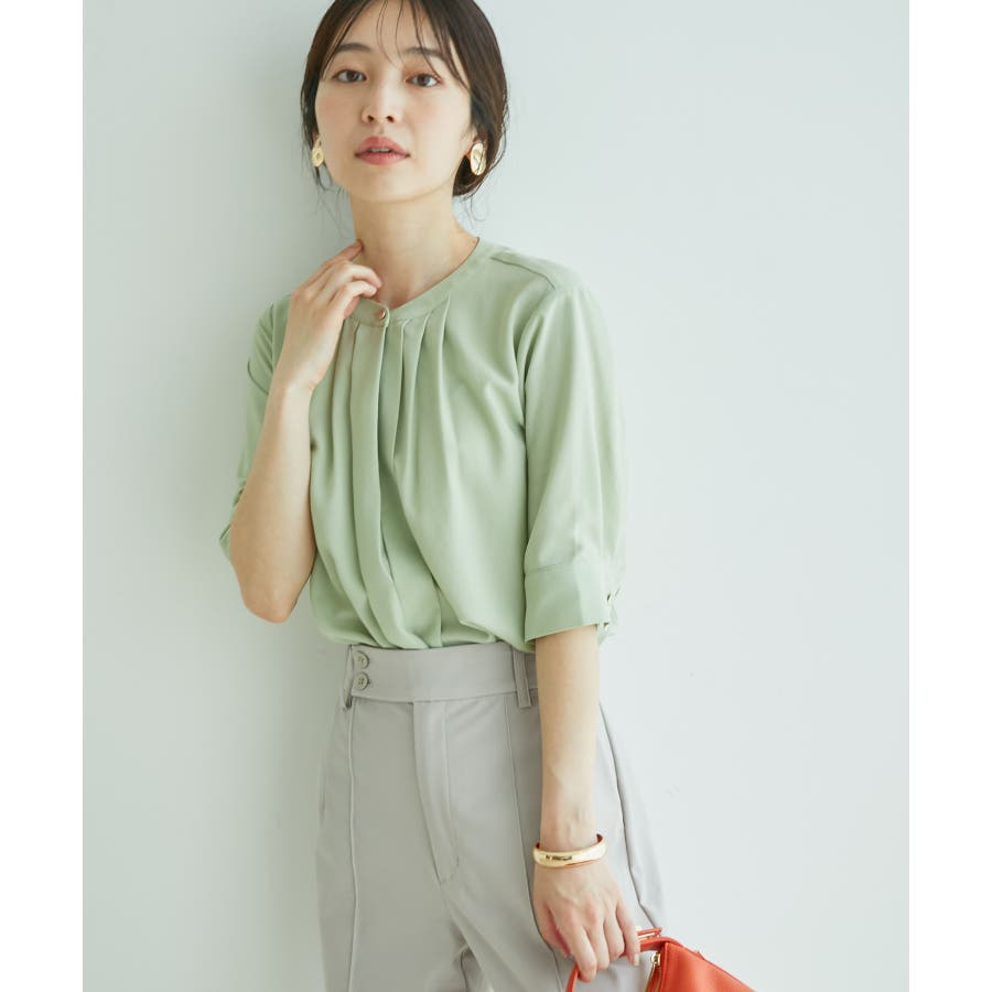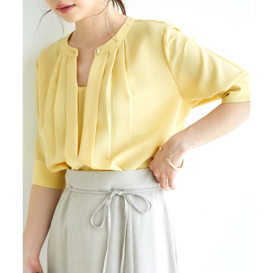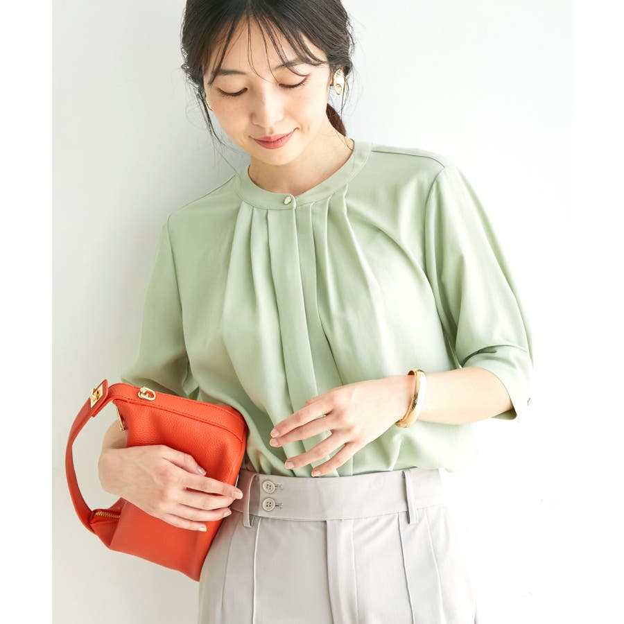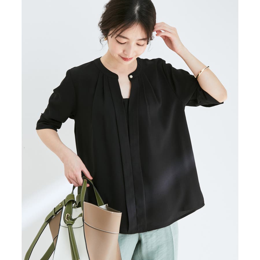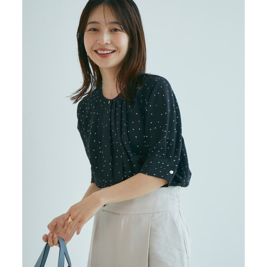 【デザイン・シルエット】 フロントタックで立体感を出したシンプルデザインのブラウス。 安心感のある5分袖は、同時に上品さも持ち合わせていてどんなシーンにも活躍するアイテム。 ゆったりとした身頃でボディラインを拾いにくく、幅広い体型の方に着用いただけるアイテムです。 フロントのメタルボタンを外して、すっきりとしたスキッパータイプにもなる2WAY仕様。 胸元にはあて布があるので、インナーを気にせず着用できます。 ■同シリーズの長袖バージョンもございます! 品番:BVH23010・BVH42010 ■5分袖の他カラーもチェック! 品番:BVH23020 【素材】 再生ポリエステルを使用たサステナブルな素材です。 軽く、濃いカラーは透け感もないので一枚でも着られて快適な着心地です。 またイージーケア機能付きでお手入れが簡単なのも嬉しいポイントです。 【カラー】 オフィススタイルも決まるベーシックで色鮮やかなカラー展開。 花柄、ラベンダーは今シーズンの新色です! ※col,40(ネイビー)はジャドール限定カラー、col,33(ミントグリーン)はWEB限定カラーとなります。 ※在庫なしのカラーは完売しており再入荷の予定はありません。 【おすすめのスタイリング】 一枚でも華やかで着映えしますが、ジャケットやカーディガンのインナーとしてもロングシーズン着まわせるのでおすすめです◎ ---------- 透け:白地のみややあり 裏地:なし 伸縮性:なし 光沢感:なし 生地の厚さ:やや薄い ポケット:なし ---------- 【モデル着用サイズ】 メイン画像全色モデル身長:160cm、着用サイズ:M ※画像の商品はサンプルです。 実際の商品と仕様、加工、サイズが若干異なる場合がございます。
