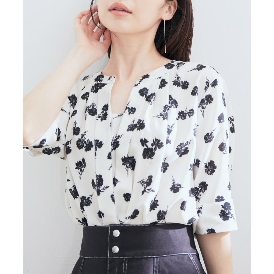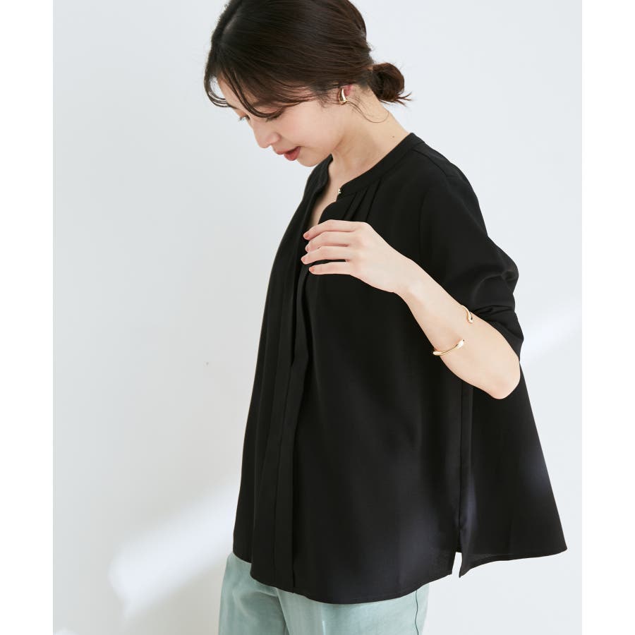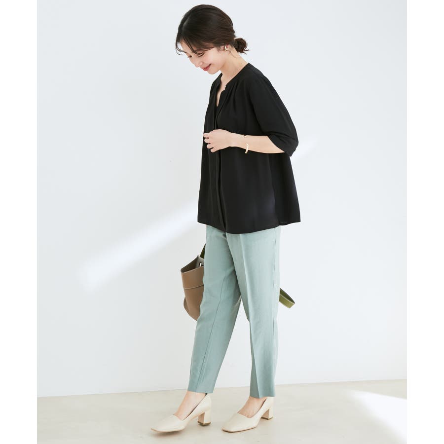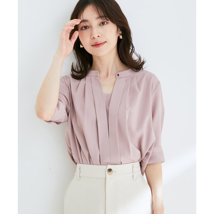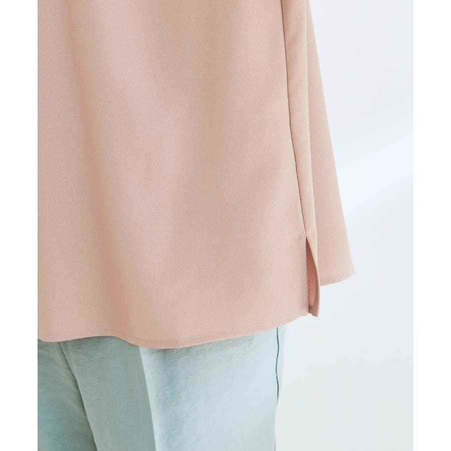 【デザイン・シルエット】 フロントタックで立体感を出したシンプルデザインのブラウス。 安心感のある5分袖は、同時に上品さも持ち合わせていてどんなシーンにも活躍するアイテム。 ゆったりとした身頃でボディラインを拾いにくく、幅広い体型の方に着用いただけるアイテムです。 フロントのメタルボタンを外して、すっきりとしたスキッパータイプにもなる2WAY仕様。 胸元にはあて布があるので、インナーを気にせず着用できます。 ■同シリーズの長袖バージョンもございます! 品番:BVH23010・BVH42010 ■5分袖の他カラーもチェック! 品番:BVH23020 【素材】 再生ポリエステルを使用たサステナブルな素材です。 軽く、濃いカラーは透け感もないので一枚でも着られて快適な着心地です。 またイージーケア機能付きでお手入れが簡単なのも嬉しいポイントです。 【カラー】 オフィススタイルも決まるベーシックで色鮮やかなカラー展開。 花柄、ラベンダーは今シーズンの新色です! ※col,40(ネイビー)はジャドール限定カラー、col,33(ミントグリーン)はWEB限定カラーとなります。 ※在庫なしのカラーは完売しており再入荷の予定はありません。 【おすすめのスタイリング】 一枚でも華やかで着映えしますが、ジャケットやカーディガンのインナーとしてもロングシーズン着まわせるのでおすすめです◎ ---------- 透け:白地のみややあり 裏地:なし 伸縮性:なし 光沢感:なし 生地の厚さ:やや薄い ポケット:なし ---------- 【モデル着用サイズ】 メイン画像全色モデル身長:160cm、着用サイズ:M ※画像の商品はサンプルです。 実際の商品と仕様、加工、サイズが若干異なる場合がございます。