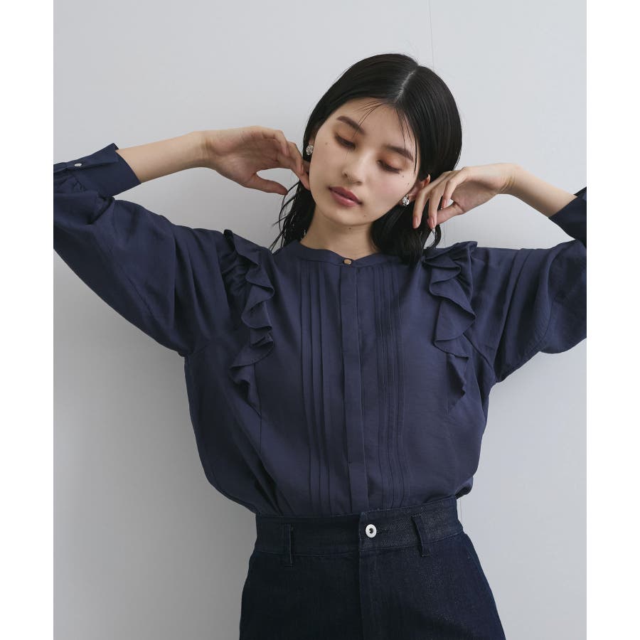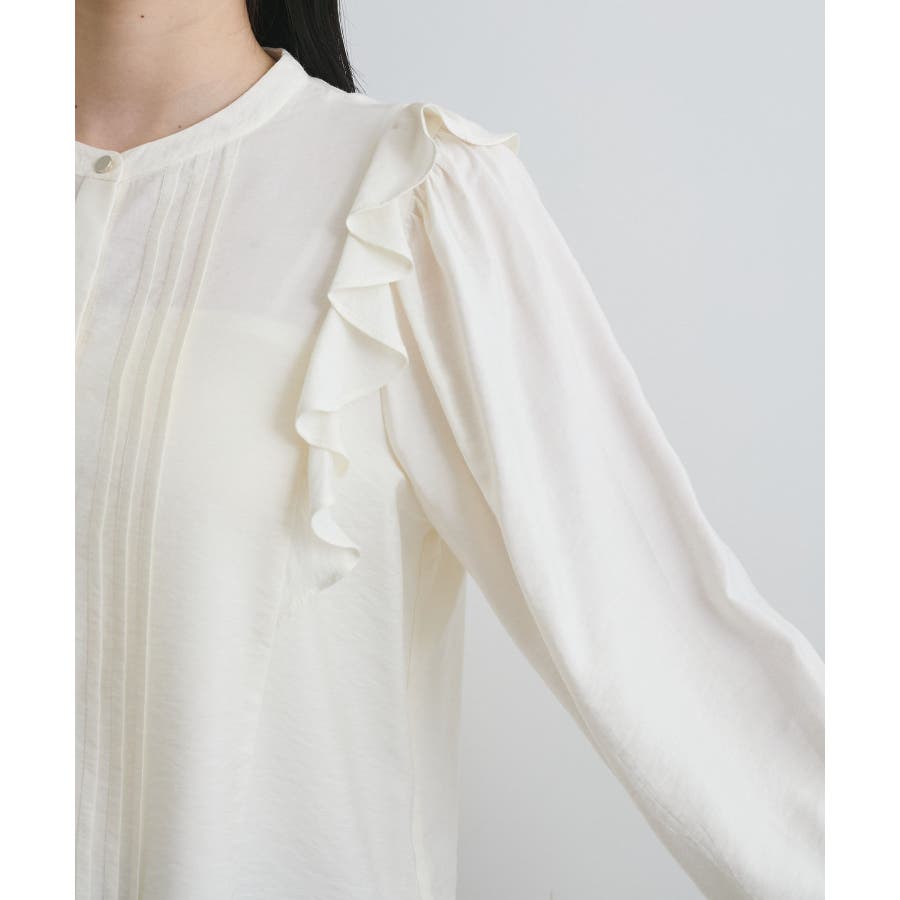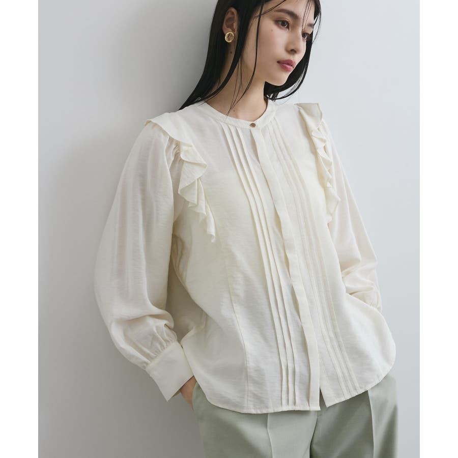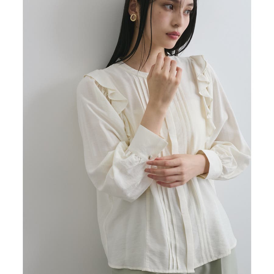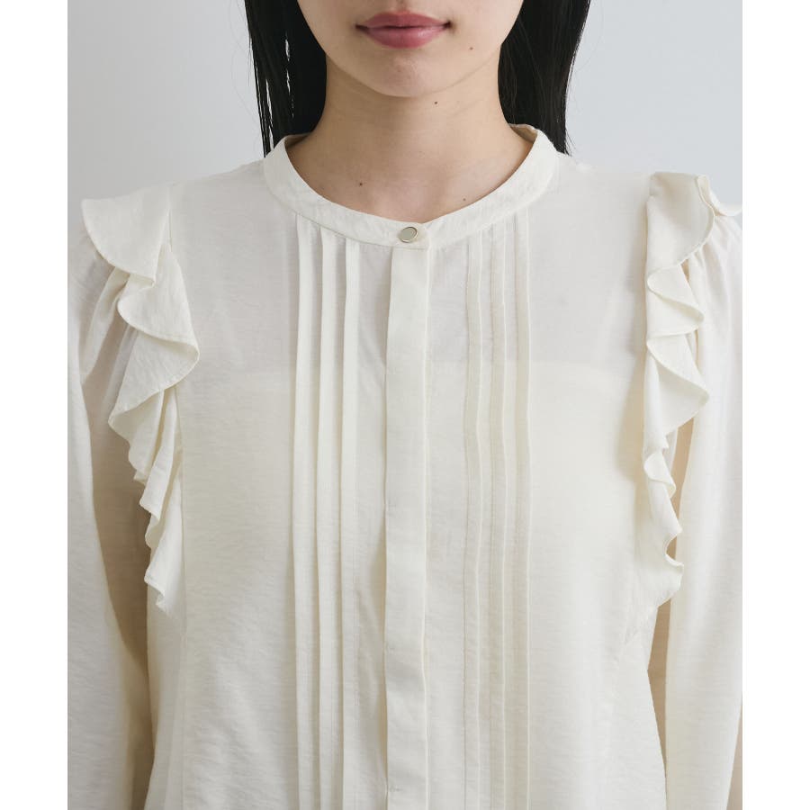 大きすぎないすっきりとしたシルエットで、フロントのピンタックとフリルがポイント。