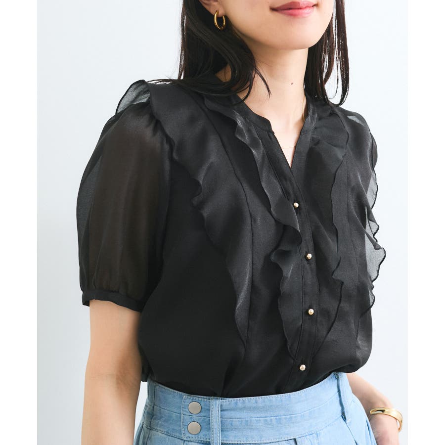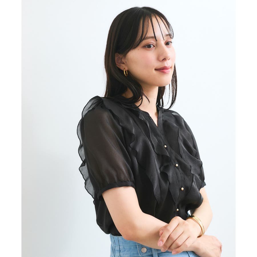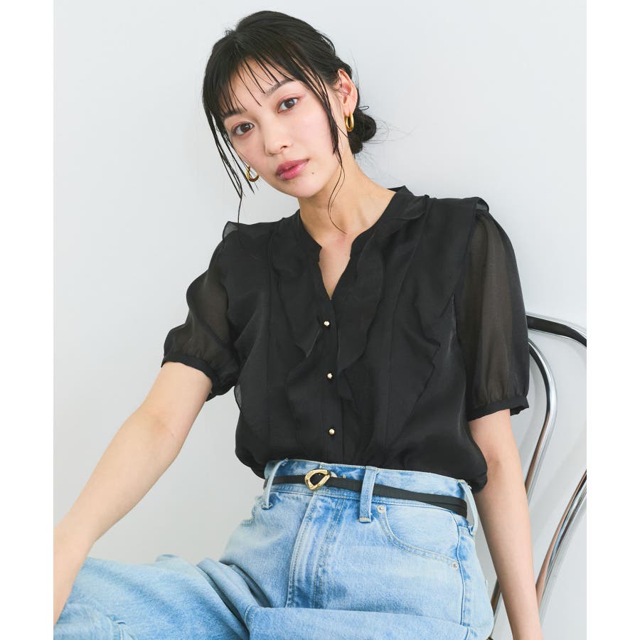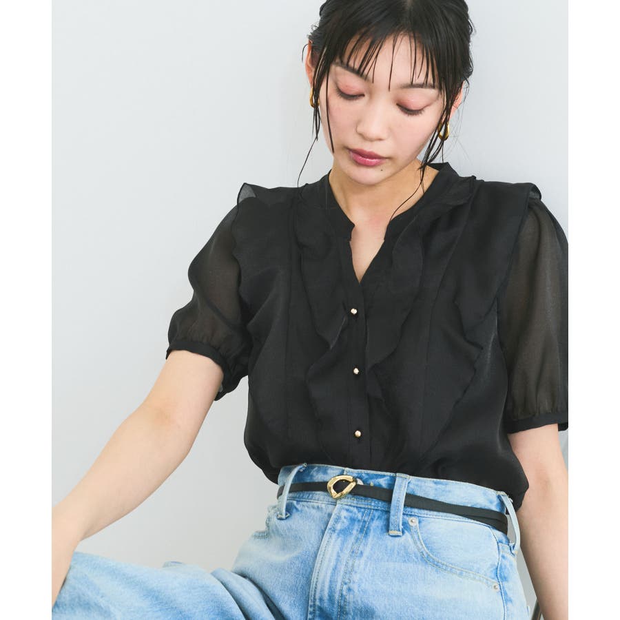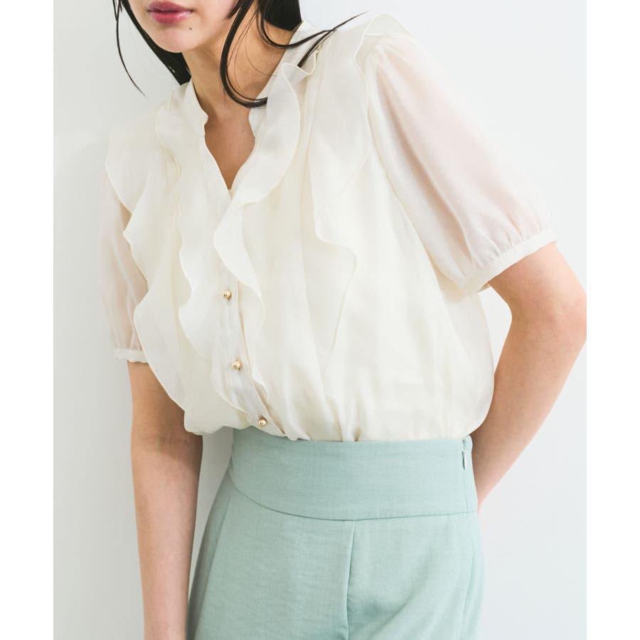 ・ひらりとしたシアーフリルがフェミニンな雰囲気を引き立たせるブラウス。