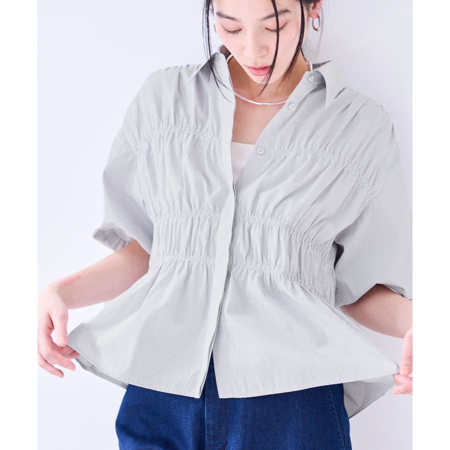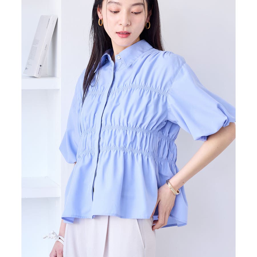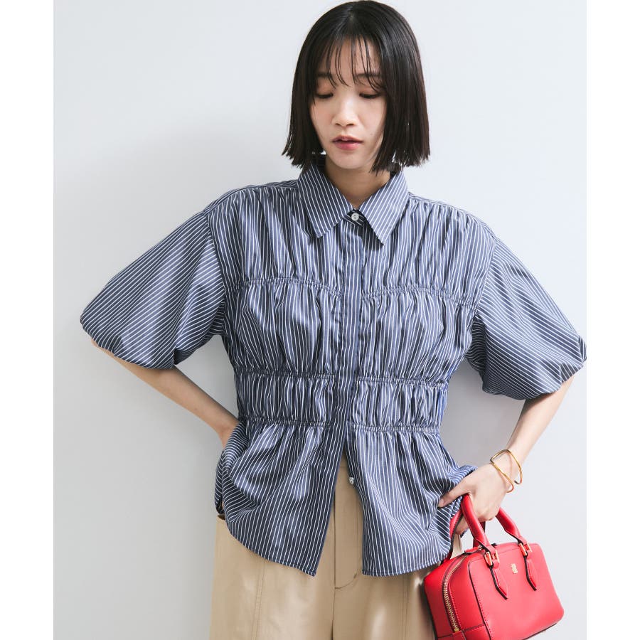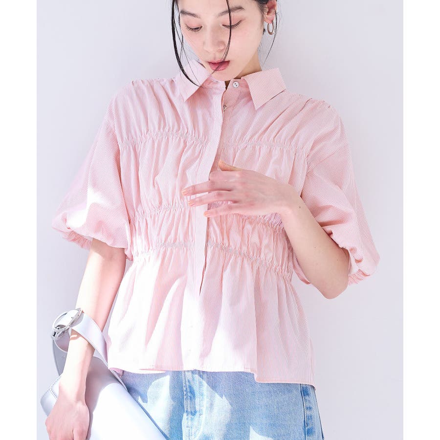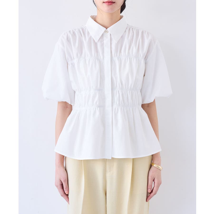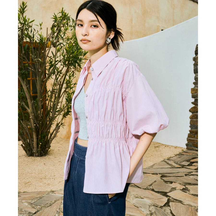 ・シャツを土台にビスチェ風のシャーリングを施した今年らしいデザインシャツ。